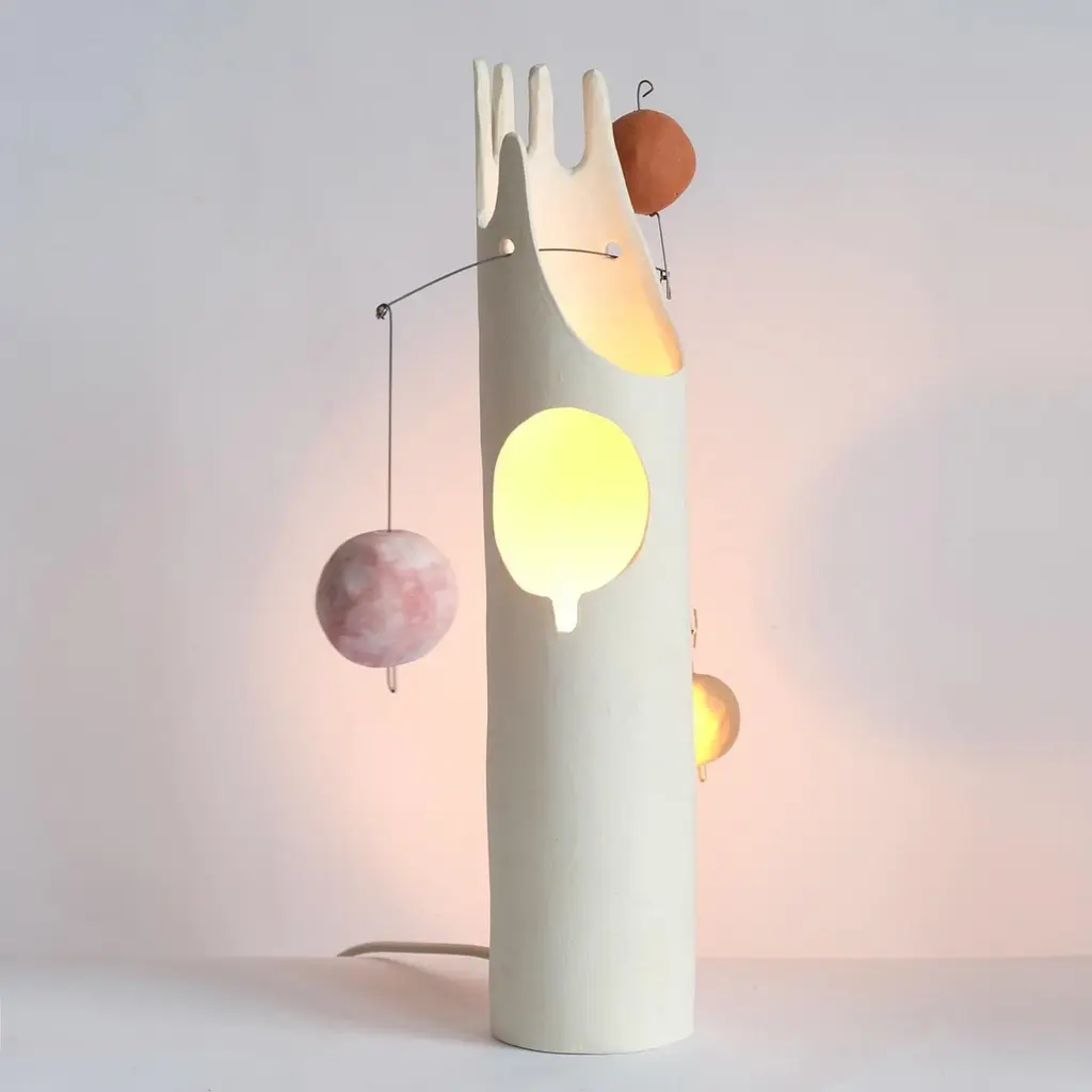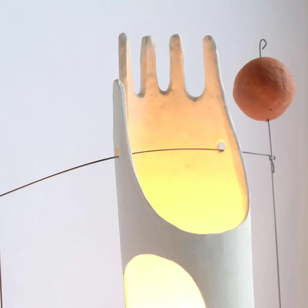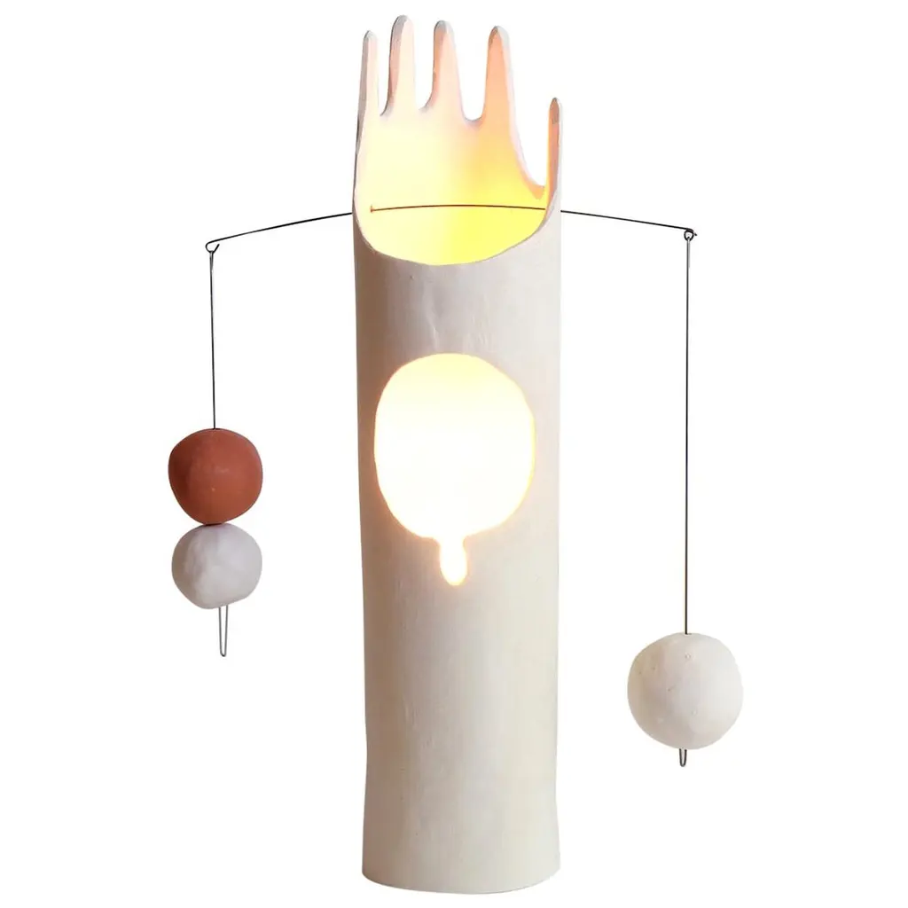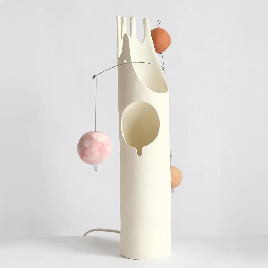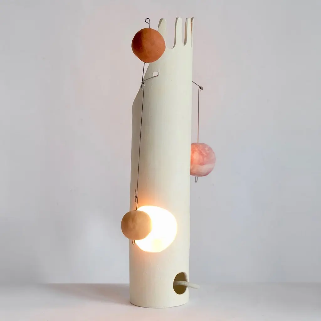 Nico's Cousin Mico is a contemporary hand-built sculptural ceramic table lamp that inspires the joy of working with hands through unpacking, assembling and balancing weights. The handmade ceramic globes and the hanging steel wire come fit right inside the belly of the hand-shaped base. The owner can easily change the wire components and the number and the color of the globes to reflect a change of seasons, interior decors or taste. Component dimensions & weightBody: 3 lbs / 1.4 kgCord: 8 feet / 245 cmMaterialsBody: a handmade ceramic base and a socket cover in a warm-white matte glaze, hollow handmade ceramic globes in a white matte glaze, unglazed terracotta clay, and colored clay in a matte finish, and steel wireHardware: an off-white nylon-covered cord, a white in-line on-off switch, a white plug, brushed brass hardware, and electrical componentsLight source1 x E-12 candelabra base, 60W max15W lamp included Compatible with LED replacement lamps.
