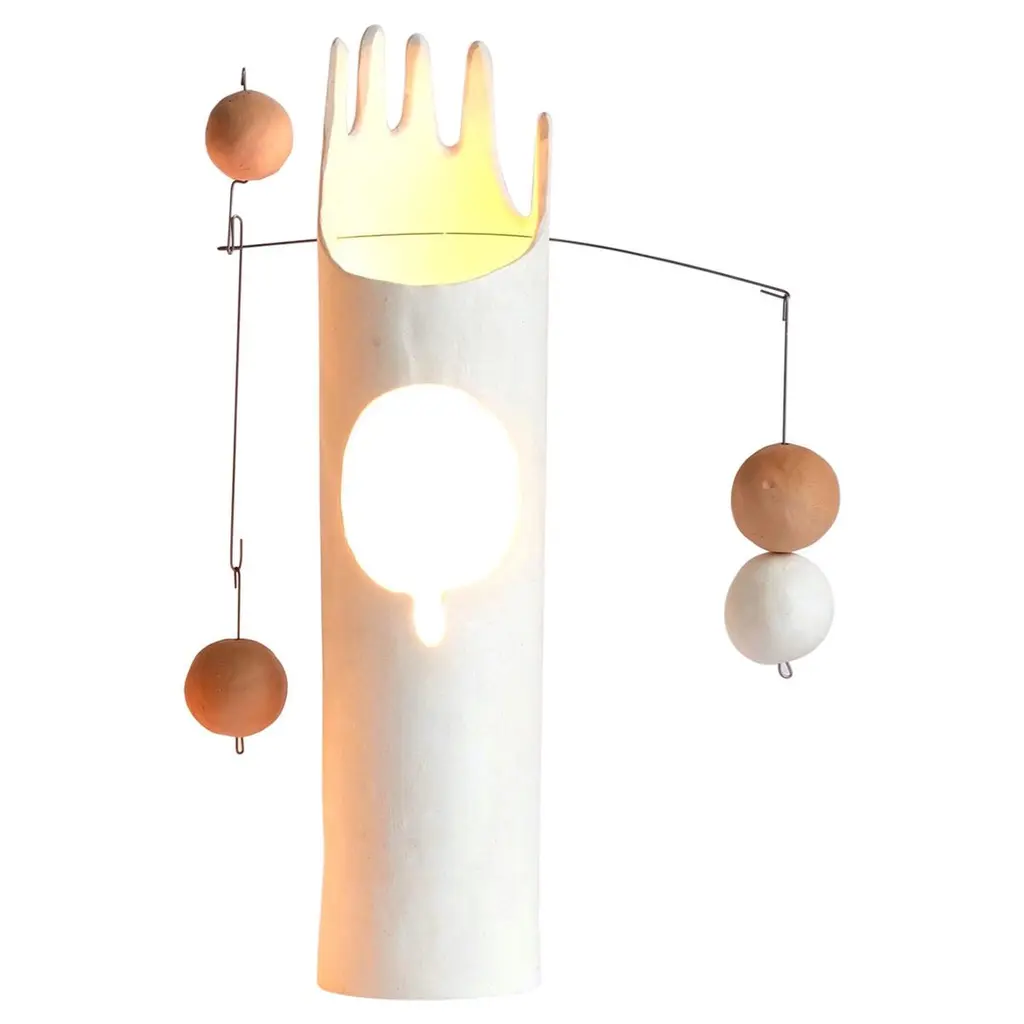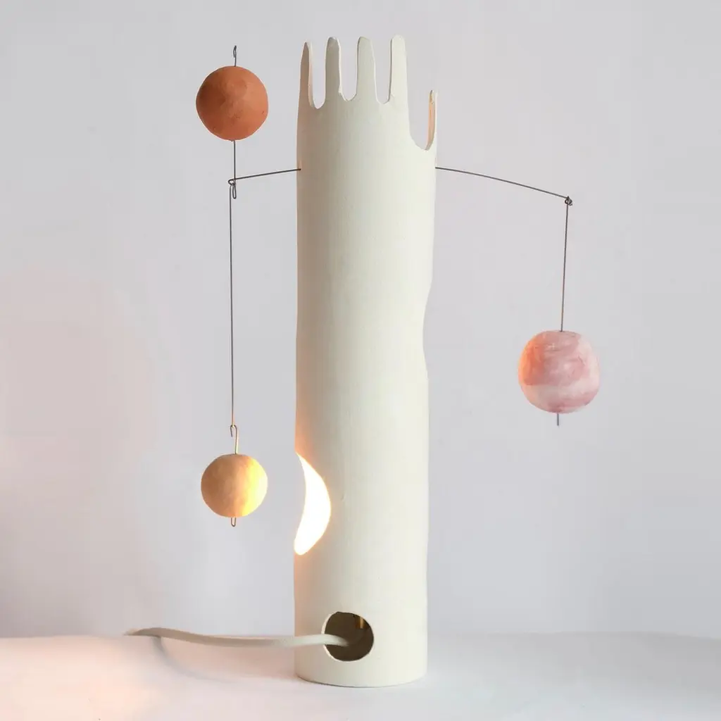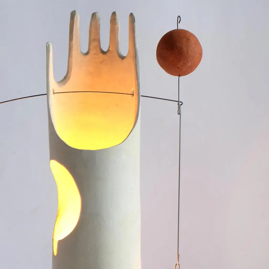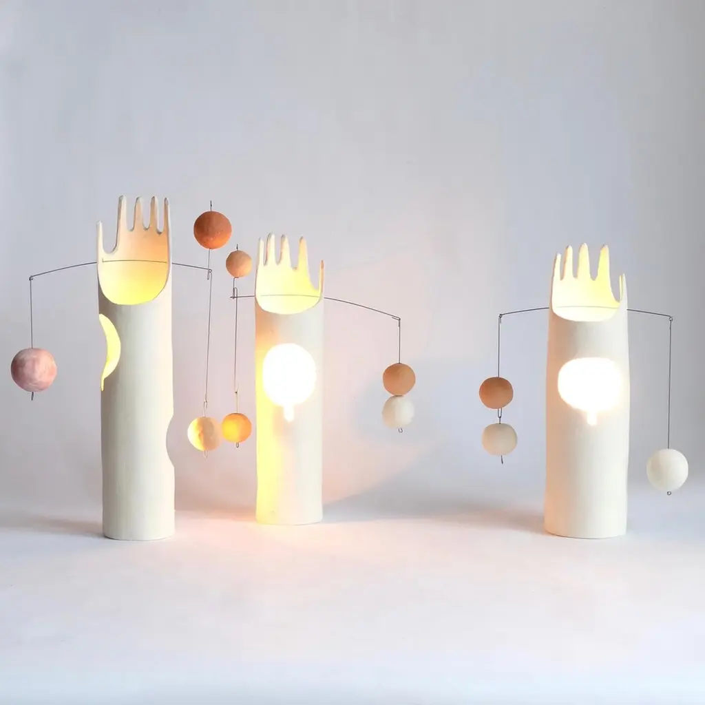 Nico's Cousin Mico is a contemporary hand-built sculptural ceramic table lamp that inspires the joy of working with hands through unpacking, assembling and balancing weights. The handmade ceramic globes and the hanging steel wire come fit right inside the belly of the hand-shaped base. The owner can easily change the wire components and the number and the color of the globes to reflect a change of seasons, interior decors or taste. Component dimensions & weightBody: 3 lbs / 1.4 kgCord: 8 feet / 245 cmMaterialsBody: a handmade ceramic base and a socket cover in a warm-white matte glaze, hollow handmade ceramic globes in a white matte glaze, unglazed terracotta clay, and colored clay in a matte finish, and steel wireHardware: an off-white nylon-covered cord, a white in-line on-off switch, a white plug, brushed brass hardware, and electrical componentsLight source1 x E-12 candelabra base, 60W max15W lamp included Compatible with LED replacement lamps.