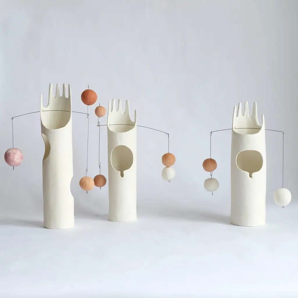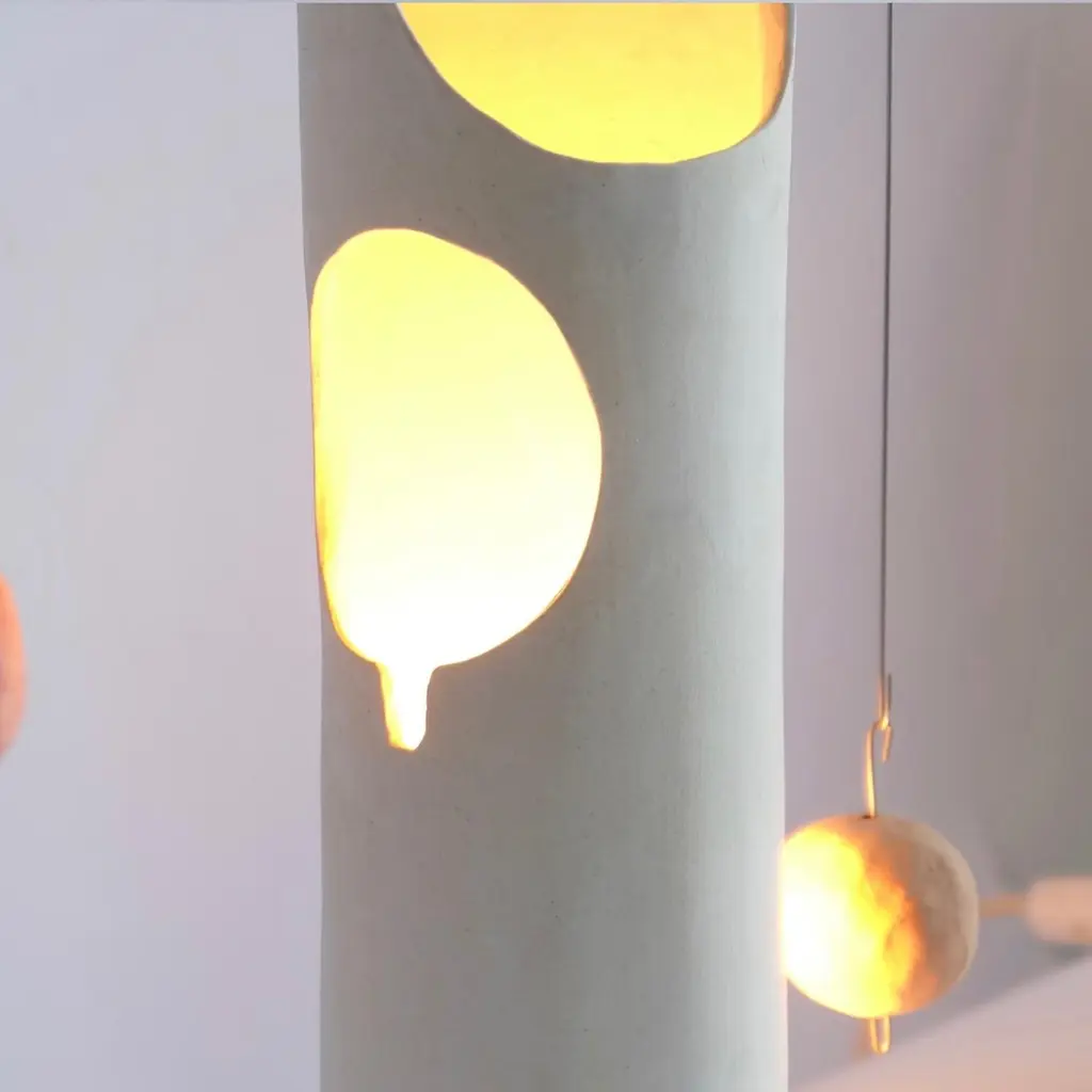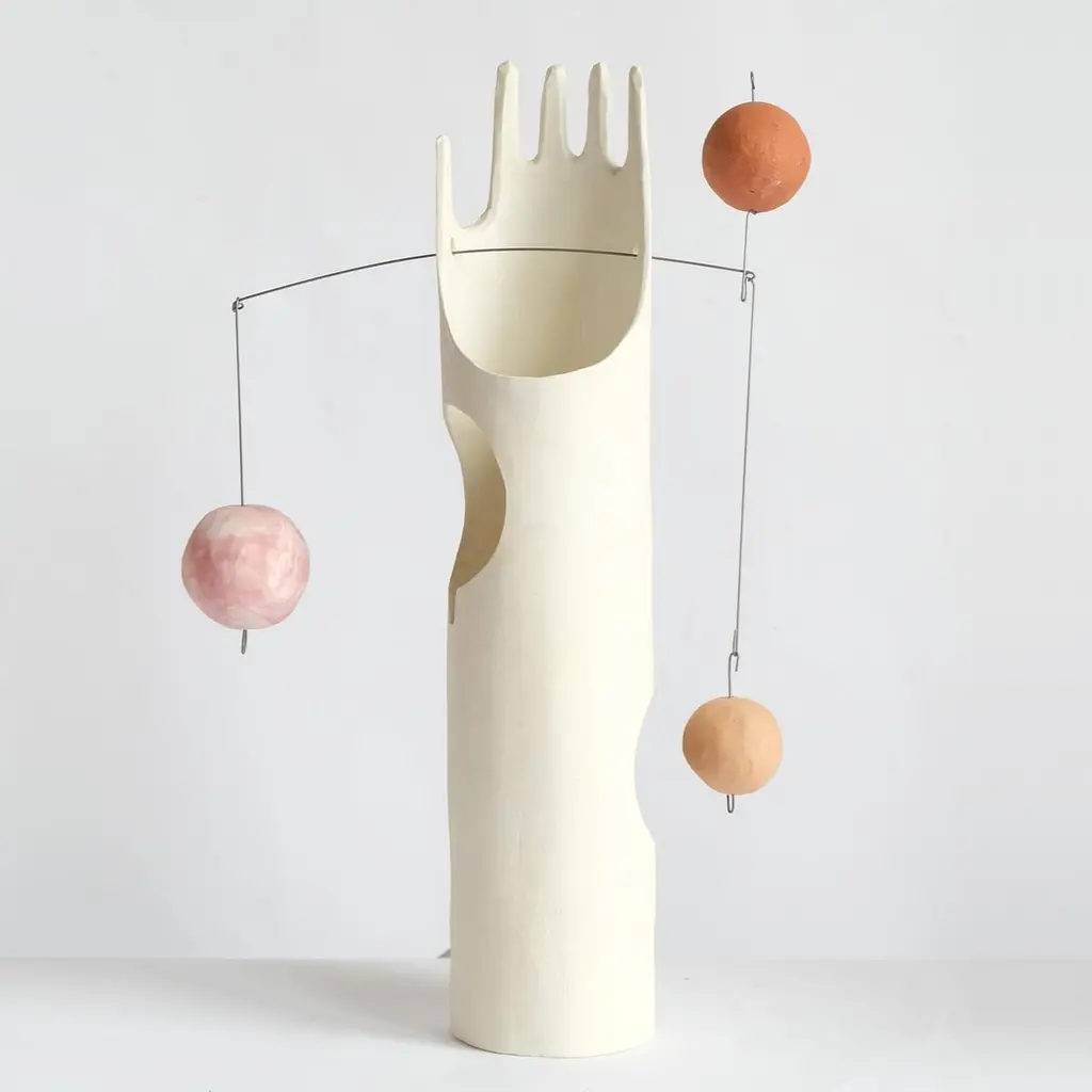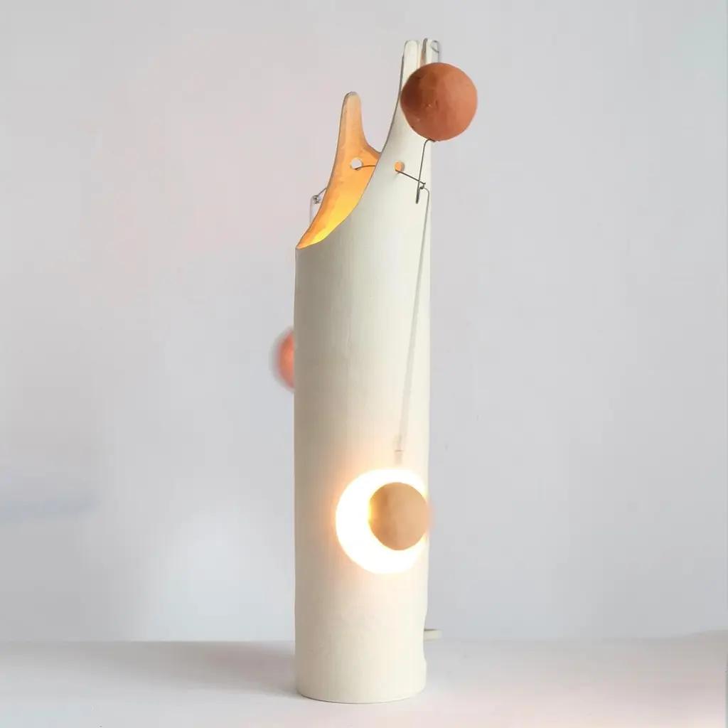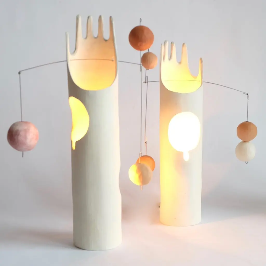 Nico's Cousin Mico is a contemporary hand-built sculptural ceramic table lamp that inspires the joy of working with hands through unpacking, assembling and balancing weights. The handmade ceramic globes and the hanging steel wire come fit right inside the belly of the hand-shaped base. The owner can easily change the wire components and the number and the color of the globes to reflect a change of seasons, interior decors or taste. Component dimensions & weightBody: 3 lbs / 1.4 kgCord: 8 feet / 245 cmMaterialsBody: a handmade ceramic base and a socket cover in a warm-white matte glaze, hollow handmade ceramic globes in a white matte glaze, unglazed terracotta clay, and colored clay in a matte finish, and steel wireHardware: an off-white nylon-covered cord, a white in-line on-off switch, a white plug, brushed brass hardware, and electrical componentsLight source1 x E-12 candelabra base, 60W max15W lamp included Compatible with LED replacement lamps.