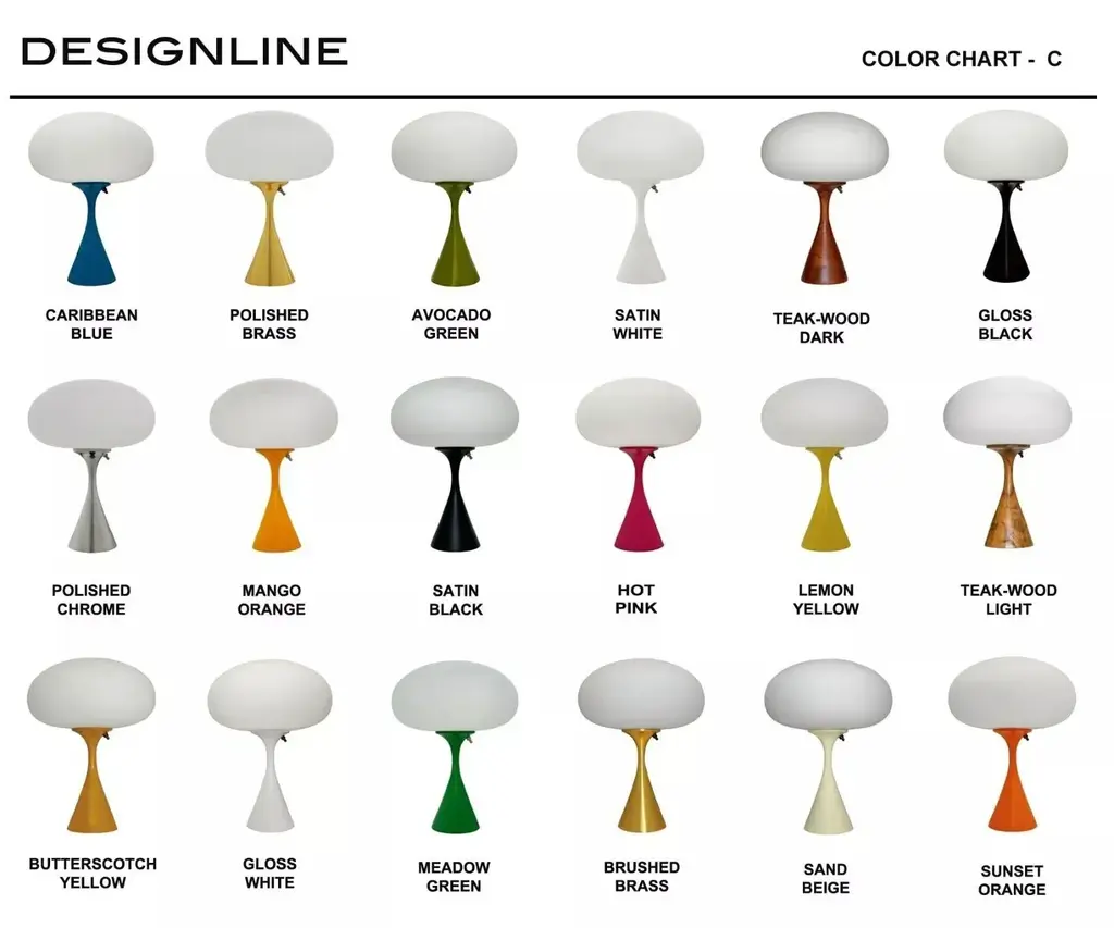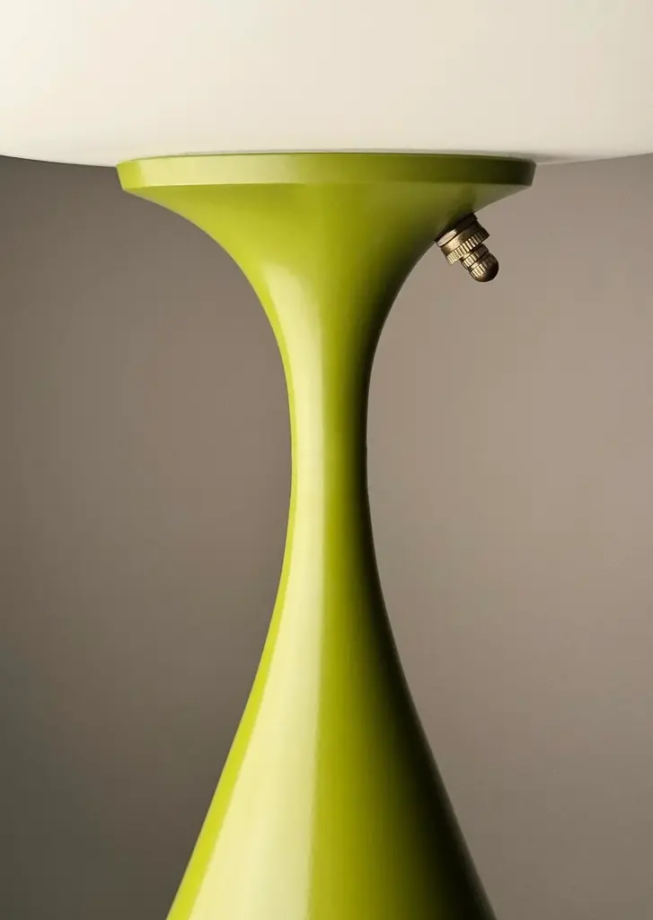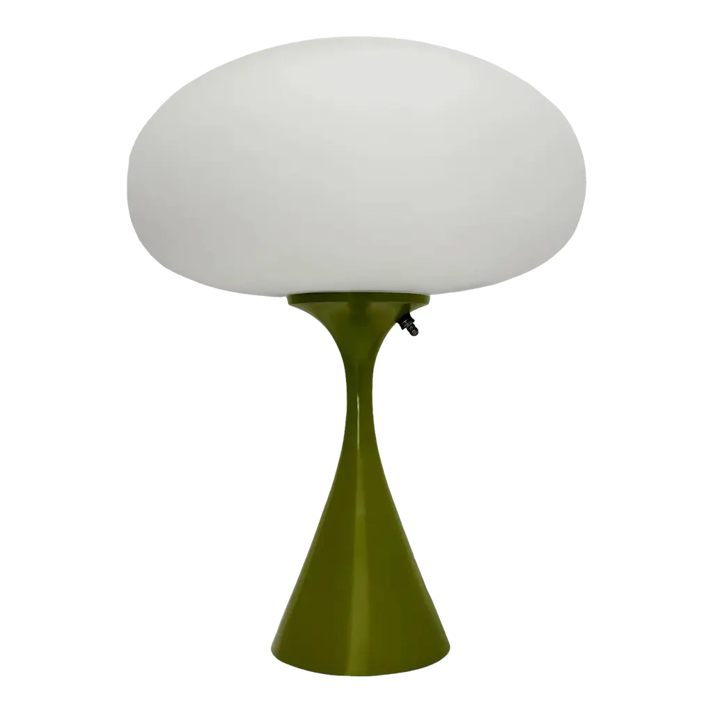 ENJOY FREE CONTINENTAL USA SHIPPING! A sleek stemlite table lamp made by Design Line. It features a cast aluminum main base in a conical form. The lamp base is finished in an avocado green color. The frosted glass lamp shade is hand blown and gives off a soft warm filtered light. It works with one standard bulb up to 100 watts and plugs into a standard US outlet. These retro lamps work with all mid-century modern furniture & decor. Such as classic vintage mcm, art deco, space age, post modern, retro kitsch and contemporary design. Imagine a pair of these lamps used as bedside lamps, on end tables in a living room, or a matching pair on top of a vintage credenza. These lamps will compliment modern furniture from iconic designers like Charles Eames, Eero Saarinen, Harry Bertoia, Paul McCobb, Adrian Pearsall, Verner Panton, Florence Knoll, Joe Columbo, Hans Wegner & Arne Jacobsen. Use a single lamp as an accent lamp on your favorite cabinet or buy one as a funky desk lamp. These are sure to go with modern furniture manufacturers from the past and present. Confidently mix these lamps that fit with brands like Herman Miller, Knoll, Fritz Hansen, Kartell, Artemide, Planner Group, Niels Moller, Maurice Villency, and Thayer Coggin. If you have any question, please don't hesitate to message us.