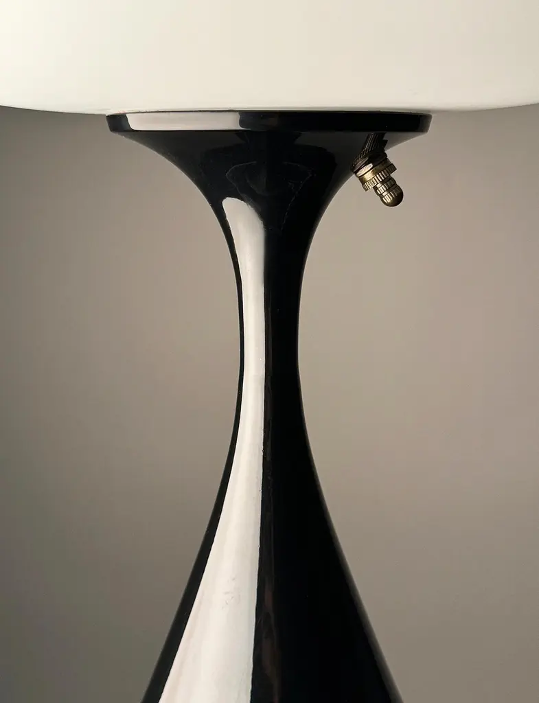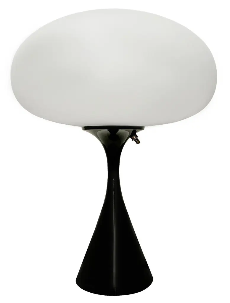 THIS ITEM IS ELIGIBLE FOR FREE SHIPPING!A sleek stemlite table lamp made by Design Line. It features a cast aluminum main base in a conical form. The lamp base is finished in a classic black gloss color. The frosted glass lamp shade is hand blown and gives off a soft warm filtered light. It works with one standard bulb up to 100 watts and plugs into a standard US outlet.These retro lamps work with all mid-century modern furniture & decor. Such as classic vintage mcm, art deco, space age, post modern, retro kitsch and contemporary design. Imagine a pair of these lamps used as bedside lamps, on end tables in a living room, or a matching pair on top of a vintage credenza. These lamps will compliment modern furniture from iconic designers like Charles Eames, Eero Saarinen, Harry Bertoia, Paul McCobb, Adrian Pearsall, Verner Panton, Florence Knoll, Joe Columbo, Hans Wegner & Arne Jacobsen. Use a single lamp as an accent lamp on your favorite cabinet or buy one as a funky desk lamp. These are sure to go with modern furniture manufacturers from the past and present. Confidently mix these lamps that fit with brands like Herman Miller, Knoll, Fritz Hansen, Kartell, Artemide, Planner Group, Niels Moller, Maurice Villency, and Thayer Coggin. If you have any question, please don't hesitate to message us.
