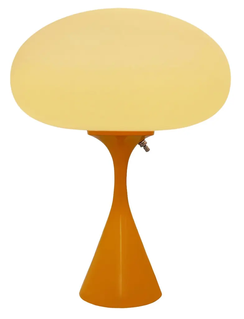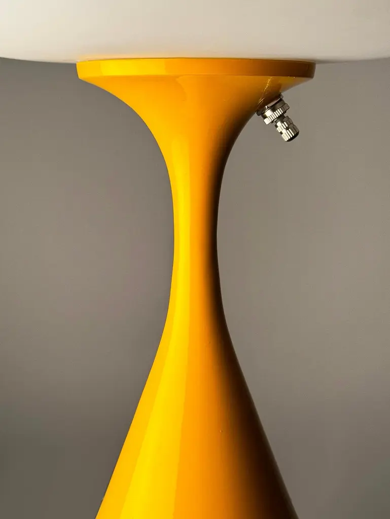 THIS ITEM IS ELIGIBLE FOR FREE SHIPPING!A sleek stemlite table lamp made by Design Line. It features a cast aluminum main base in a conical form. The lamp base is finished in a retro mango orange color. The frosted glass lamp shade is hand blown and gives off a soft warm filtered light. It works with one standard bulb up to 100 watts and plugs into a standard US outlet.These retro lamps work with all mid-century modern furniture & decor. Such as classic vintage mcm, art deco, space age, post modern, retro kitsch and contemporary design. Imagine a pair of these lamps used as bedside lamps, on end tables in a living room, or a matching pair on top of a vintage credenza. These lamps will compliment modern furniture from iconic designers like Charles Eames, Eero Saarinen, Harry Bertoia, Paul McCobb, Adrian Pearsall, Verner Panton, Florence Knoll, Joe Columbo, Hans Wegner & Arne Jacobsen. Use a single lamp as an accent lamp on your favorite cabinet or buy one as a funky desk lamp. These are sure to go with modern furniture manufacturers from the past and present. Confidently mix these lamps that fit with brands like Herman Miller, Knoll, Fritz Hansen, Kartell, Artemide, Planner Group, Niels Moller, Maurice Villency, and Thayer Coggin. If you have any question, please don't hesitate to message us.