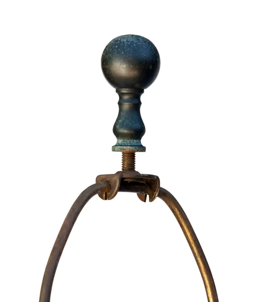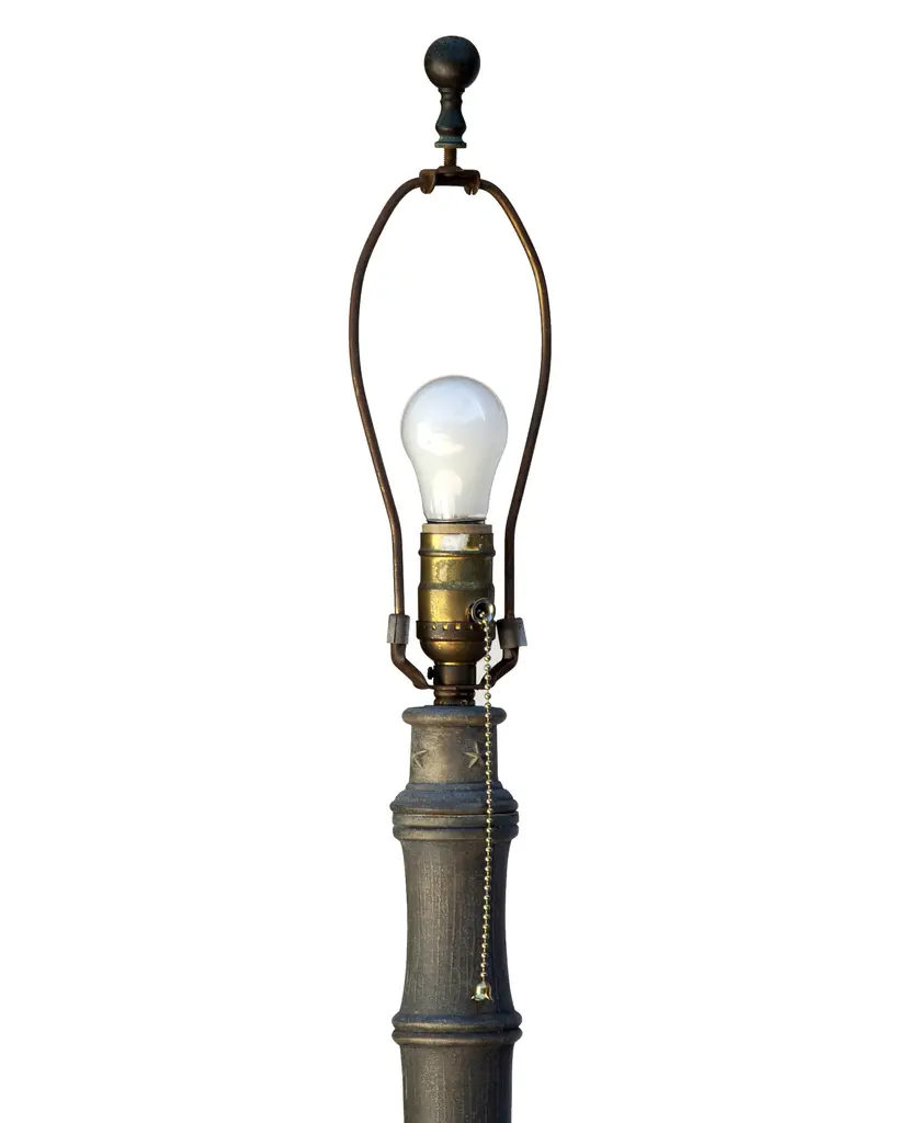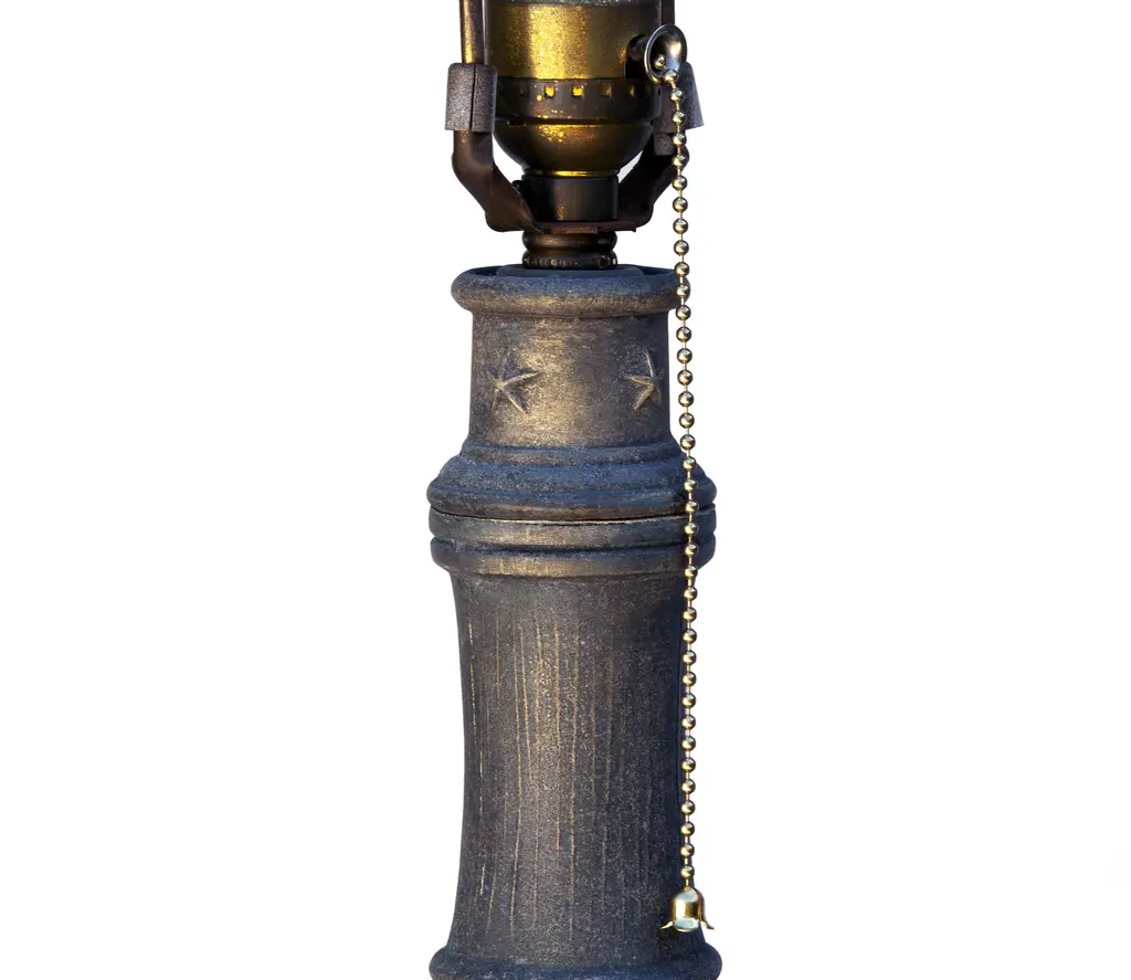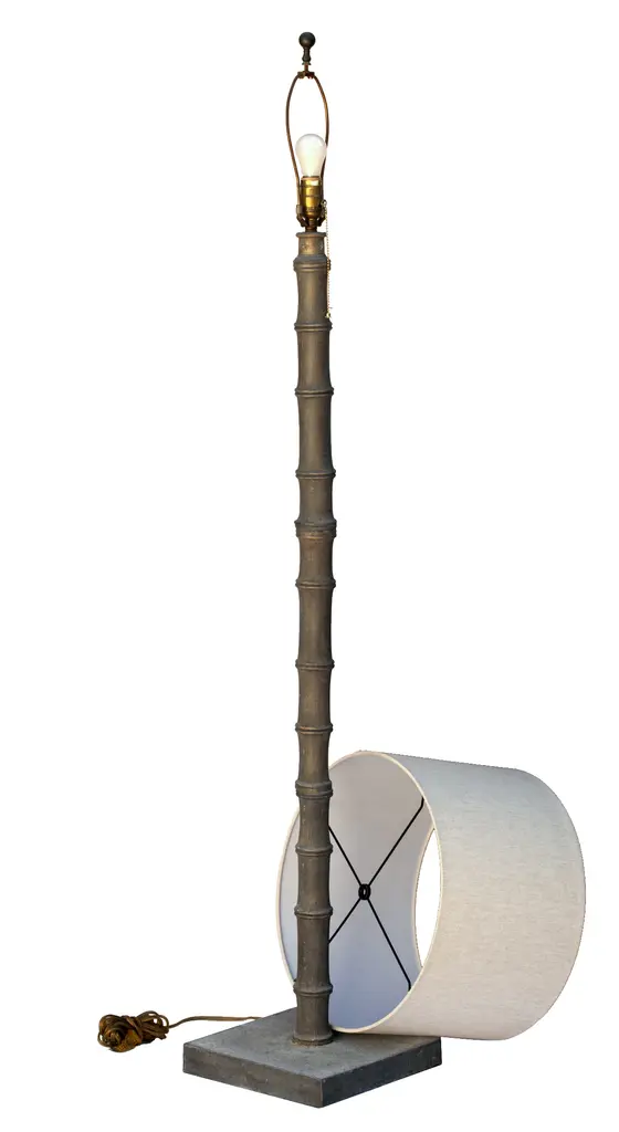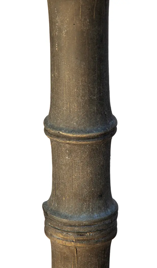 Stacked metal components in patinaed bronze finish follow the form of bamboo. The shade, new linen barrel. The base is topped off with a row of 5-point stars surrounding the top stacked bank of the "bamboo". Pottery Barn 17" linen lampshade is included.