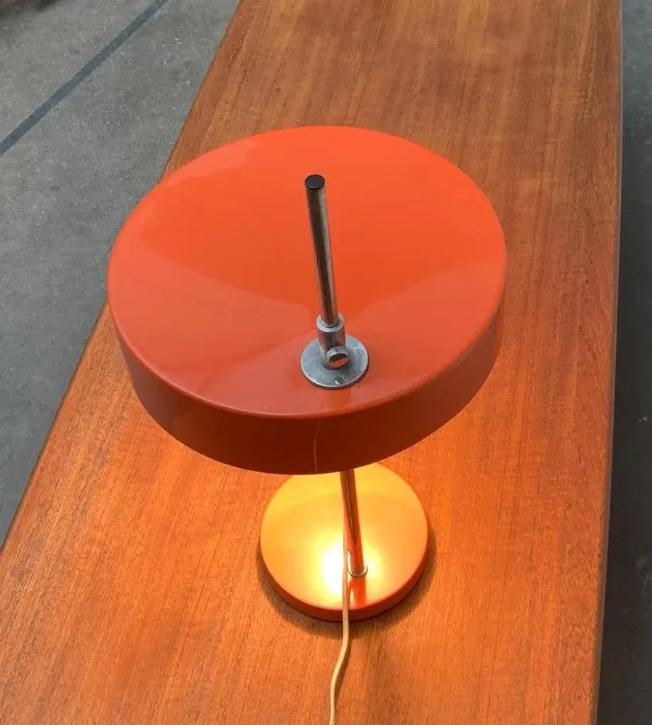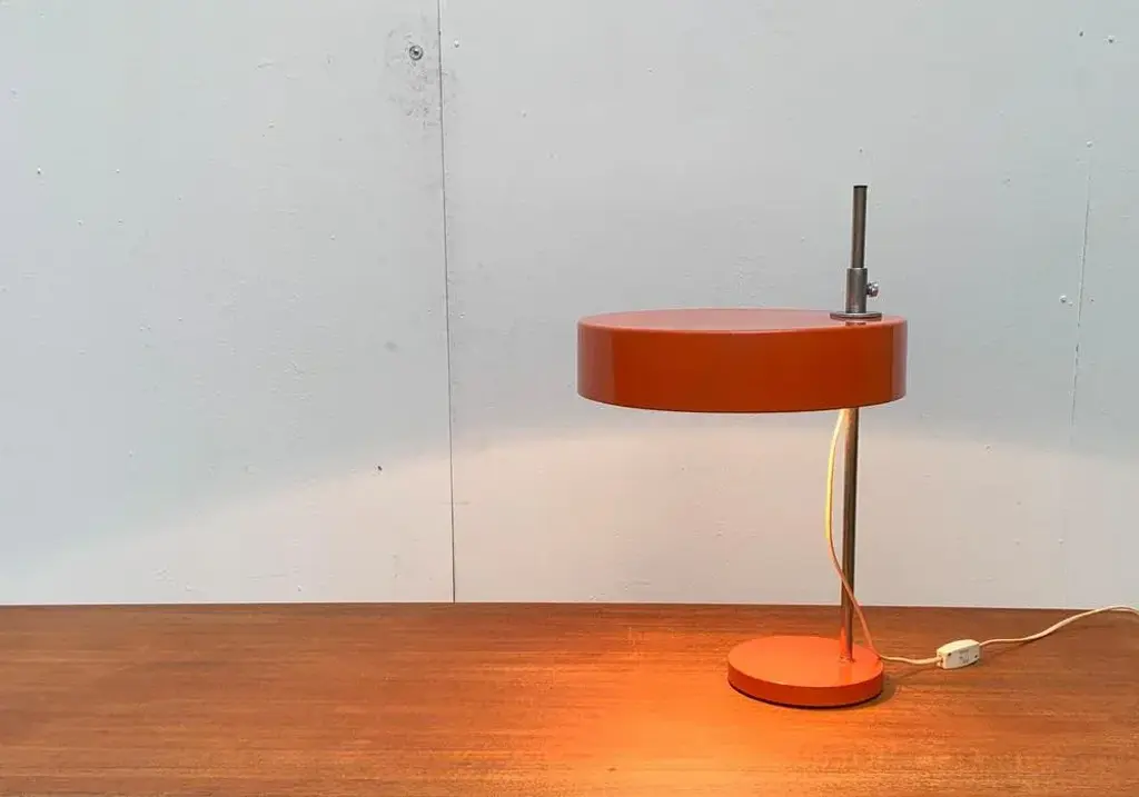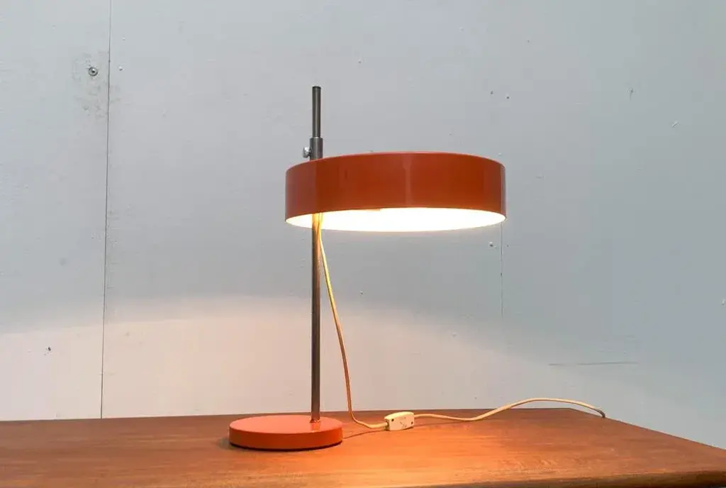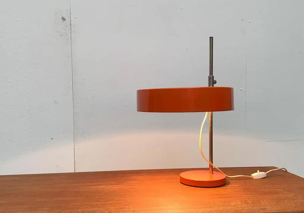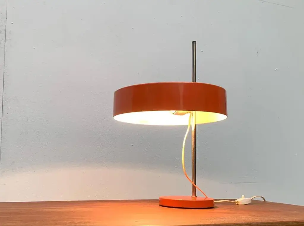 Rare Mid Century table lamp. A minimalist design in a matter-of-fact design language. The shade shows the shape of a flat cylinder. The simple design of the shade is repeated in shape and color in the base. The two elements of the lamp are connected by a chromed shaft. The shade can be adjusted in height on the shaft as well as rotated. It is fixed with a large knurled screw on the top. European Plug (up to 250V).The wiring of this item may be original and might need replacement, if not specified otherwise.