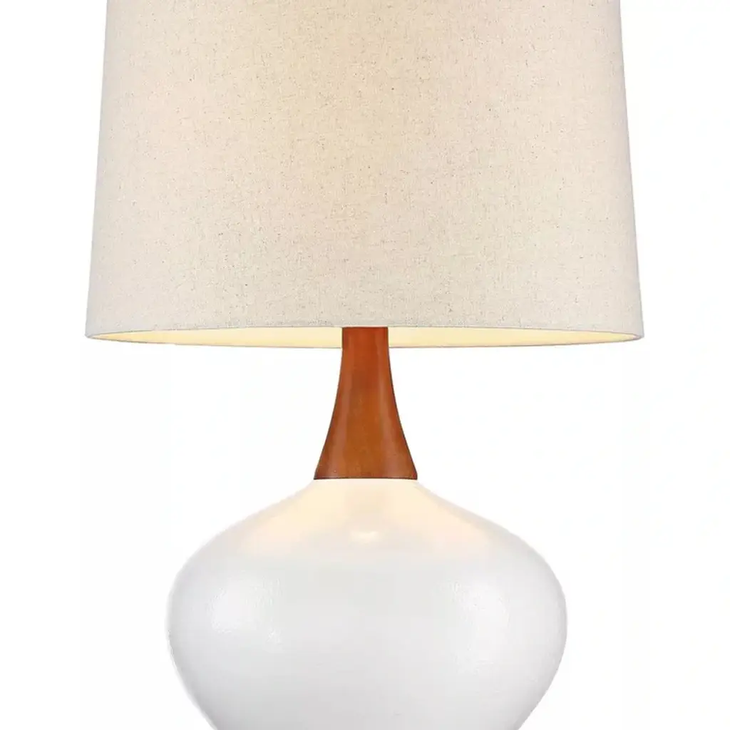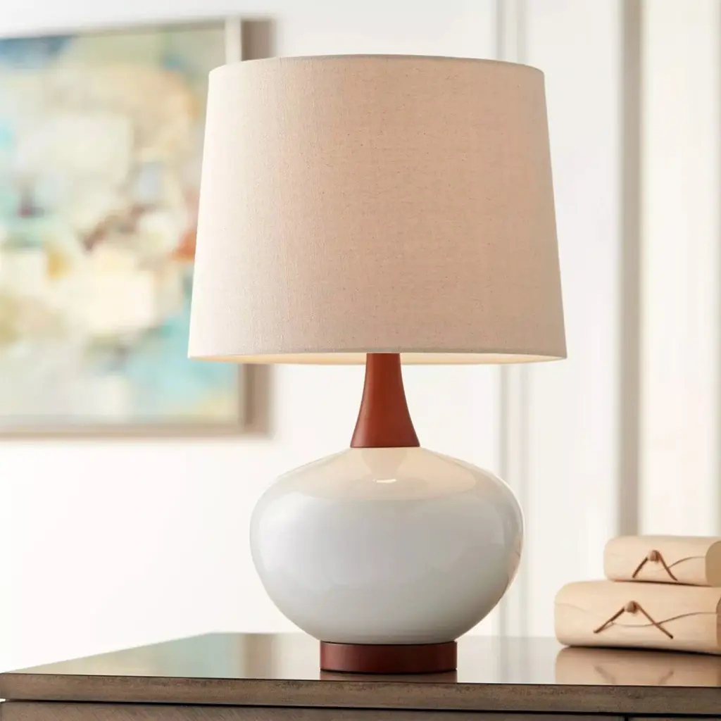 DESCRIPTION: Inspired by a Mid-Century aesthetic influenced by clean lines and a minimalist architectural profile, this stunning ceramic table lamp is topped with an off-white tapered drum shade. The wood material in the neck and base are mirrored in the ball finial on top for a cohesive look. A stylish lighting solution for any room in your home. Ideal for the Japandi interior design trend, a minimalist look that blends Japanese and Scandanavian styles with organic appeal. PRODUCT DETAILS: 23" high overall. Base is 5" wide. Shade is 12 1/2" across the top x 14" across the bottom x 10 1/2" high. Weighs 5.2 lbs. Uses one maximum 150 watt standard-medium base bulb (not included). On-off socket switch. Mid-Century Modern table lamp from the 360 Lighting brand. Ivory ceramic lamp base. Wood neck and base. Off-white tapered drum lamp shade. 7-foot long clear cord and plug.