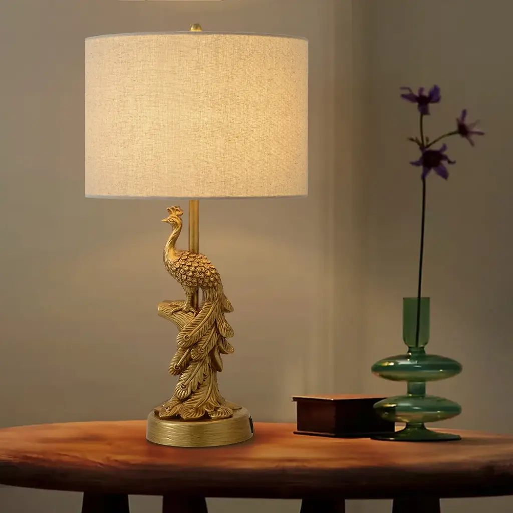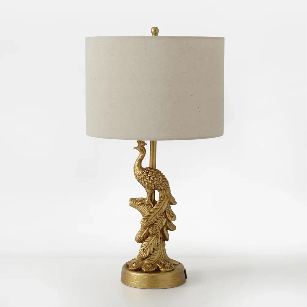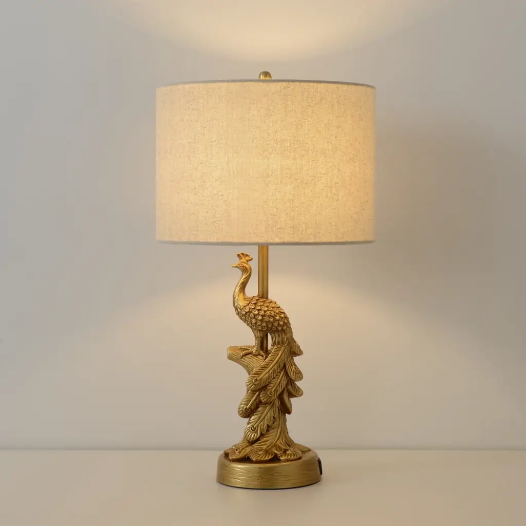 Enhance your home decor with this elegant peacock table lamp. Featuring a luxurious gold finish and intricate peacock design, this lamp adds sophistication to any room. The soft linen shade offers a warm, inviting glow for living rooms, bedrooms, or offices. Crafted from high-quality materials for durability and style, this lamp is a unique and captivating addition to your space.
