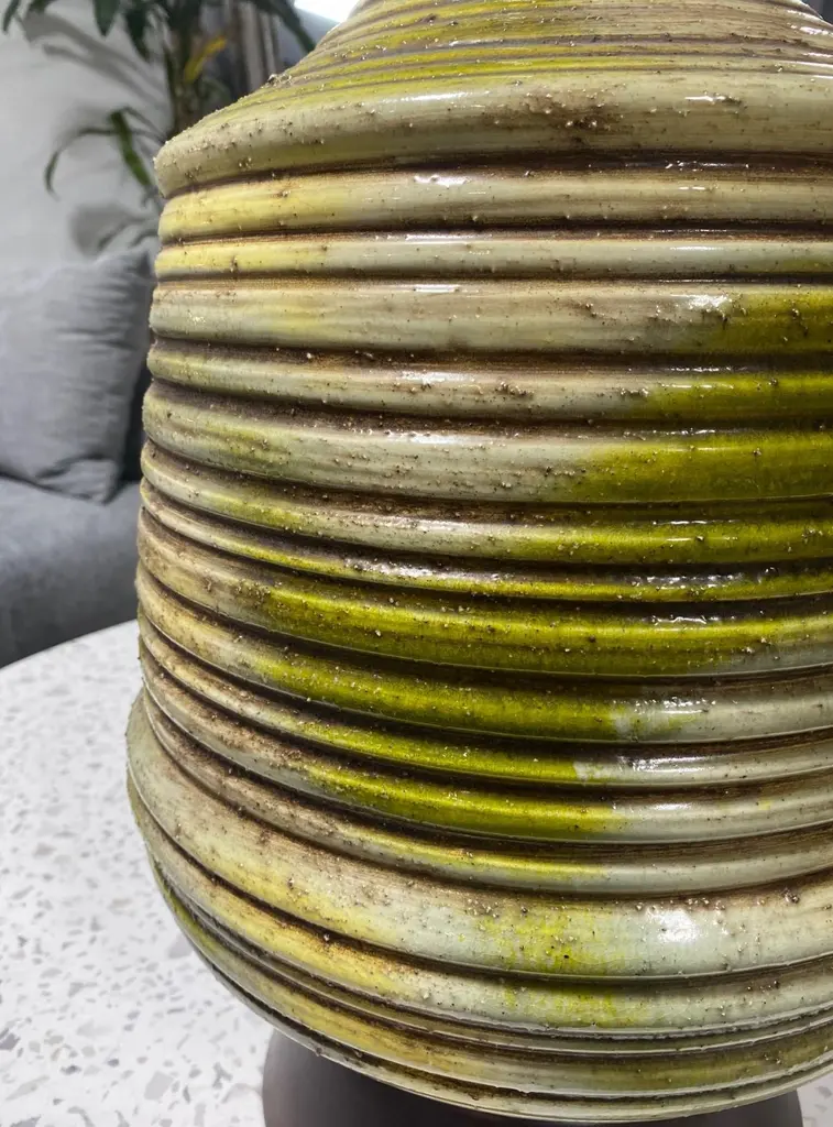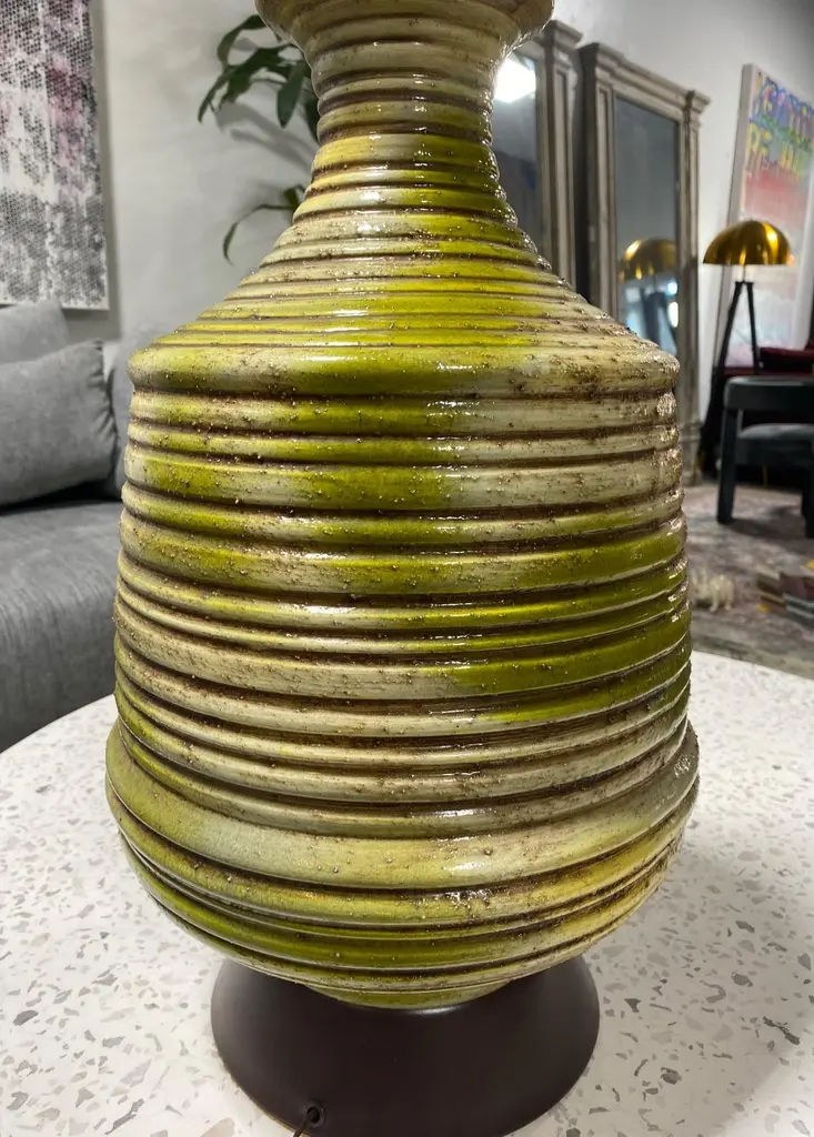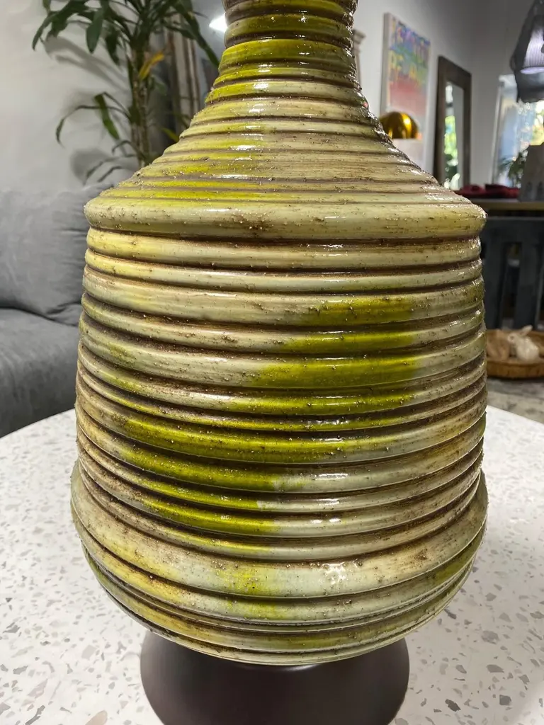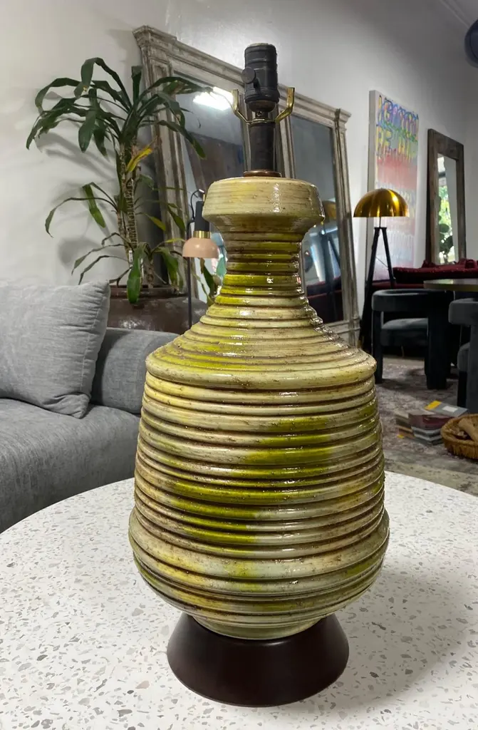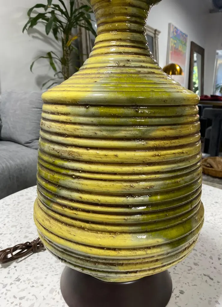 A pair of fabulous Mid-Century Modern green and yellow lava-glazed ribbed ceramic table lamps. Quite fantastic, beautifully colored, and designed. Caught our eye right away. The lamps are fitted to a metal base. Would stand out in about any setting, modern or otherwise.Please note the lamps are sold individually and come as shown without shades as found (shades should easily be found). Dimensions: 27.5" high, 13.5" wide, 13.5" deep.