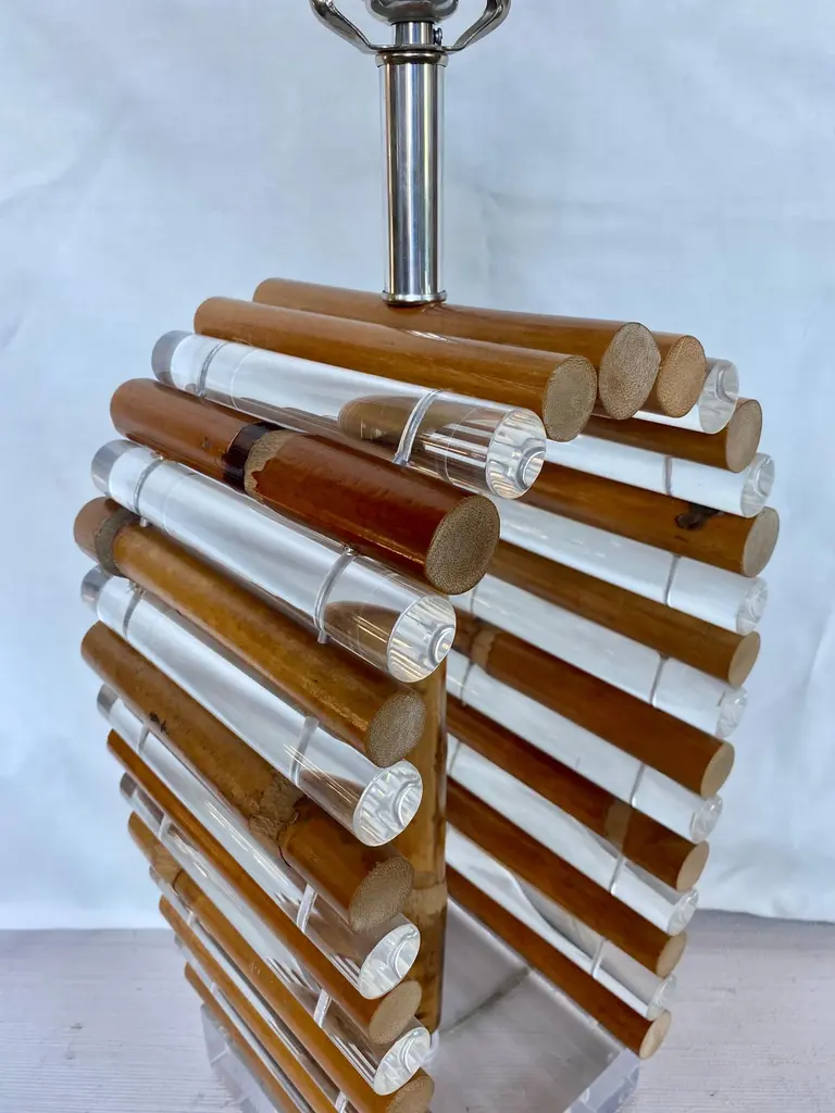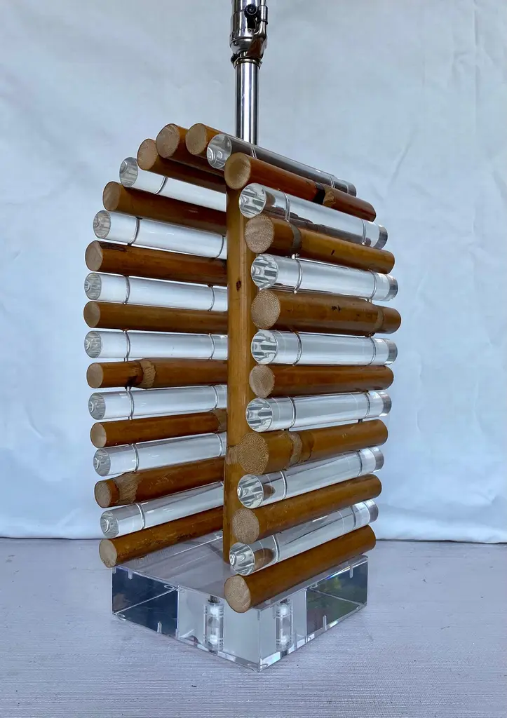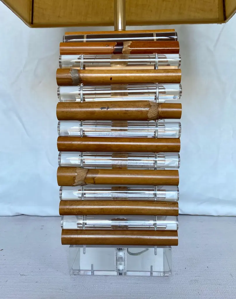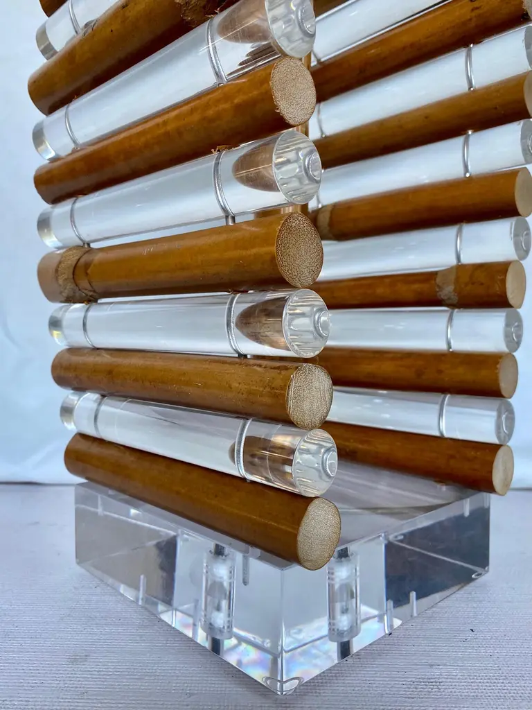 Mid-Century Modern Lucite and bamboo reed table lamp by Shirley Ritts for Ritts Co. Los Angeles. This sculptural Palm Regency style lamp features clear Lucite and bamboo tubular rods configured in a visually striking arched striped design mounted on a square Lucite block base. Rectangular lamp shade and original Lucite finial included. Lamp Shade: 18 Inches Wide, 11 Inches Deep, 12 Inches High. Width of Lucite Square Base: 6.75 Inches. Height to Finial: 33 Inches.Height to Socket: 23 Inches.