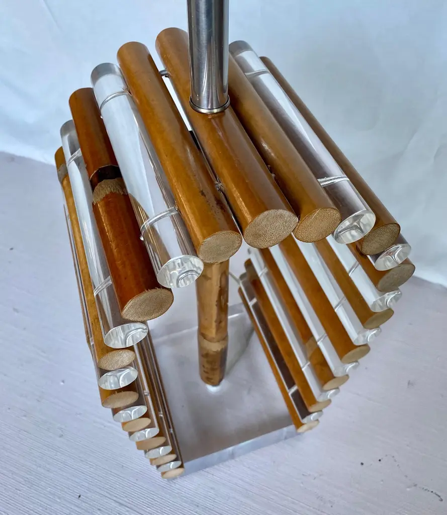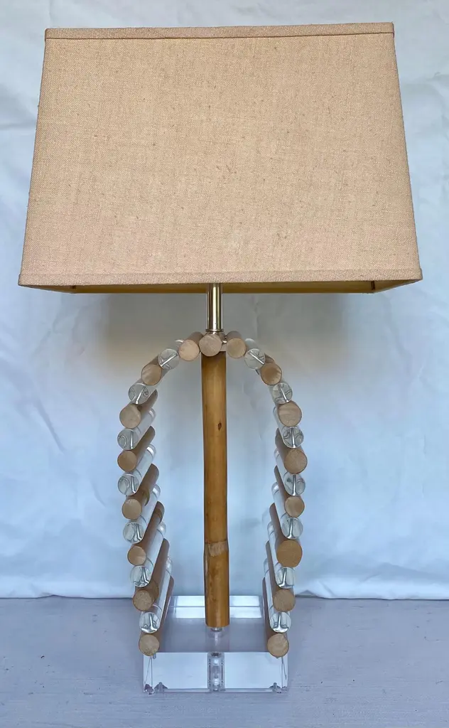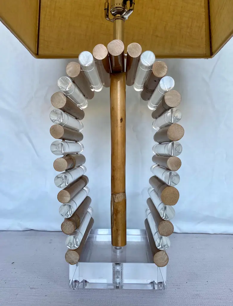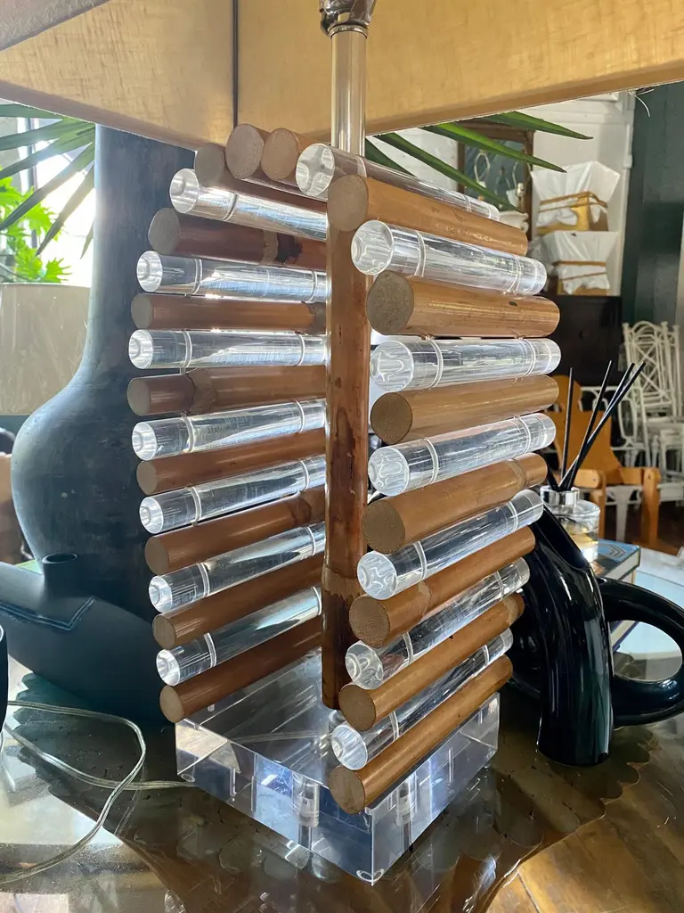 Mid-Century Modern Lucite and bamboo reed table lamp by Shirley Ritts for Ritts Co. Los Angeles. This sculptural Palm Regency style lamp features clear Lucite and bamboo tubular rods configured in a visually striking arched striped design mounted on a square Lucite block base. Rectangular lamp shade and original Lucite finial included. Lamp Shade: 18 Inches Wide, 11 Inches Deep, 12 Inches High. Width of Lucite Square Base: 6.75 Inches. Height to Finial: 33 Inches.Height to Socket: 23 Inches.