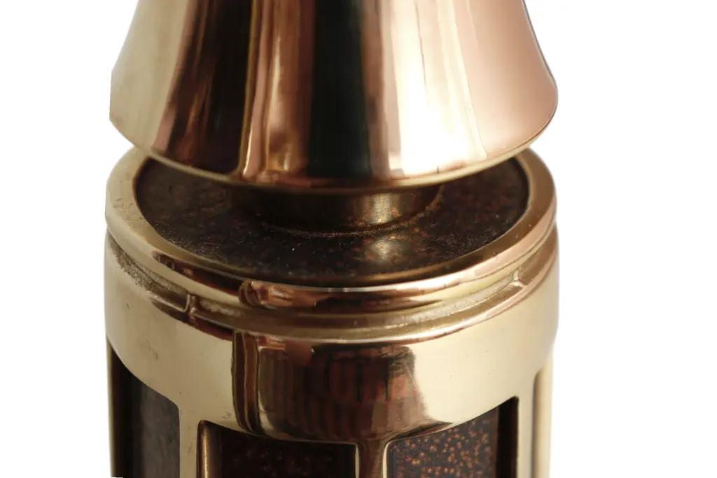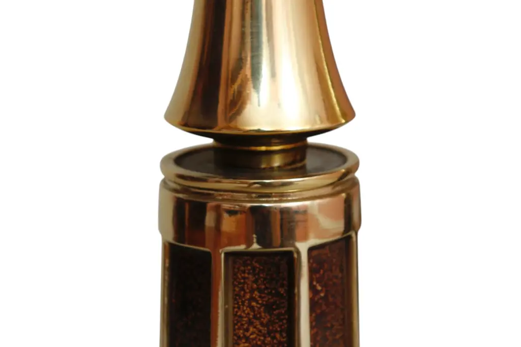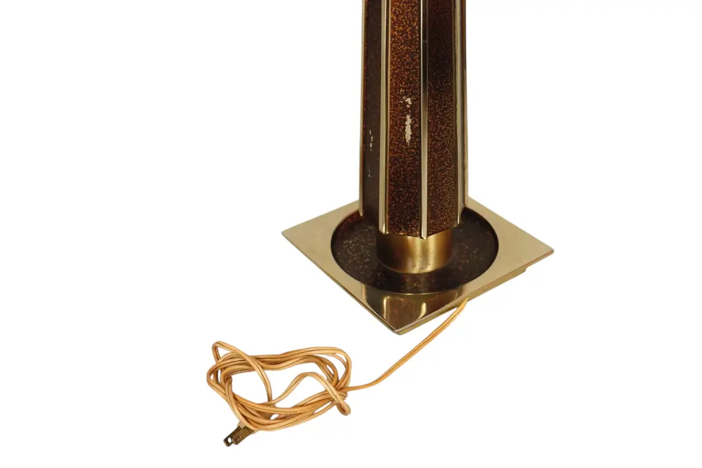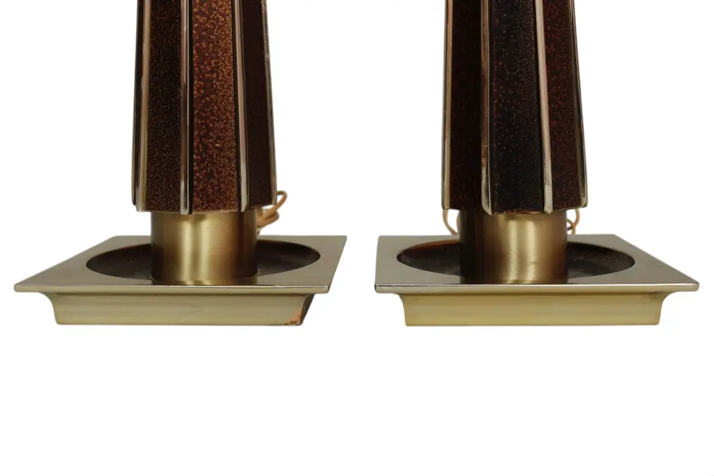 A pair of mid-century modern table lamps circa 1960. Tall columns made of brass are fluted and inlaid with a brown speckled glaze. Tapered brass necks support the sockets and original square harps. Finished on square brass bases. Each lamp measures 6.5"W x 6.5"D x 24"H to top of socket, 30"H to top of harp.