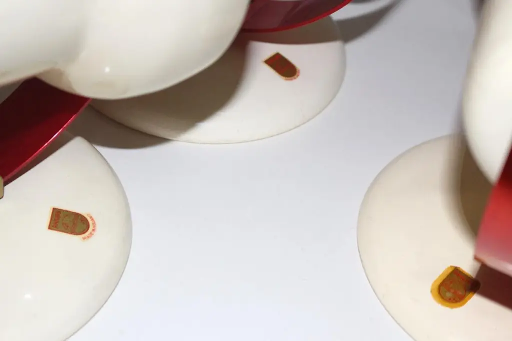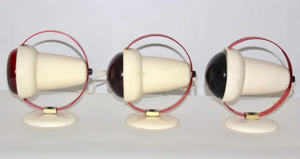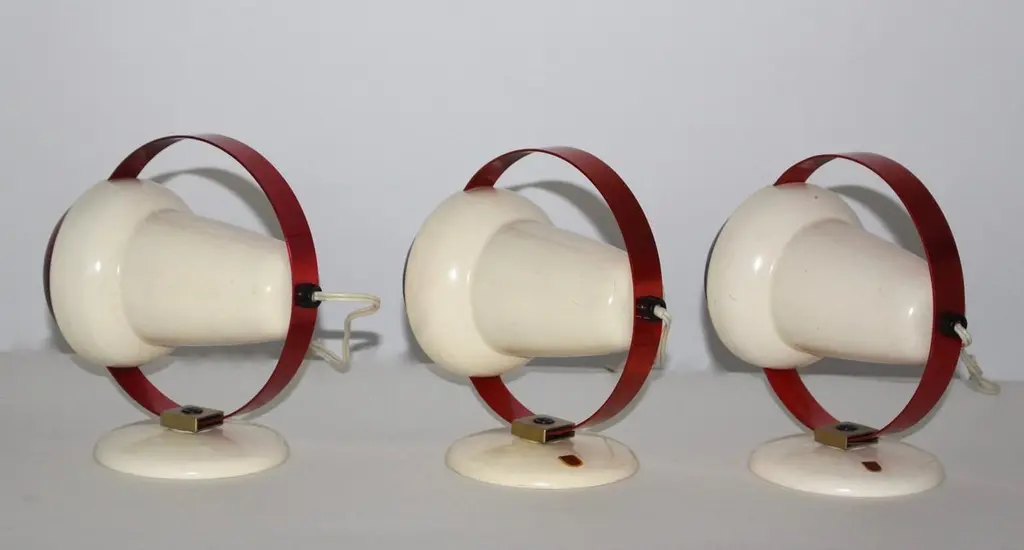 These three heater lamps were designed by the French architect and designer Charlotte Perriand and produced by Philips Netherlands.The base was white lacquered and a red lacquered ring for supporting. Also the lamps are adjustable from right to left.One E 27 Socket Approximate measures:Width: 14.5 cmDepth: 26 cmHeight: 25 cmWe sell these lamps individually. Please cross the requested quantity - three pieces are available.