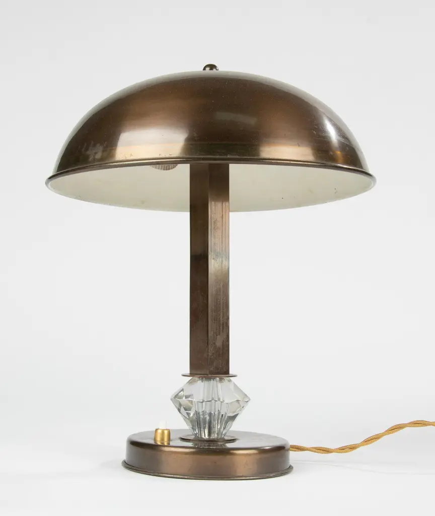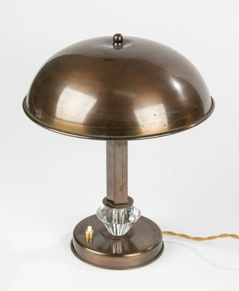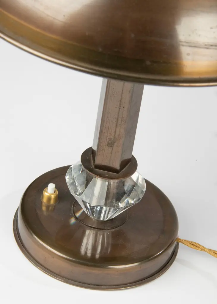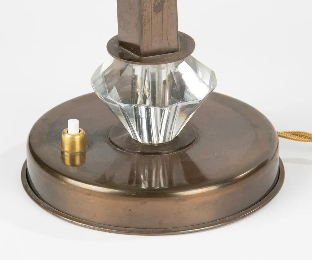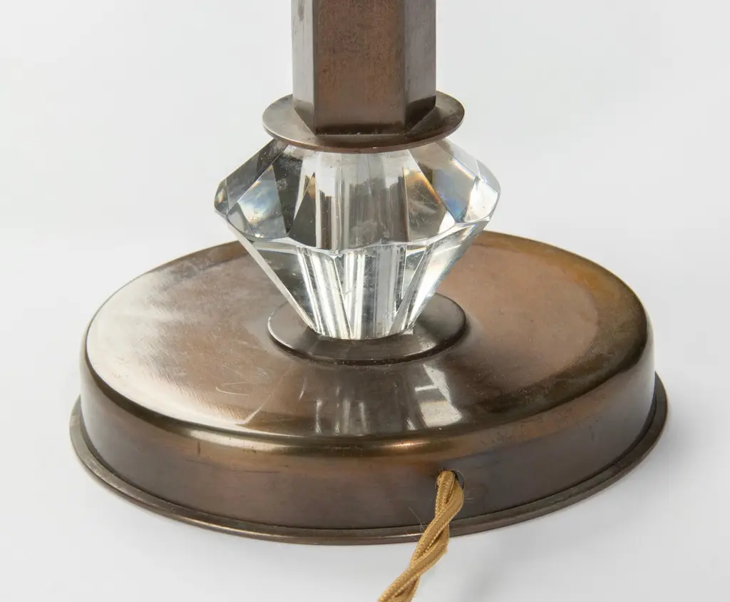 An elegant Art Deco style table or desk lamp, made of copper colored metal. At the bottom of the stem a crystal cut knop. The lamp has a two E27 lamp fittings. The lamp is in working order, the switch also functions. Dimensions: 32 () x 26 x 26 cm.H.