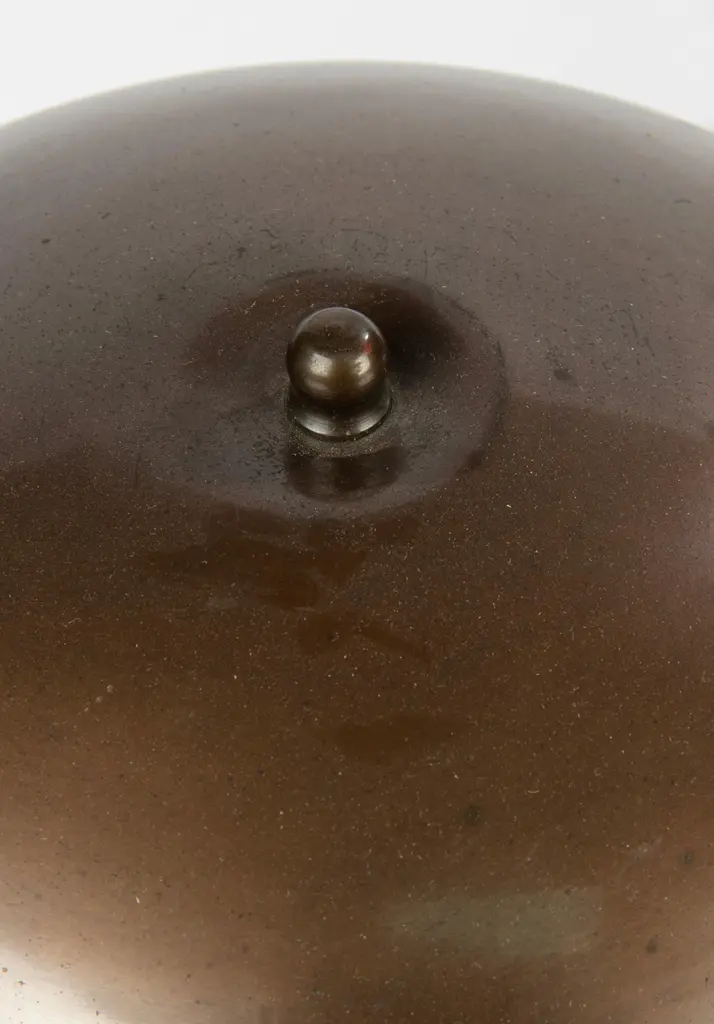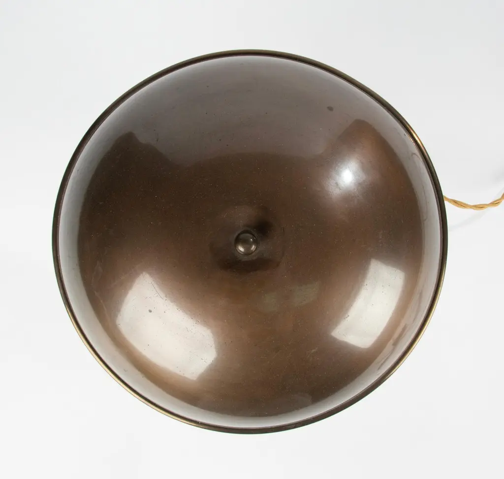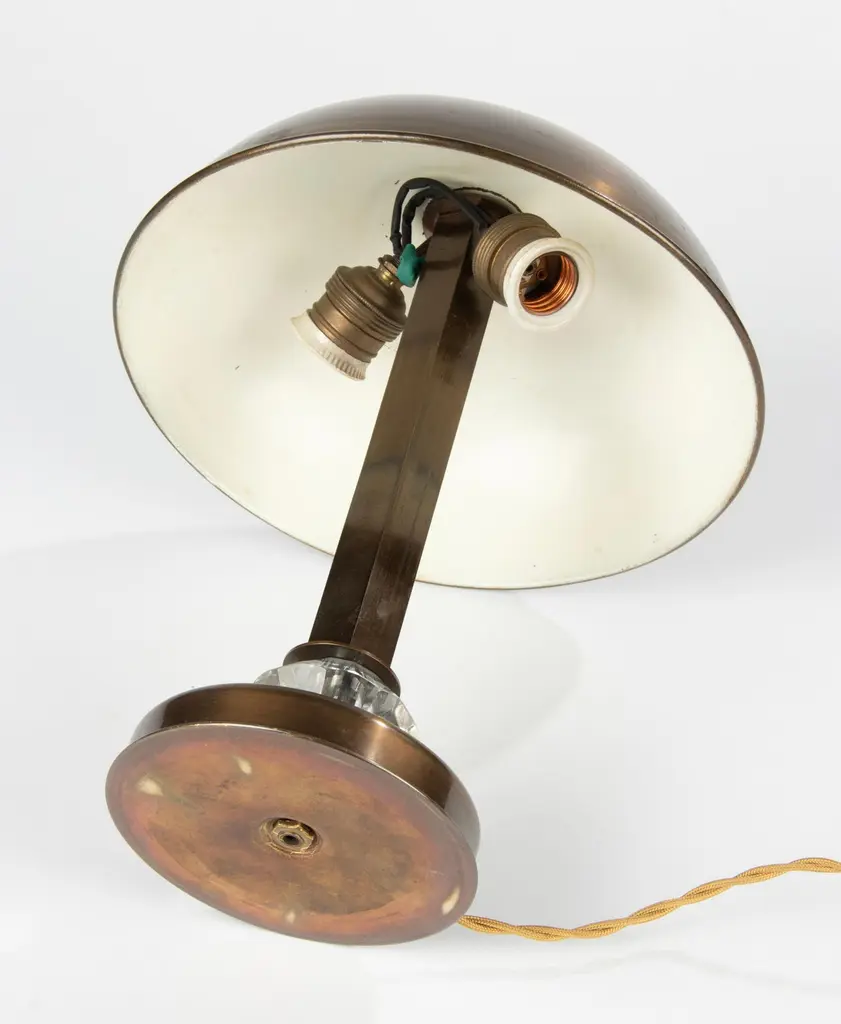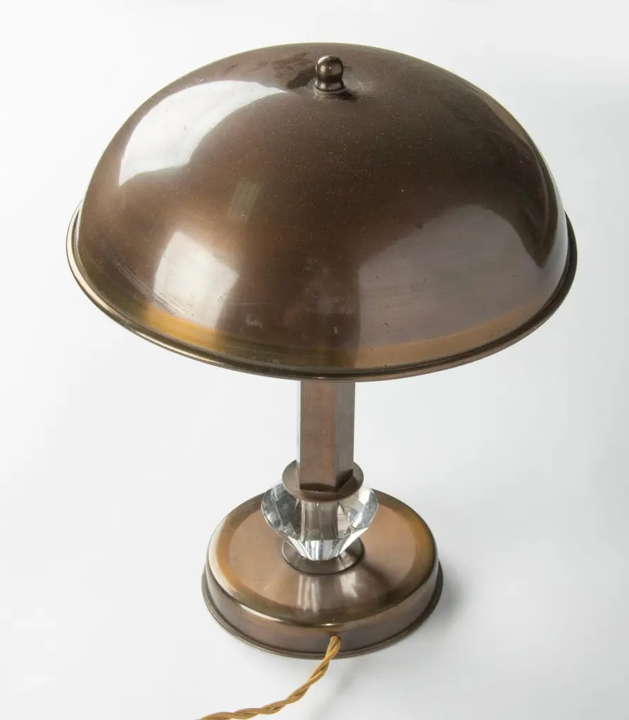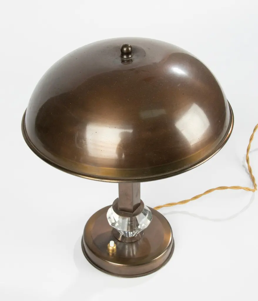 An elegant Art Deco style table or desk lamp, made of copper colored metal. At the bottom of the stem a crystal cut knop. The lamp has a two E27 lamp fittings. The lamp is in working order, the switch also functions. Dimensions: 32 () x 26 x 26 cm.H.