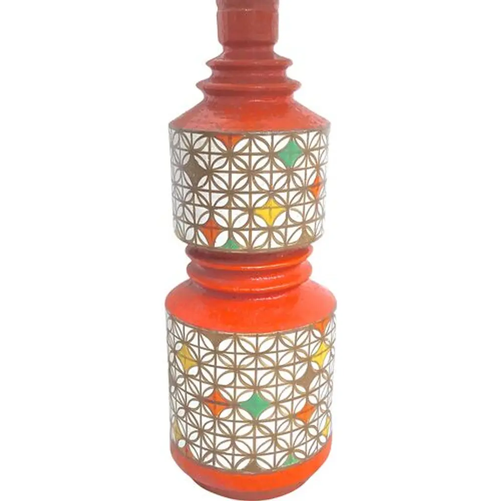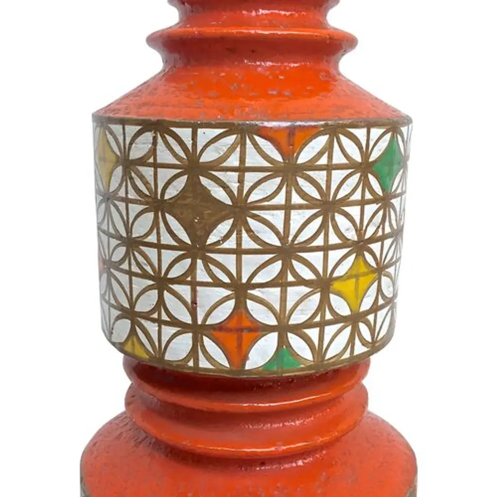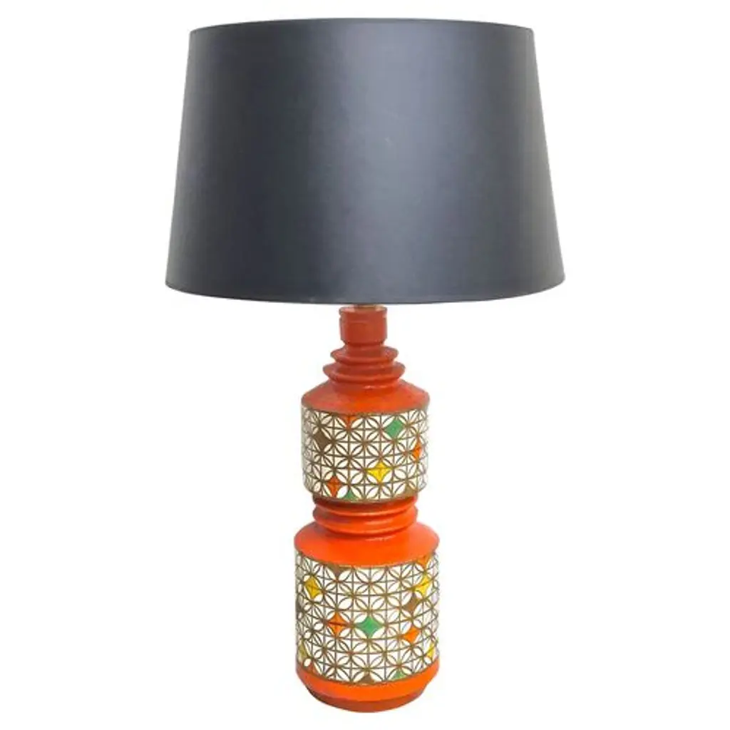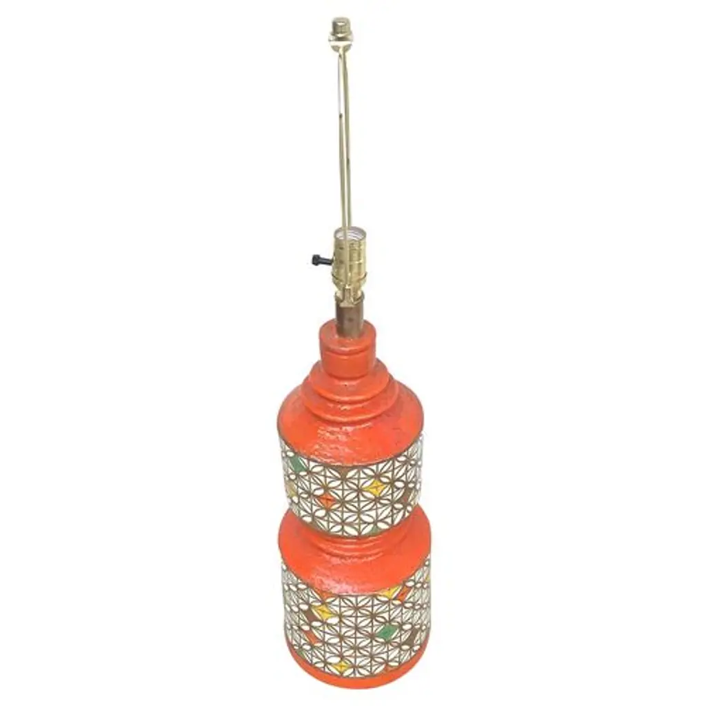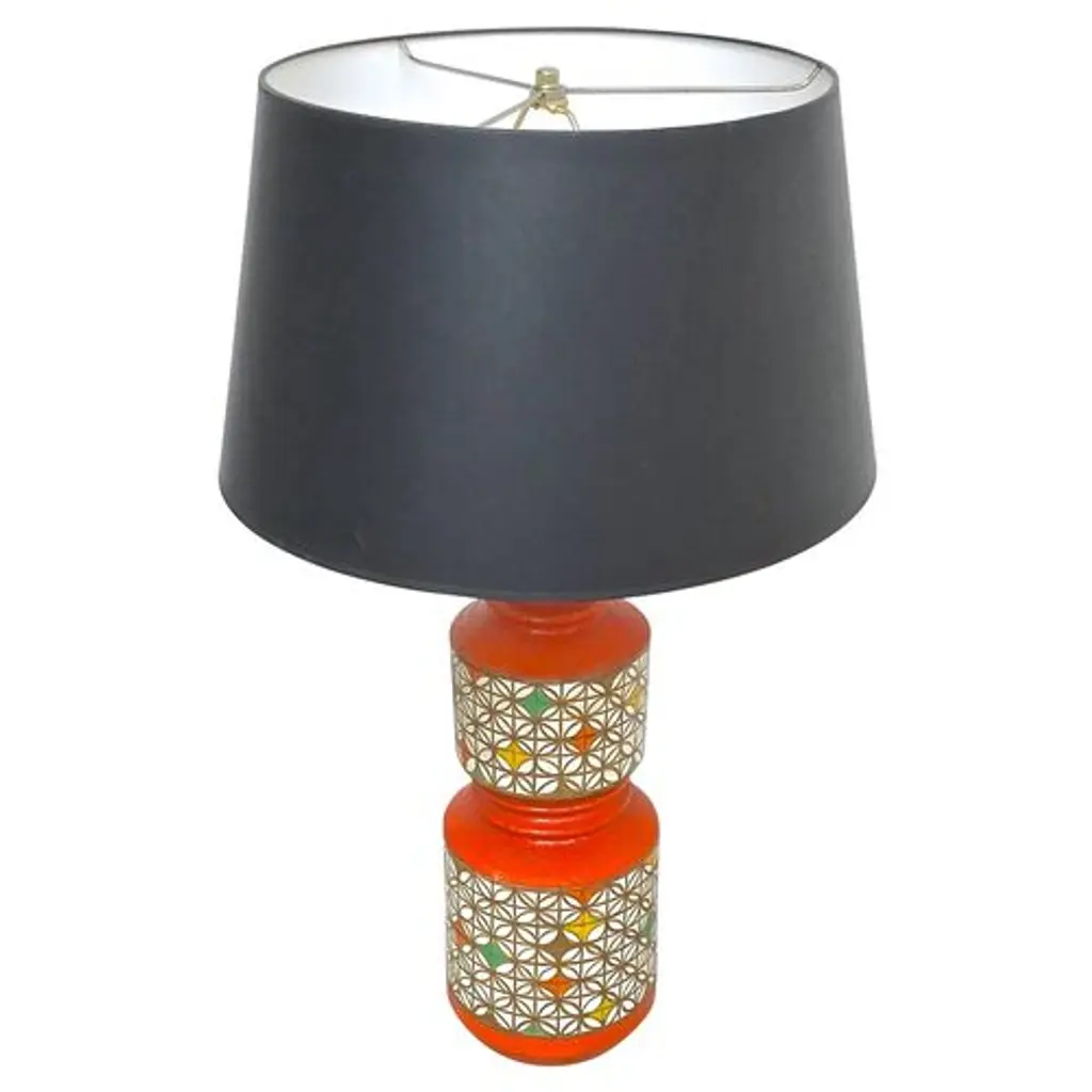 Mid-Century Modern hand-painted geometrically patterned lamp by Aldo Londi, Bitossi. Marked "43/47 Base Made In Italy" on the underside. Shade measures: 19.25"Diam. x 11"H. base measures: 7.5"Diam. 32.5"H to top of finial.