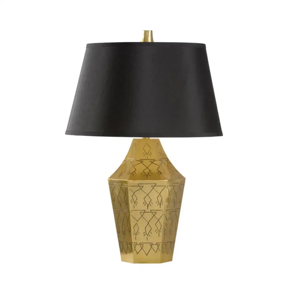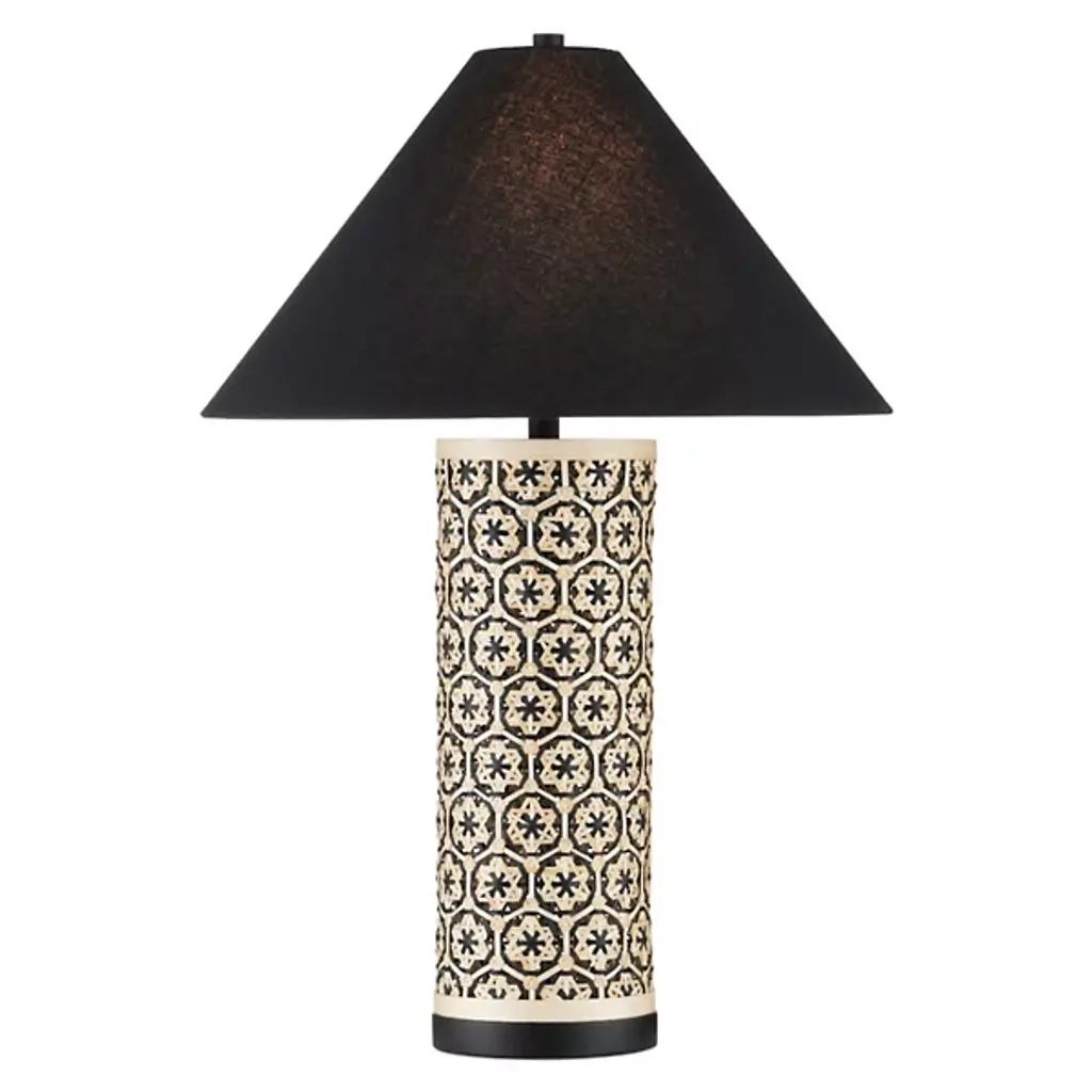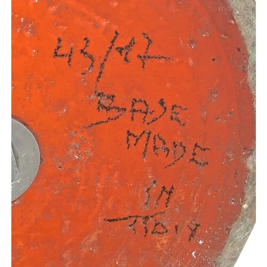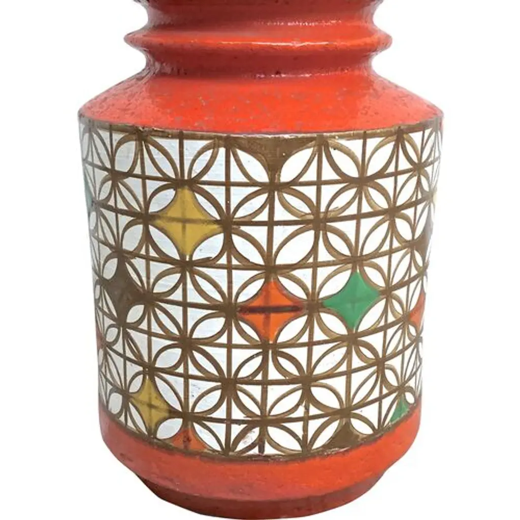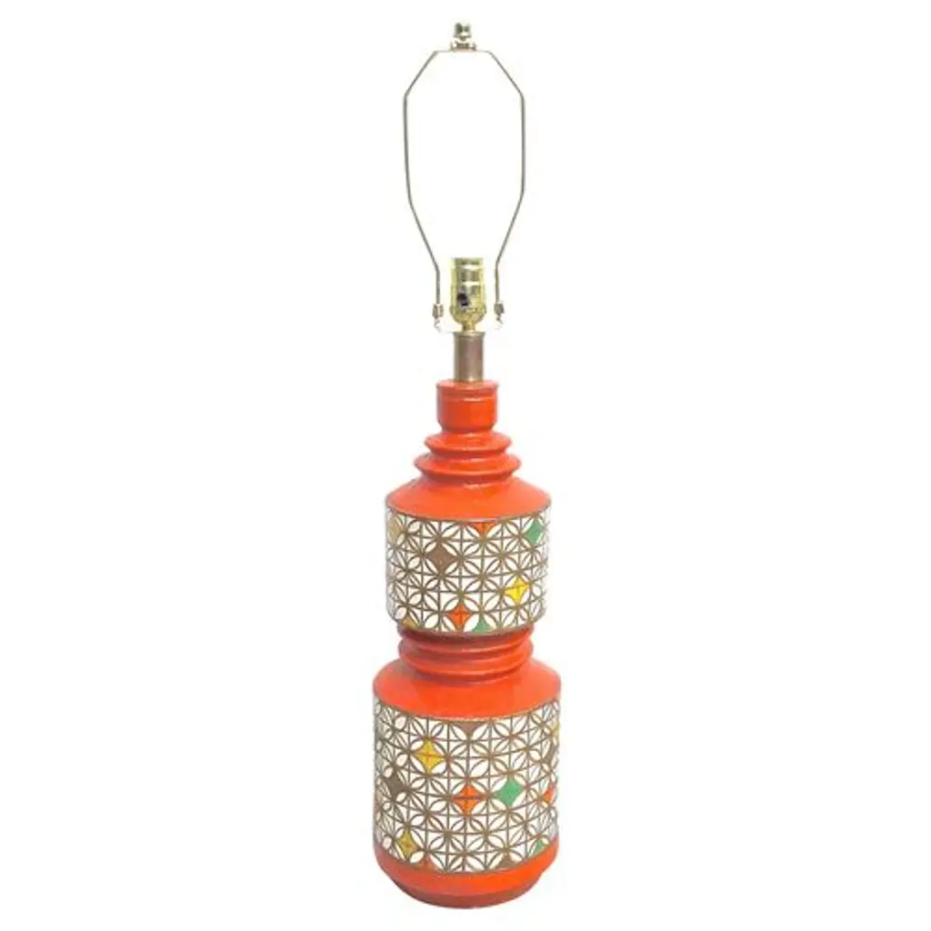 Mid-Century Modern hand-painted geometrically patterned lamp by Aldo Londi, Bitossi. Marked "43/47 Base Made In Italy" on the underside. Shade measures: 19.25"Diam. x 11"H. base measures: 7.5"Diam. 32.5"H to top of finial.