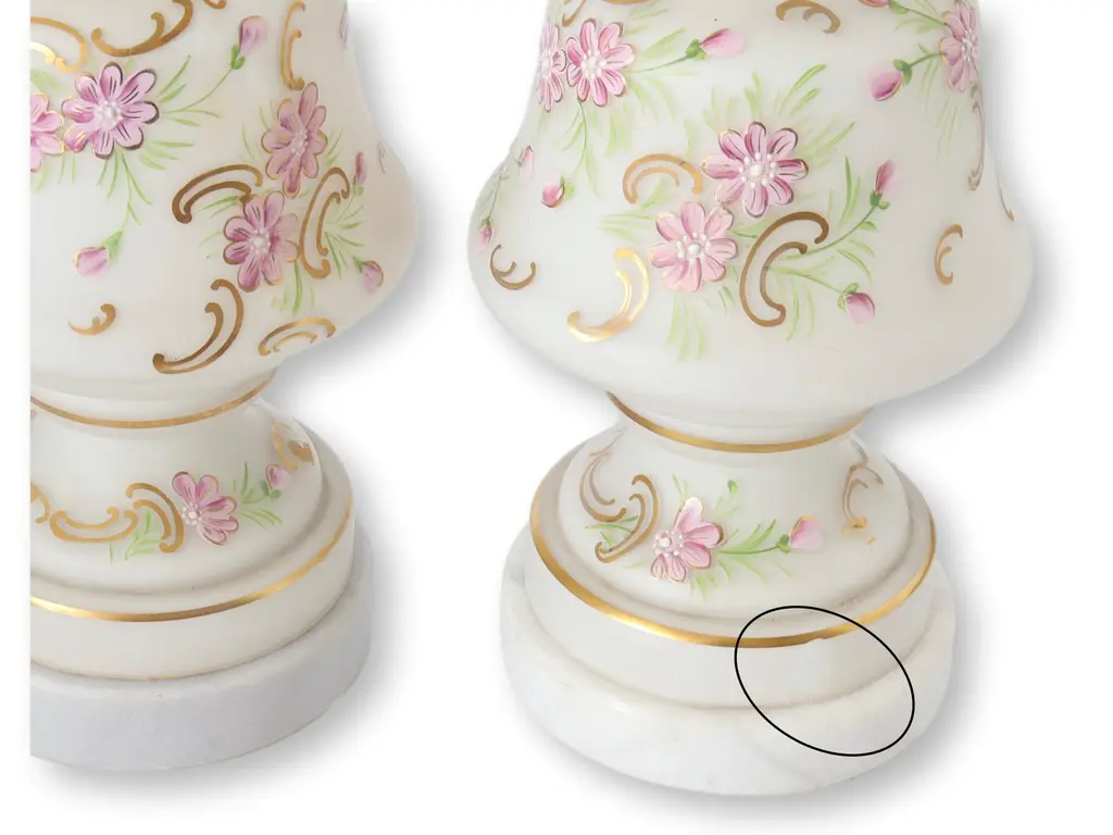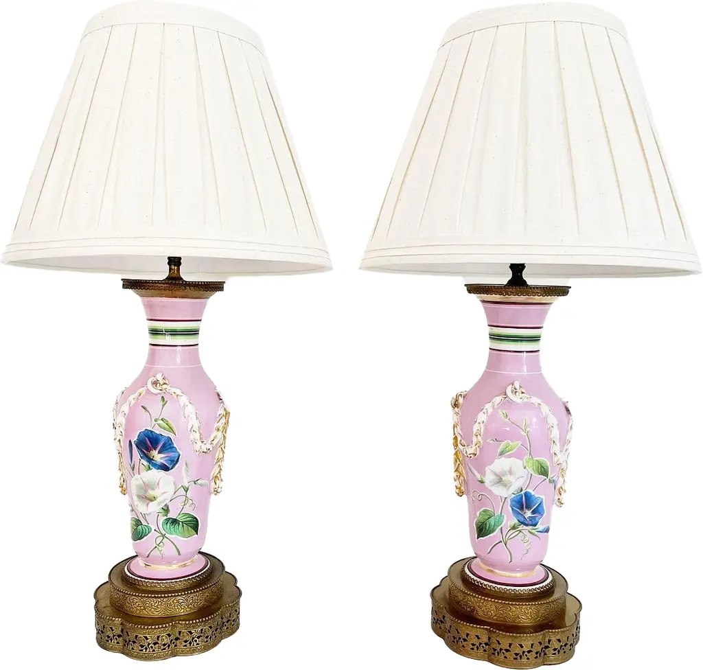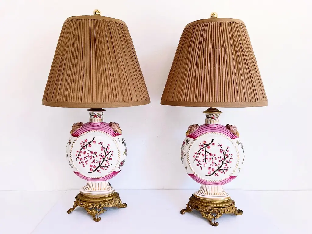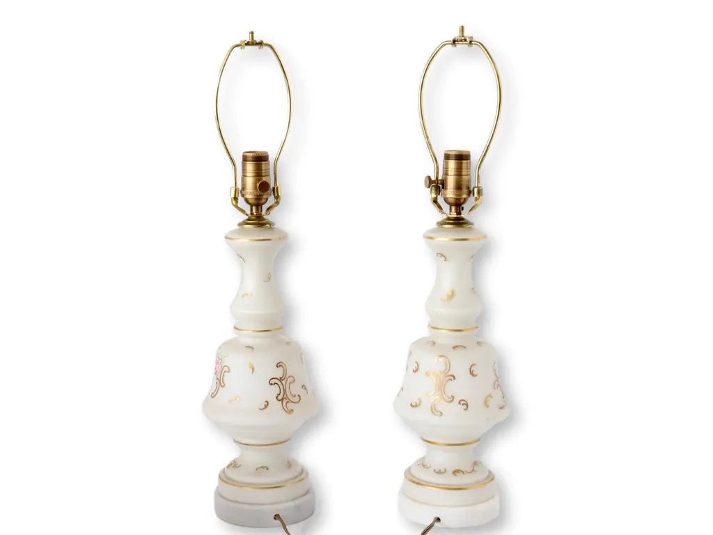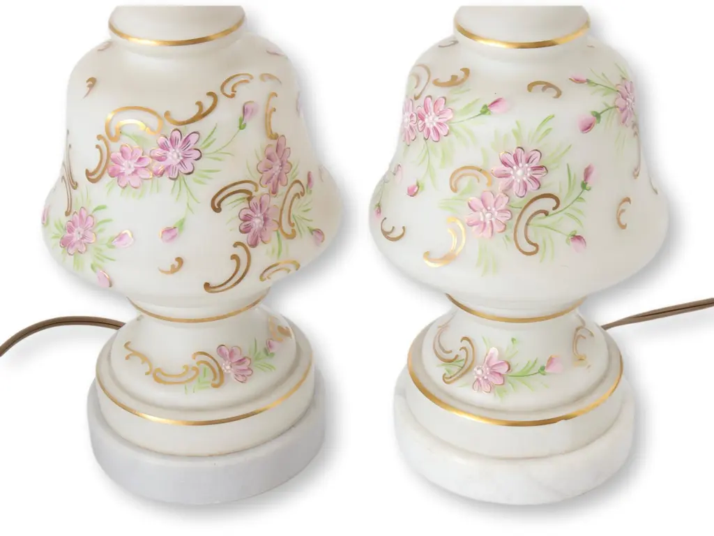This pair of lamps features a classic design with a marble base embellished with delicate floral patterns and gold accents. The intricate details on the porcelain speak of a refined aesthetic, making these lamps an elegant addition to any room. The brass fixtures and the charming design elements give it a timeless appeal, perfect for a traditional or vintage-inspired interior. Shade Dimensions: 9"H x 10"Dia