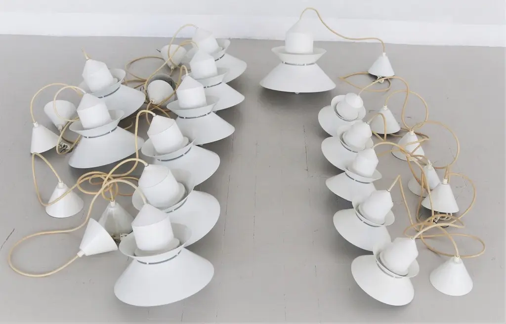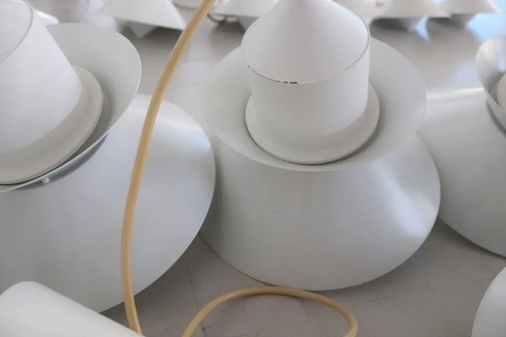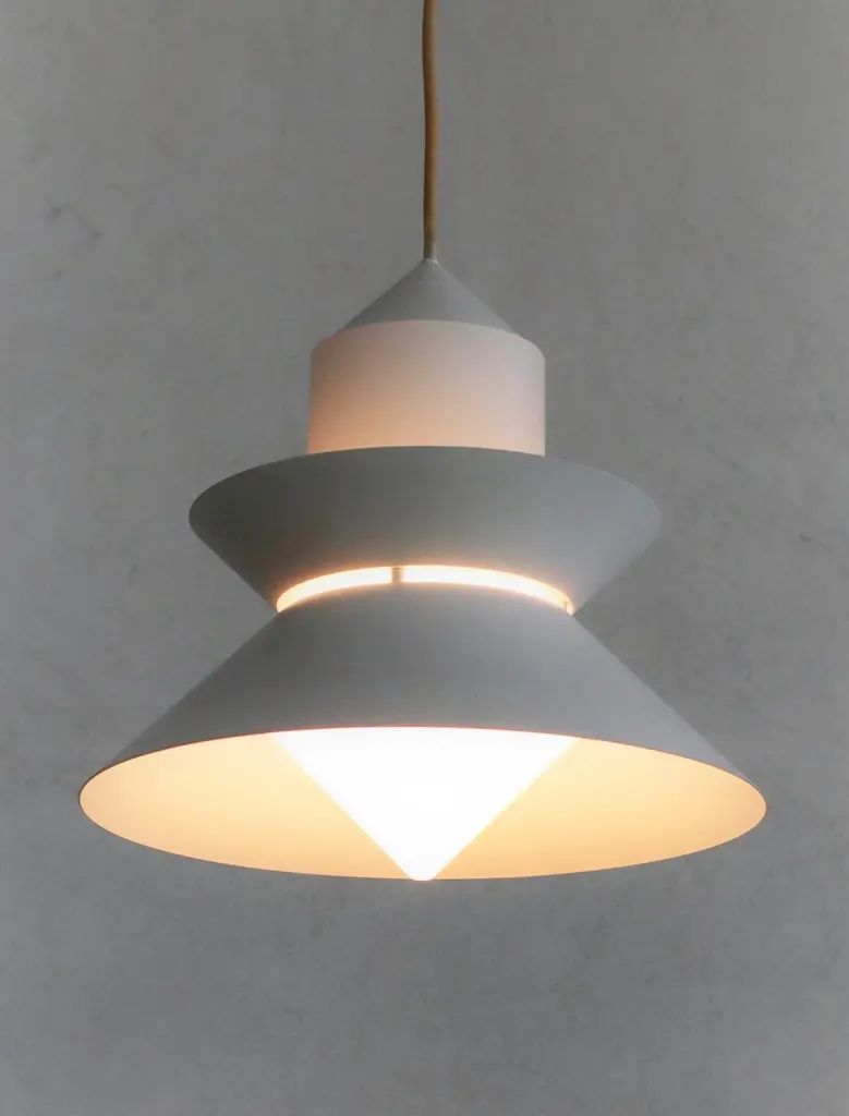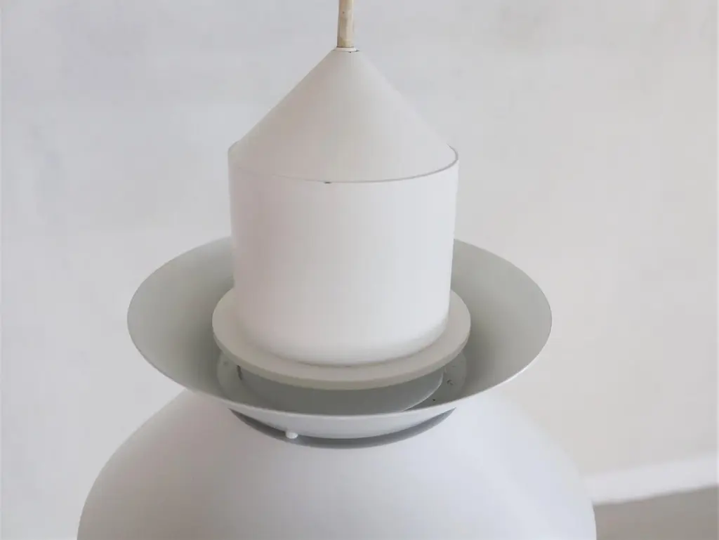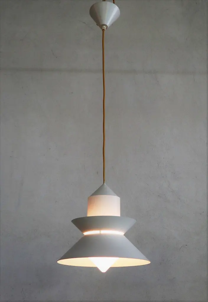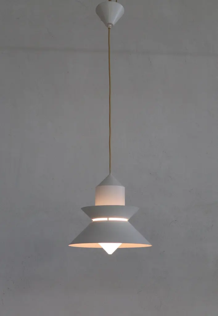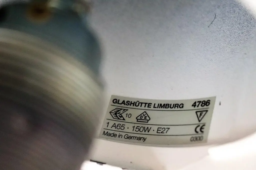 Midcentury Pandant Lamp Nordic Style in Metal and Glass by Glashütte Limburg 80sGorgeous pendant lamp made of strong metal varnished in off-white color, and white glass, produced in the 1980s from best German production of that time. We have more items from the same production lot in three different sizes available.This lamp is the small size, with long wire 1,20m ( 47,2in) , which can be shortened to request.All lamps have the same shape and color, but different sizes, and are equipped with their original wire and canopy.The lamps may have very small and few vintage signs on the varnish, but are in allover very good, clean condition. Stunning to see in group of more items together.