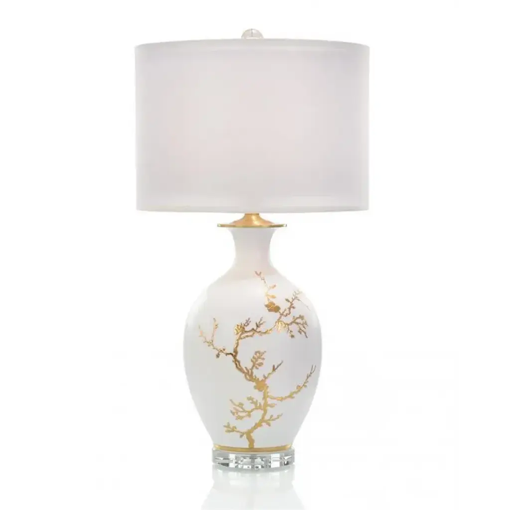 The Midnight Grove Table Lamp displays an elegant blend of natural beauty and contemporary design. A round, tapered body of black glass is overlain with an intricately detailed brass branch. The piece rests atop a circular base of clear acrylic, with a matching neck accent. Polished Brass neck hardware and ball finial complete the look of this three-way turnkey lamp.