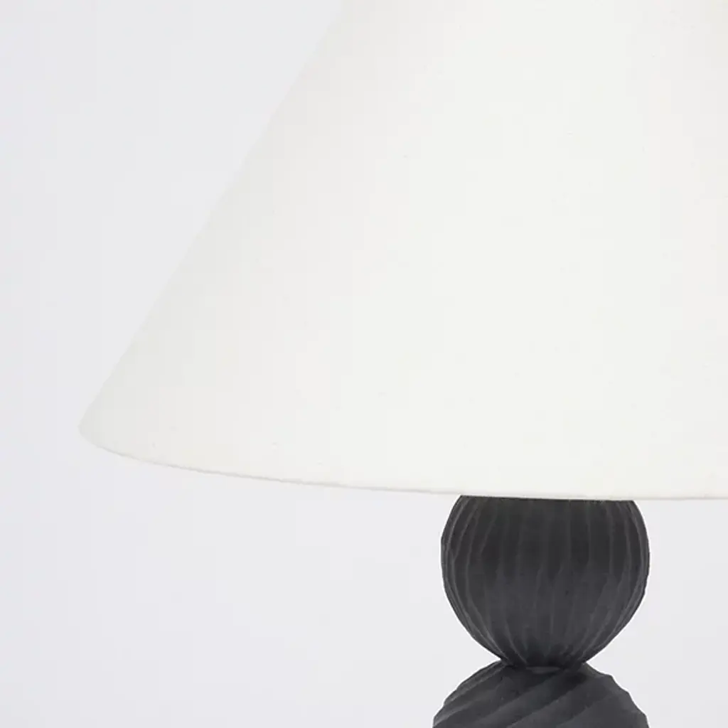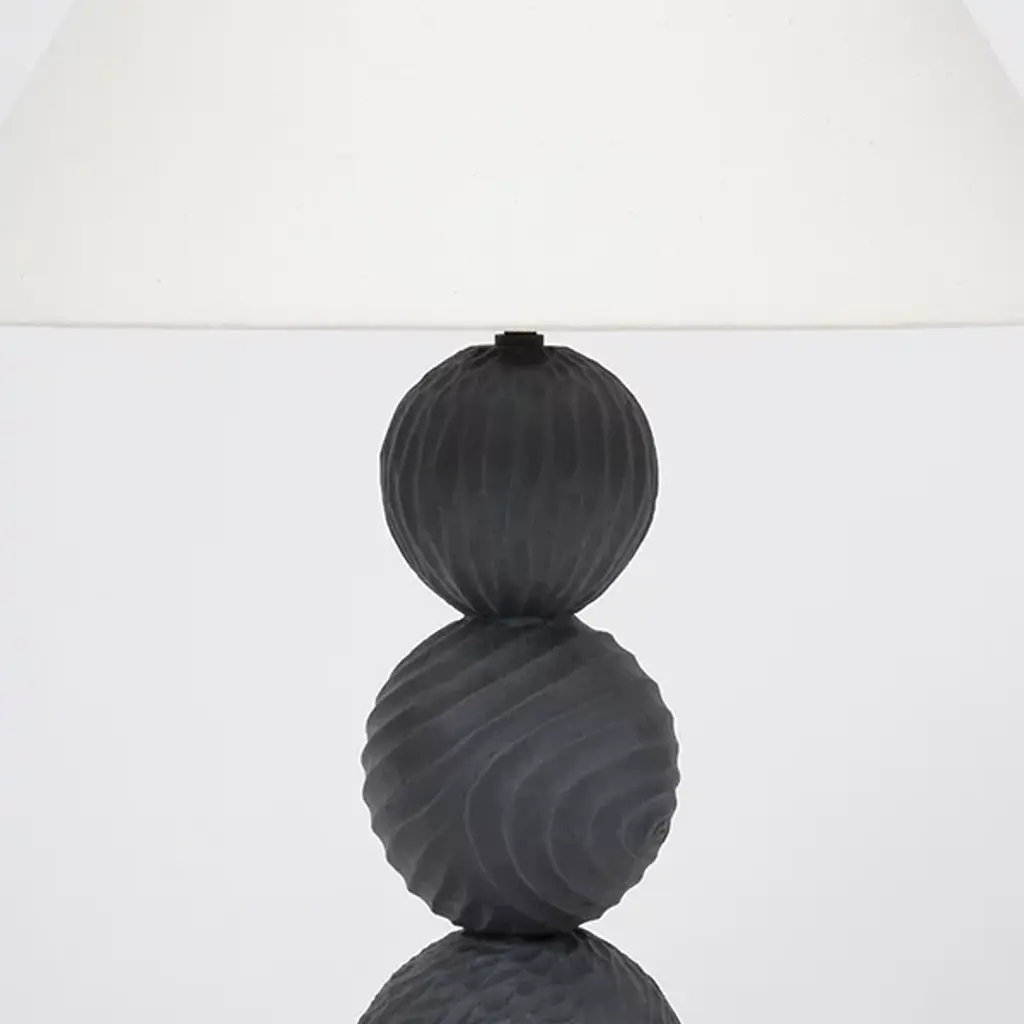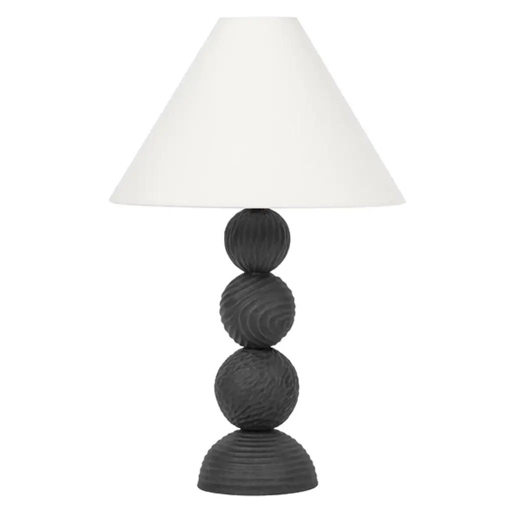 The Miela Table Lamp from Troy Lighting boasts a totem-style design pulsating with rhythmic energy, aligning conceptually with folk art aesthetics and cultural richness. Crafted from Black Motif Ceramic, its incised spheres evoke the elegance of carved wood, exuding a polished allure. Enhanced by an oversized pull chain and a Forged Iron frame, Miela commands attention with its commanding presence. The off-white linen shade adds a crisp contrast, highlighting its distinct elegance and cultural resonance.