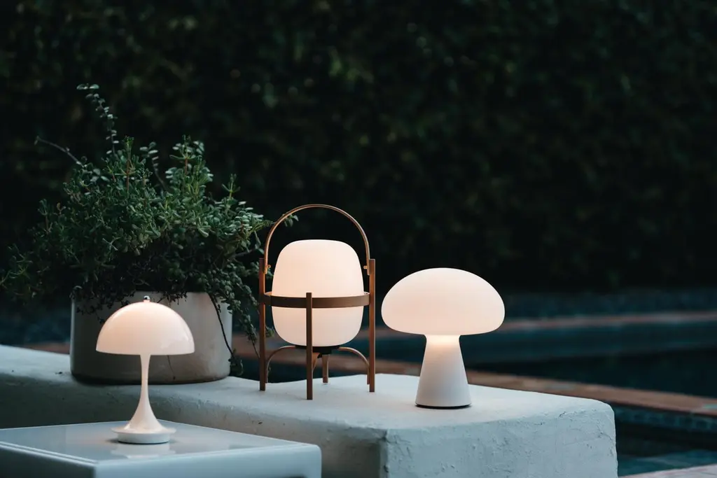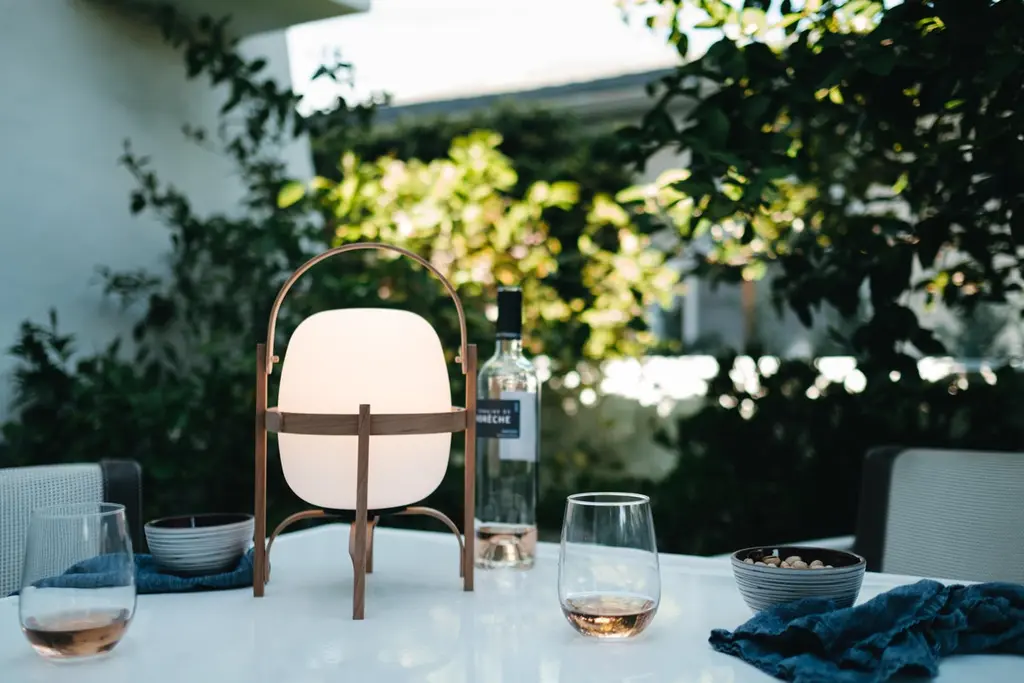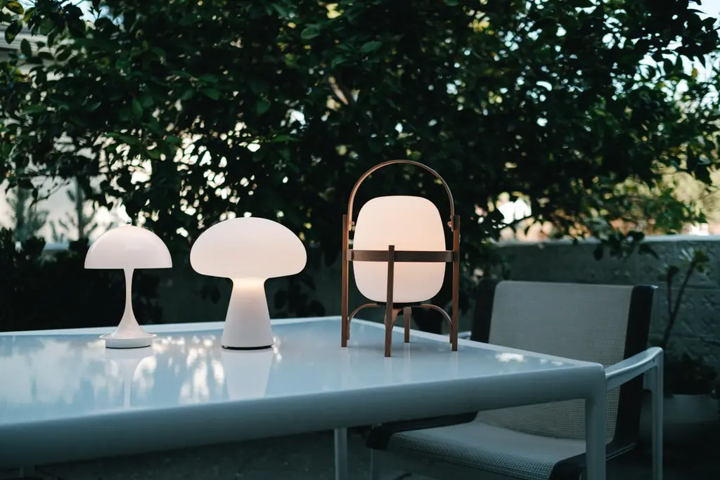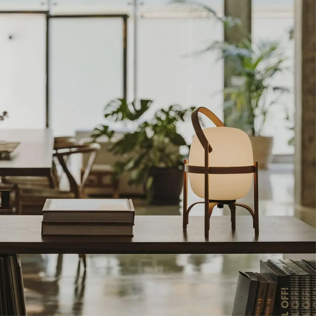 Miguel Milá 'Cestita Bateria' portable lamp in cherry and glass for Santa & ColeFounded in 1985 in Barcelona, Santa & Cole produces iconic pieces by such luminaries as llmari Tapiovaara, Miguel Milá and other European icons with a commitment to faithfully re-edition their legendary designs with uncompromising attention to detail, materials and craftsmanship.The 'Cestita Bateria' lamp is the newest member of the Cesta family from renowned creator Miguel Milá. Originally inspired by traditional lanterns that illuminate coastal homes, the 'Cestita Bateria' version includes technological upgrades permitting it to be recharged and used portably via its lithium ion battery. Executed in a steam-bended cherry wood frame that supports the blown opal glass shade, the handcrafted 'Cestita Bateria' creates an elegant ambiance anywhere.Price per item. Available in unlimited quantities. Variations available include metal or wood frame, smaller size, an outdoor rated lamp, a portable battery option as well as choice of glass or polyethylene shade. Available in a pendant or wall light design, please see our separate listings. This listing is for the portable 'Cestita Bateria' table lamp with white opal glass in a cherry wood frame.In stock lead time 1-2 weeks. Out of stock can add an additional 4-8 weeks or more. Please note that lead times and inventory availability are subject to change without notice. For time sensitive orders, please contact us for current lead times prior to purchasing. Kindly note that items must ship from Santa & Cole’s Barcelona warehouse, so 1st Dibs arranged shipping and local pickup are not available. Shipping cost quoted is per item and cannot be combined. Free standard shipping on all lighting orders less than $17,000.Illuminated via integrated dimmable LED providing 313 lumens, 2.5 watts, 2700k color and CRI 90. Features 3 preset dimmable levels with up to 24 hours of light on a single charge. Approximately 6.5 hours to fully charge (charger included). This lamp is IP20 rated.Made to order. All sales are final.