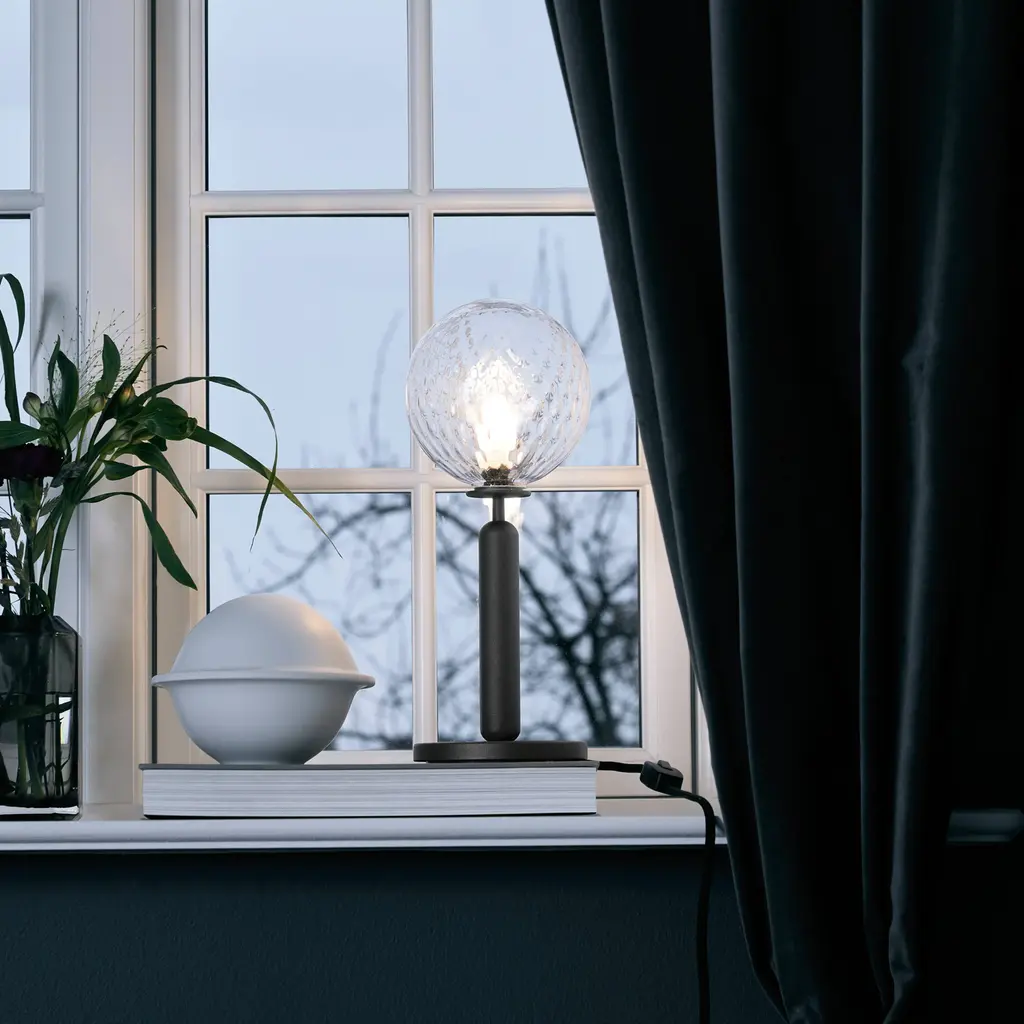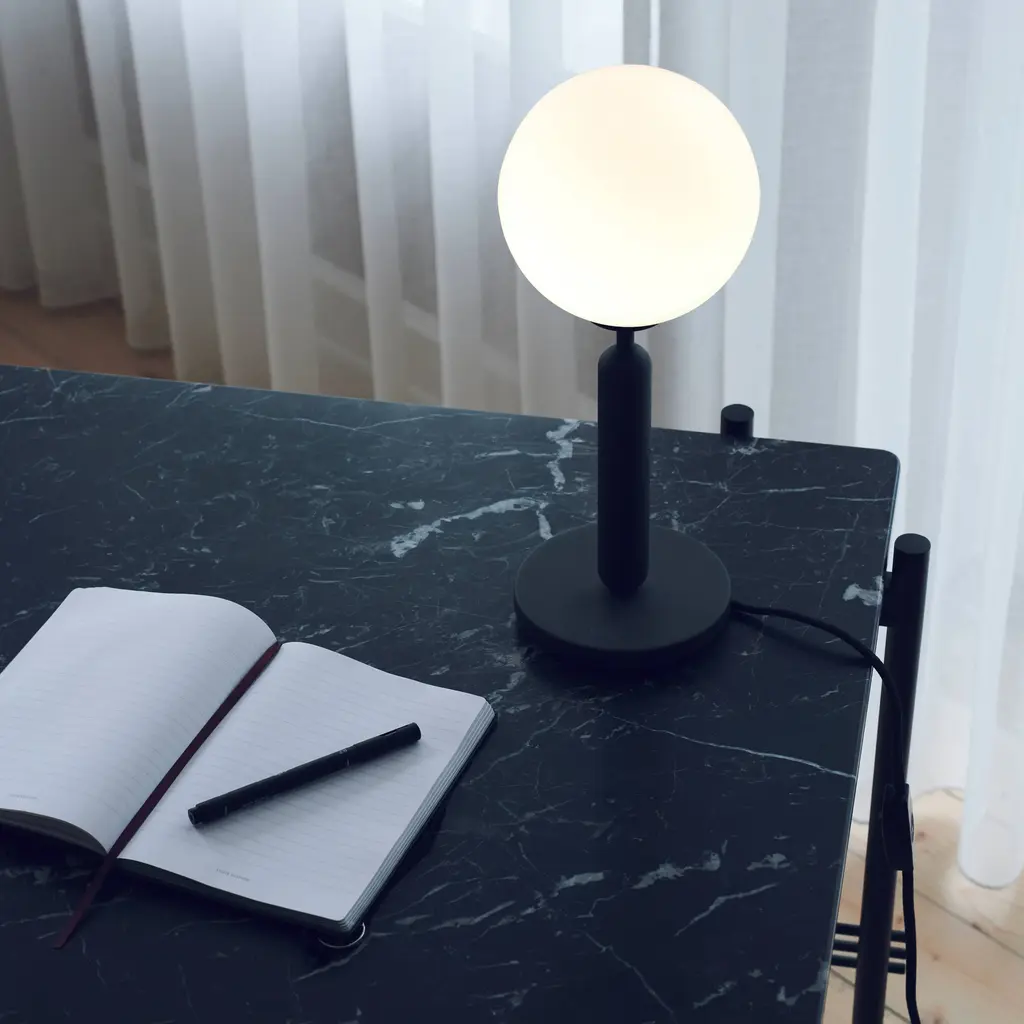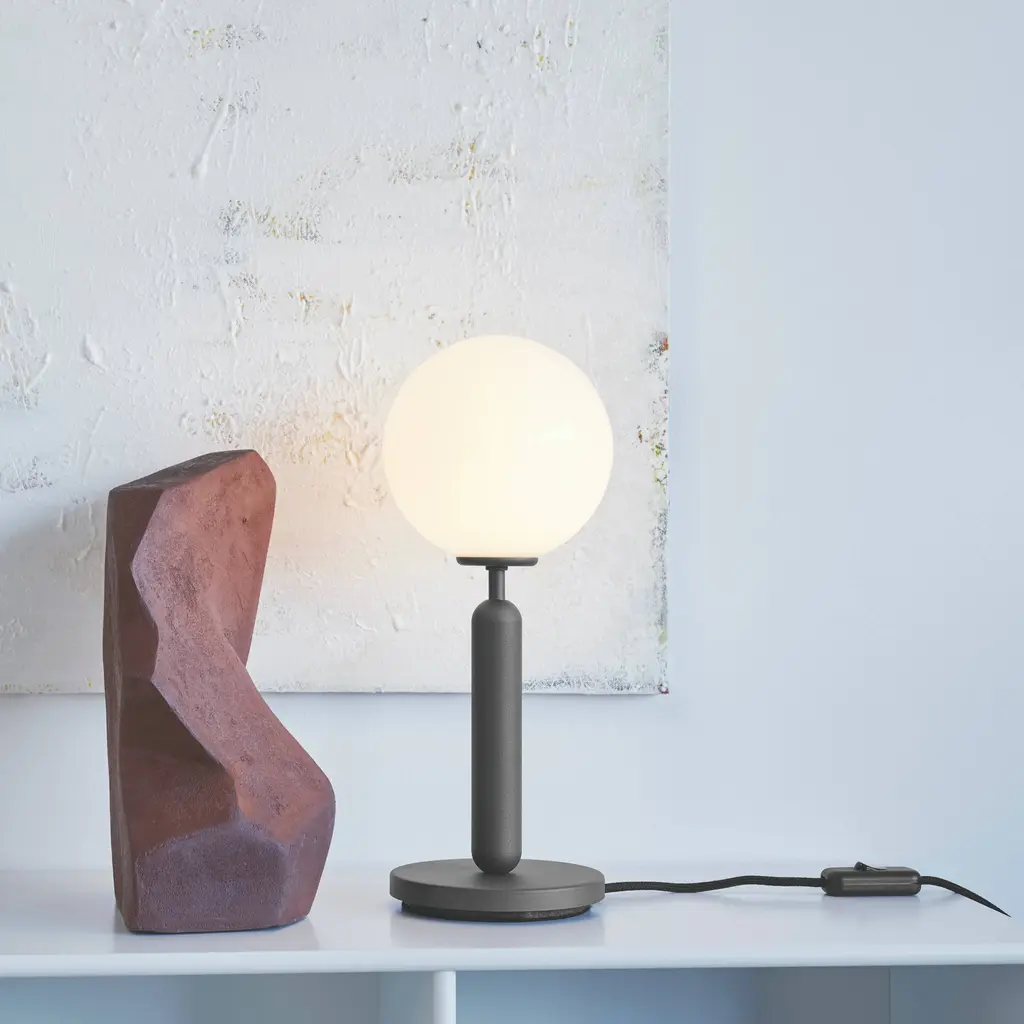 Miira's design motif–a mouth-blown globe in either milky opal glass or clear glass with a unique embossed pattern–gives essential form to this table lamp. The timeless shape embodies the Nordic sense of elegance and devotion to function adopted by award-winning Danish designer Sofie Refer of Nuura. Mounted on a a dark-grey minimal metal stand, the glowing orb's soft, even light reflects a warming vibe on its surroundings.