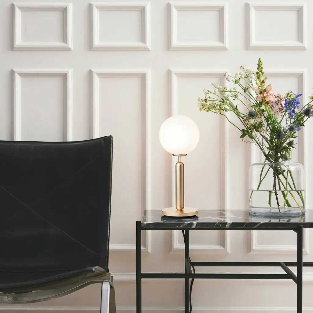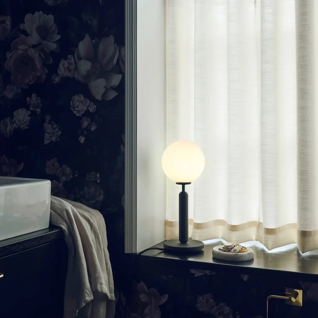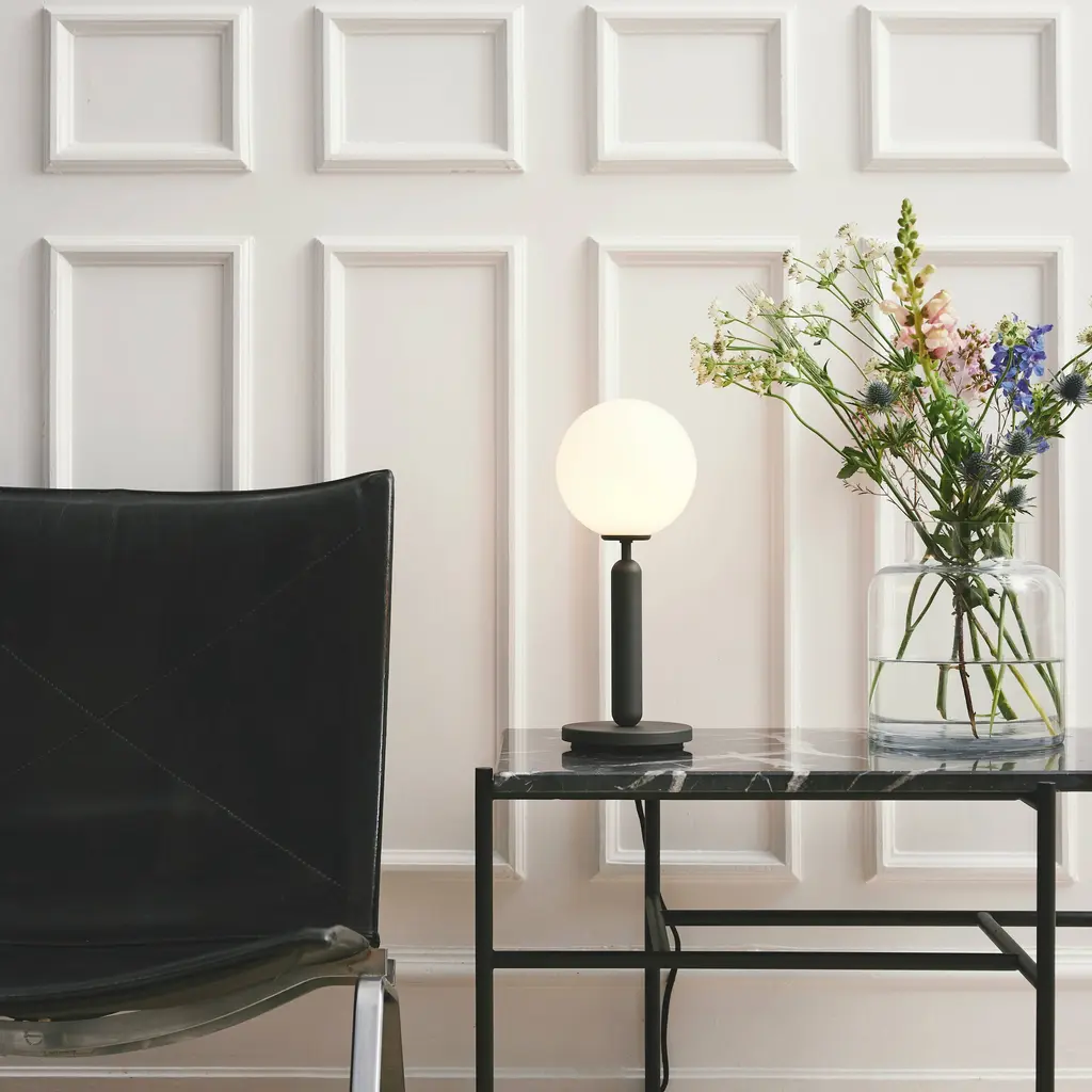 Miira's design motif–a mouth-blown globe in either milky opal glass or clear glass with a unique embossed pattern–gives essential form to this table lamp. The timeless shape embodies the Nordic sense of elegance and devotion to function adopted by award-winning Danish designer Sofie Refer of Nuura. Mounted on a a dark-grey minimal metal stand, the glowing orb's soft, even light reflects a warming vibe on its surroundings.