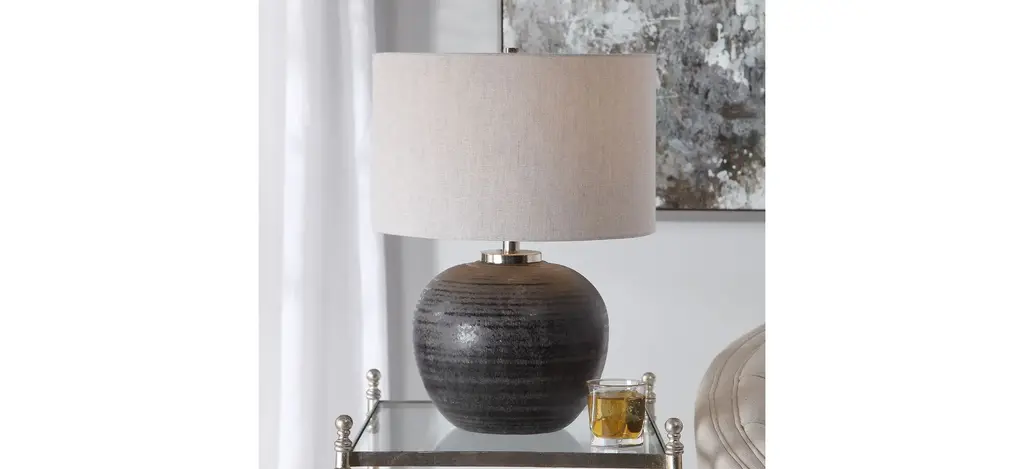 Finished in a charcoal glaze with etched texture, this table lamp adds a casual yet contemporary feel to a space. The round ceramic base is complimented by brushed nickel hardware. A round hardback drum shade in oatmeal linen completes the piece.