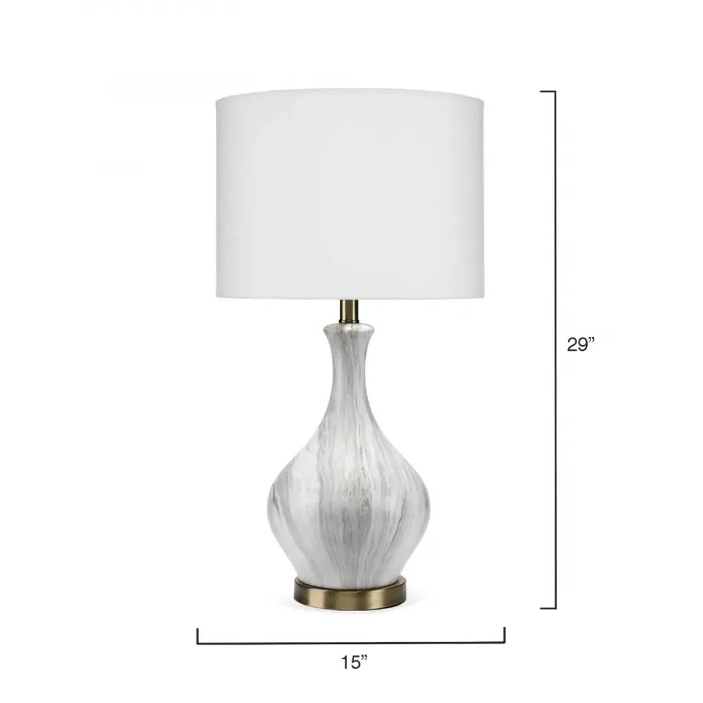 This timeless table lamp features a long necked single gourd crafted of ceramic by skilled artisans and expertly glazed to mimic the rich veining of marble. Featuring brass accents for a modern and fresh look and a linen shade to help cast a glow where you need it most.