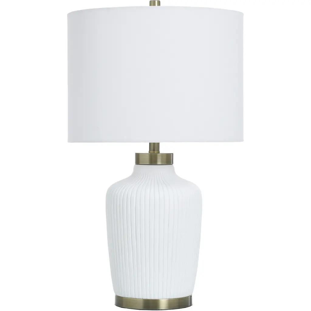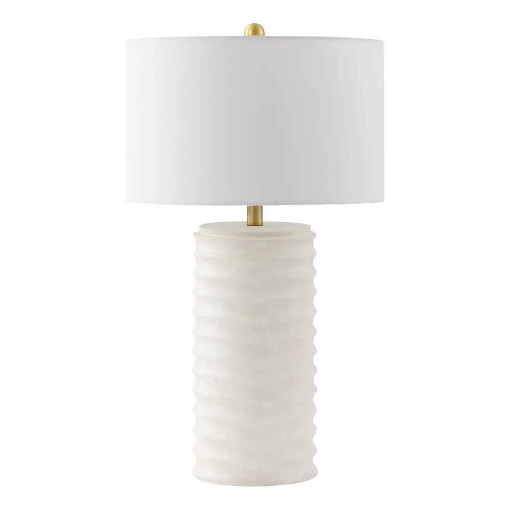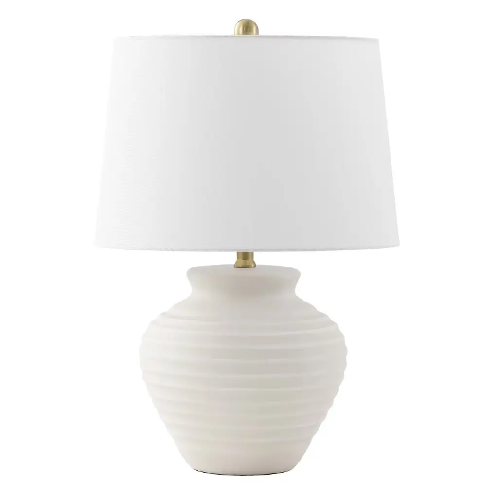 The stand out shape of this table lamp is reminiscent of early twentieth century elegance, with an abstracted twist. The Mila table lamp boasts a generous proportion in its clean linen shade. A single 100w medium base bulb provides ample illumination from the light source. Coupled with a radiant white frame to complete the look of this luminary, the Mila lamp is perfect for any modern bedroom, transitional entryway, or mid-century modern living room ensemble.