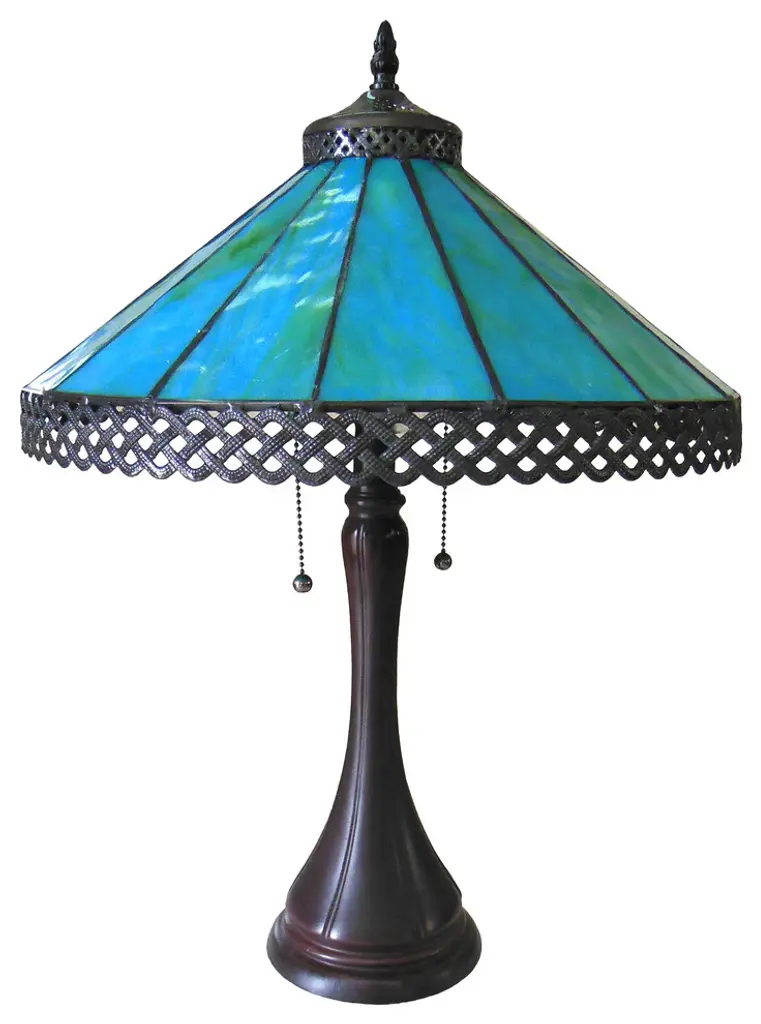 This Tiffany-style Mission design 2-light table lamp features an antique bronze finish that will complement many decors throughout your home. Hand crafted from individually hand cut pieces of copper-foiled stained glass that will add color and beauty to any space.(2) 100 Watt max E26 Type A Bulb (not included)Pull chain16pcs glass cutDownlightIndoor SettingSince these are hand crafted products, the exact color of glass pieces may vary. Colors of the glass will appear darker and less vibrant when not illuminated. Handmade glass will vary from one piece to the other; glass made at different times will also vary. Light bulbs used in lamps or ambient lighting may affect the appearance of the products. Stained glass product has been protected with mineral oil as part of the finishing process. Please use a soft dry cloth to remove any excess oil.