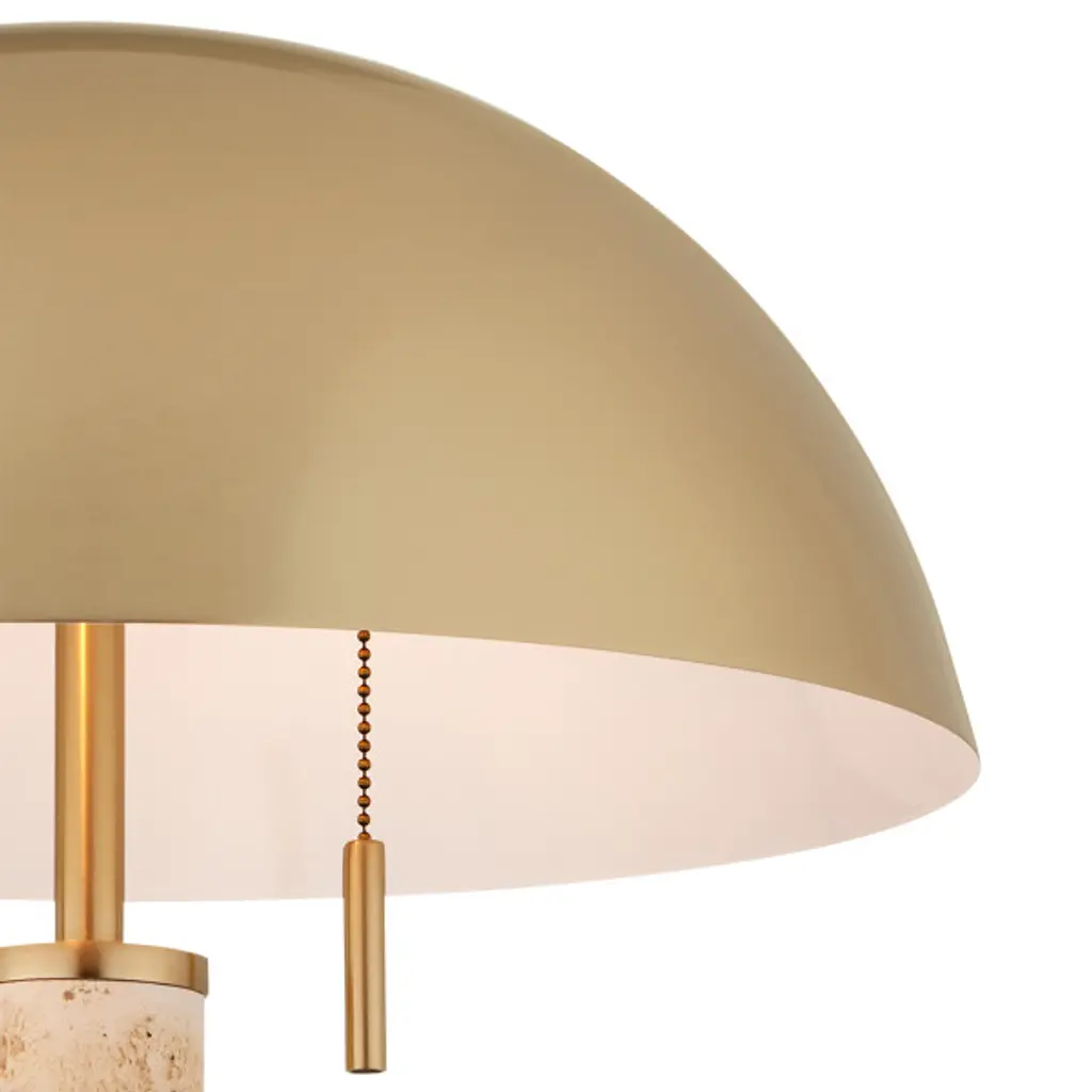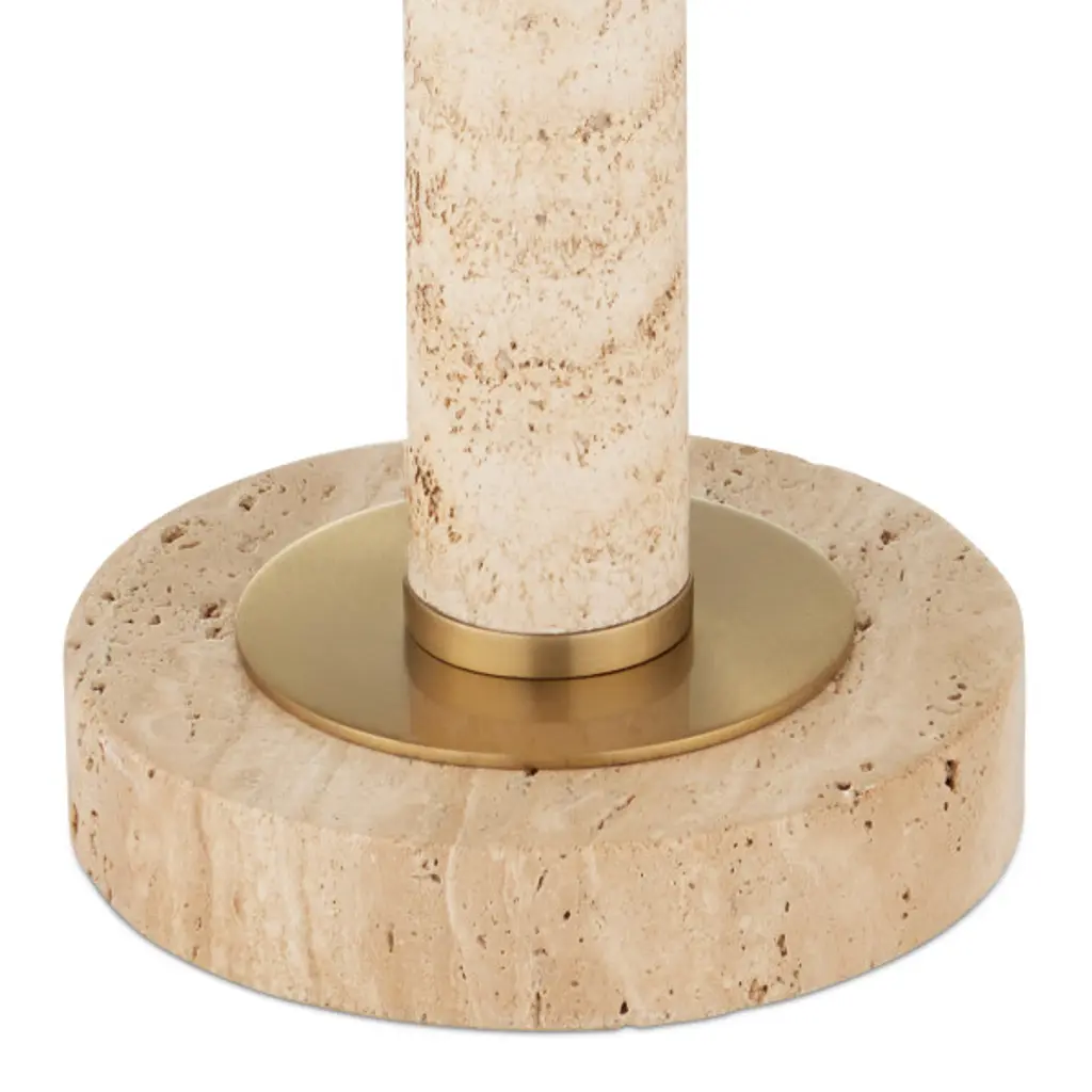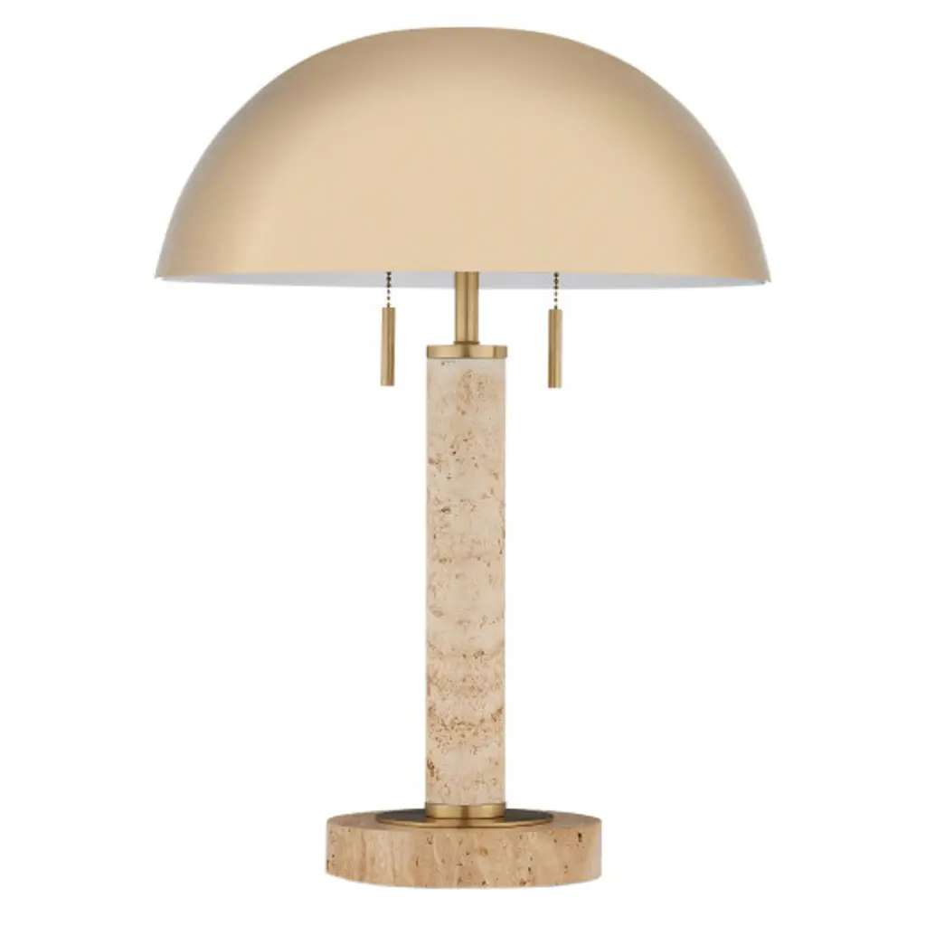 Aimee Kurzner designed the Miles Table Lamp; the travertine lamp inspired by other pieces with the same name. The mid-century modern vibe is enhanced by the simple shapes of the lamp's base and body, and the domed brass shade that caps it. Because this lamp is made of natural stone, texture and color may vary from lamp to lamp.