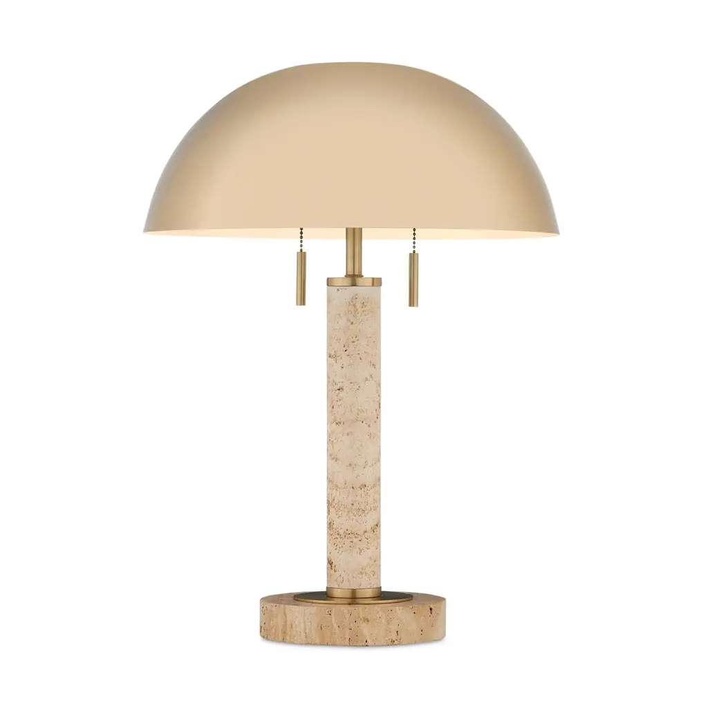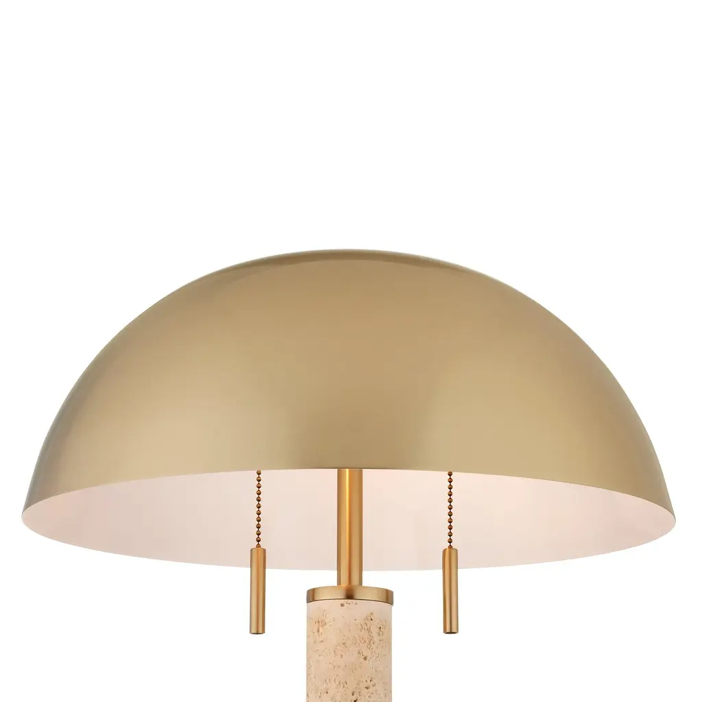 Aimee Kurzner designed the Miles Table Lamp; the travertine lamp inspired by other pieces with the same name. The mid-century modern vibe is enhanced by the simple shapes of the lamp's base and body, and the domed brass shade that caps it. Because this beige lamp is made of natural stone, texture and color may vary from lamp to lamp. Ships In 7-10 Business Days This image is for illustrative purposes only. The colors shown are accurate within the constraints of lighting, photography, and the color accuracy of your screen.