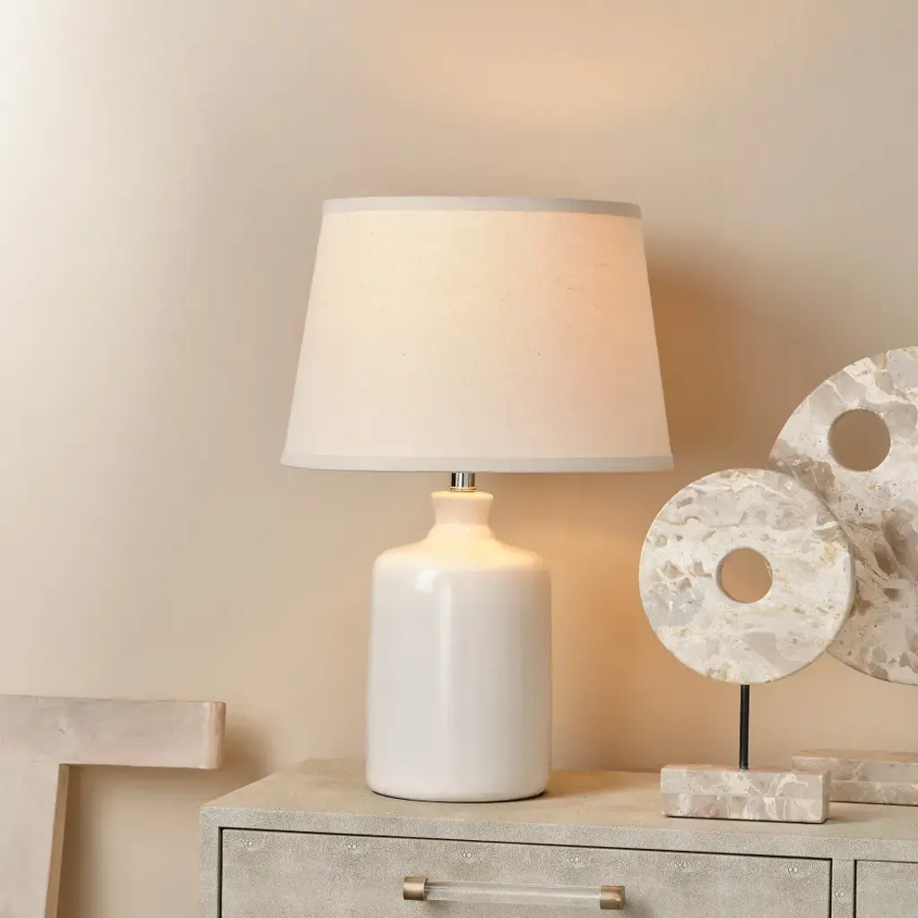 A modern and minimal approach to a time-honored design, this table lamp is the perfect transitional accent. Made of hand-blown glass in a soft neutral tone and balanced with a linen shade.