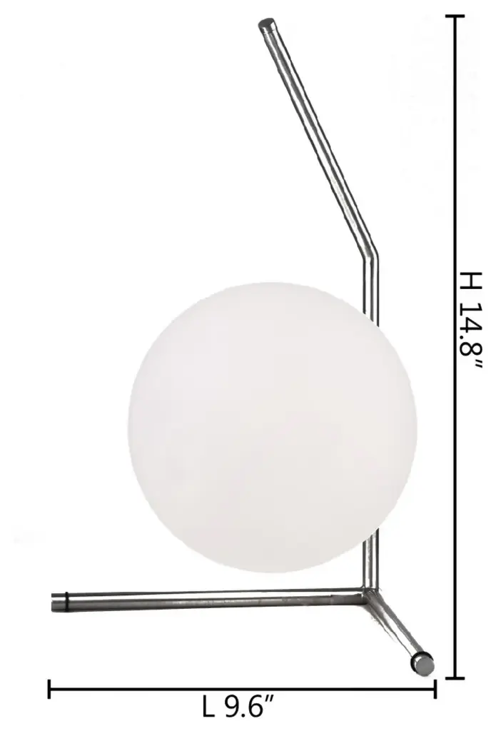 Unique, one globed table lamp with a satin nickel iron frame and milk white glass shade. It is great for chair side reading or general room illumination. Lighting Information:-Bulb type: E12 LED-Max wattage: 4-Number of bulbs: 1-Bulbs not included