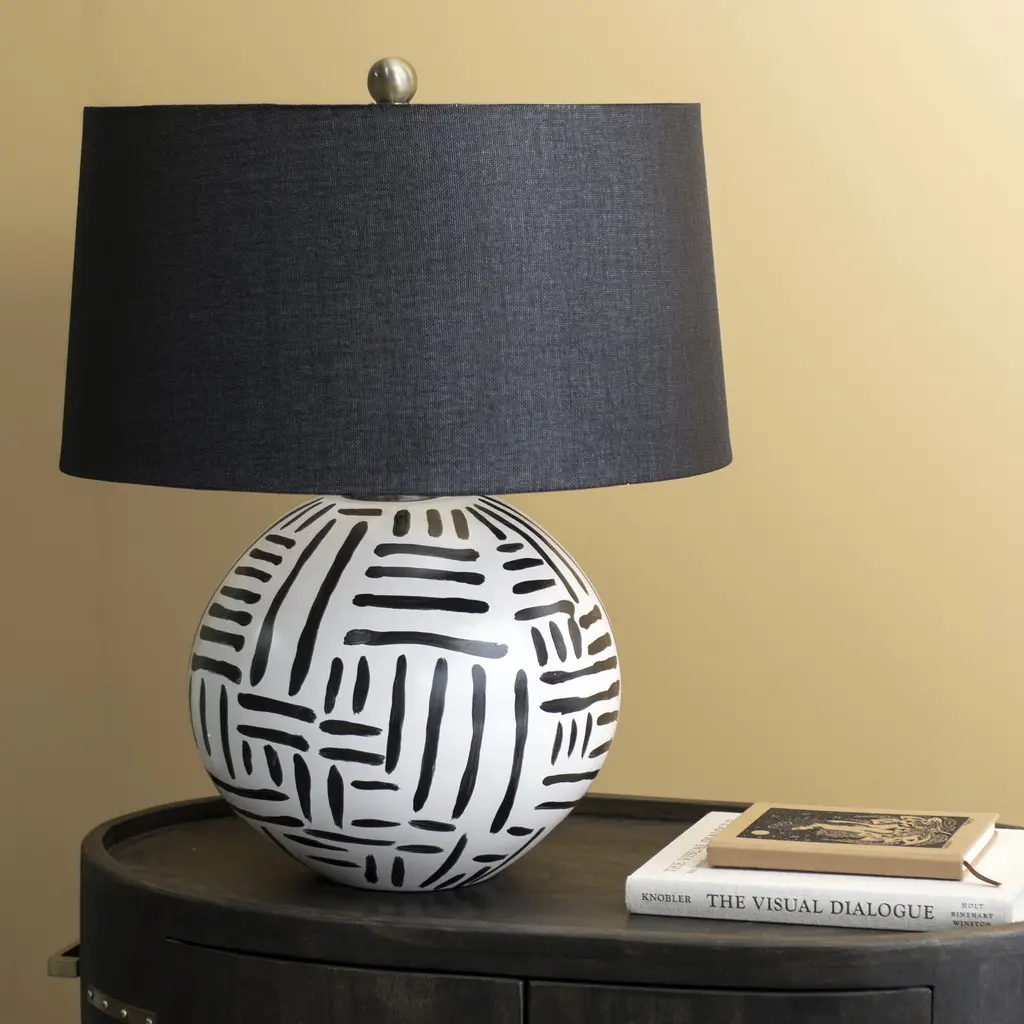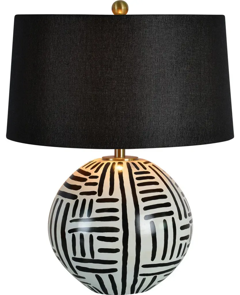 A tribal inspired black and cream ceramic base give this table lamp a well-traveled appeal. The antique brass plated iron structure elevates the black linen shade. The three-way switch allows you to control the ambiance in the room.