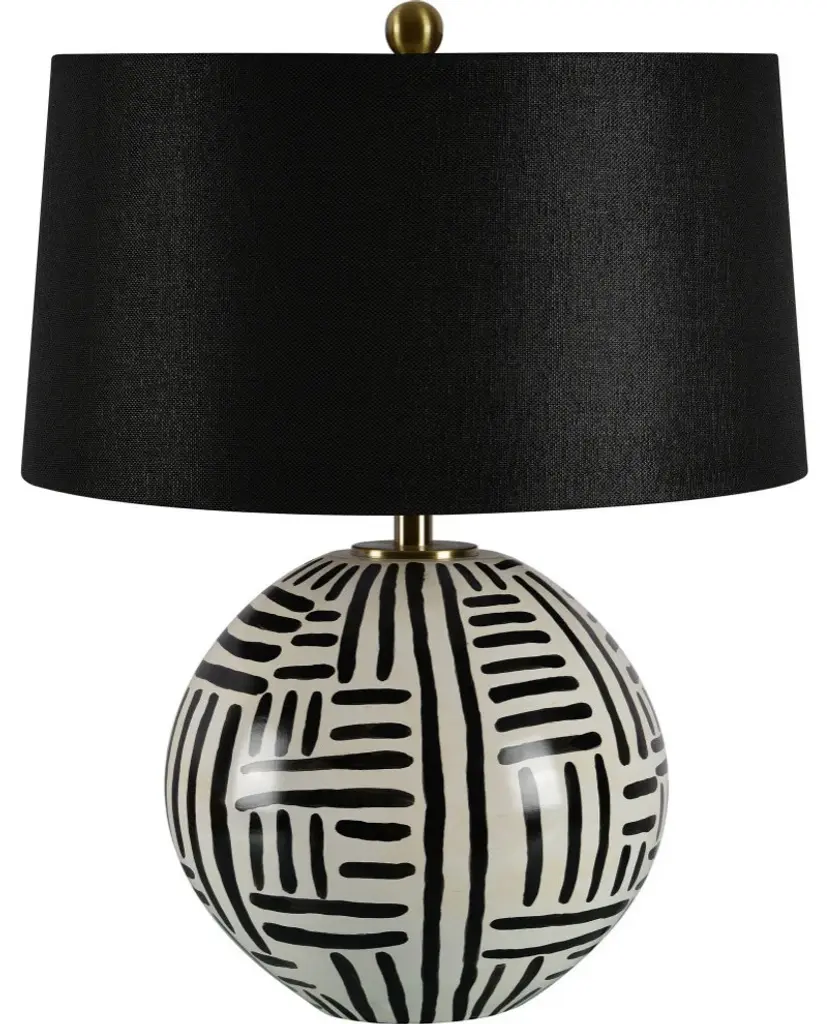 A tribal inspired black and cream ceramic base give this table lamp a well-traveled appeal. The antique brass plated iron structure elevates the black linen shade. The three-way switch allows you to control the ambiance in the room. Number of Bulbs: 1 Bulbs Included: No Bulb Wattage: 100 Bulb Type: Incandescent