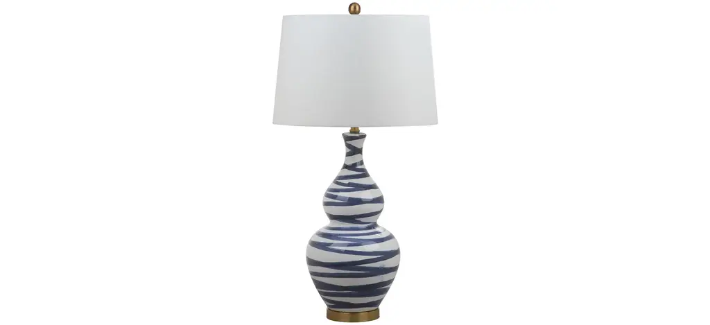 Designed by Madcap Cottage for Port 68, this double-gourd-style table lamp is crafted of porcelain and decorated with a two-tone painterly pattern reminiscent of an animal-spot print. Set on a simple base and topped with an off-white hardback shade and aged brass hardware, this lamp is sure to stand out in any space.