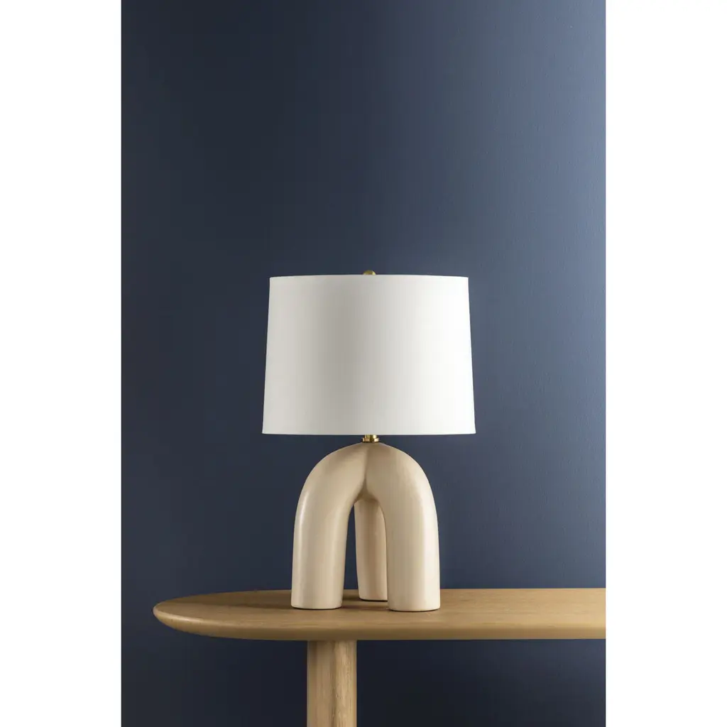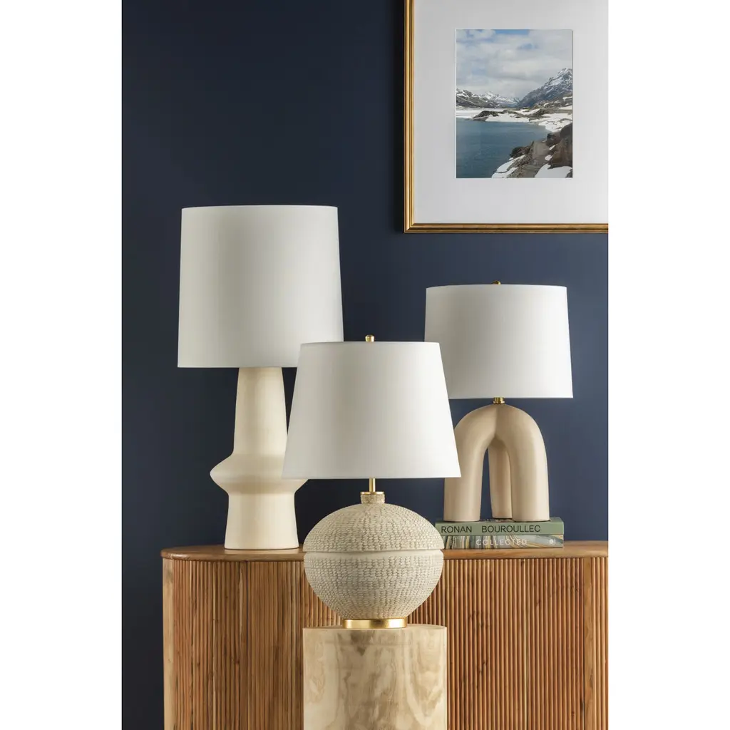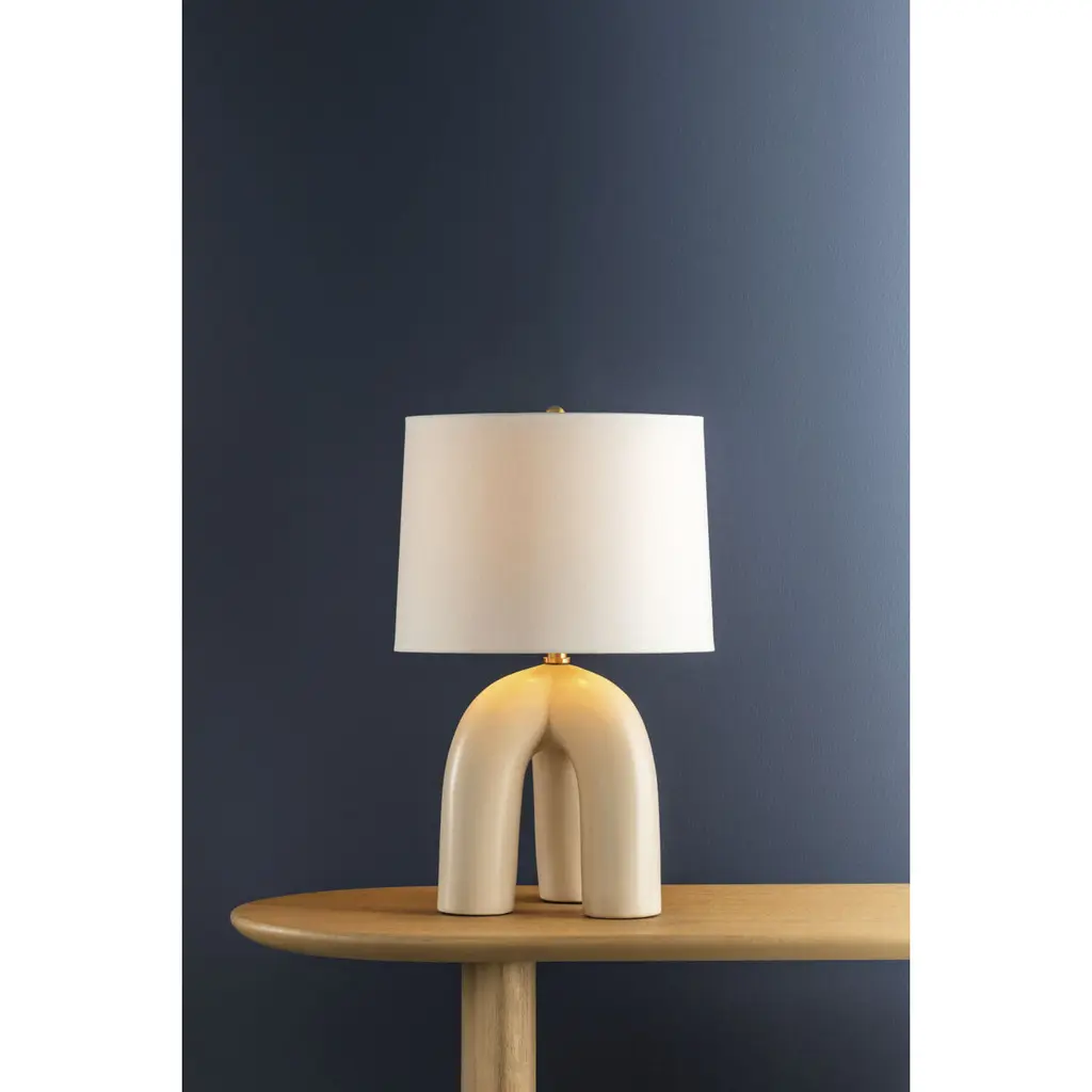 Charming and fun, Mills Pond reminds us not to take things so seriously. Three oversized tubular shapes form the tripod-like base of this delightful table lamp. A white linen shade in a similar size and shape to the base provides a soft light and a sense of balance. The aged brass finish paired with the satin ivory base adds just the right amount of subtle sophistication.