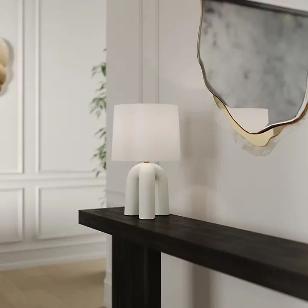 The stylish Mills Pond Table Lamp by Hudson Valley Lighting is a charming and modern look with a cool, clean approach to interior design. It's made with a tripod-style base in ceramic with a matte finish and rounded forms to complement its round Belgian linen white hardback shade. It's a fun tabletop touch that is ideal for illuminating hallways, entryways, bedroom spaces, and more. A must have for the minimalist home.
