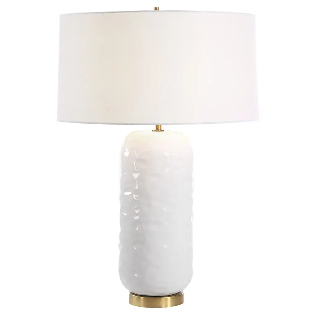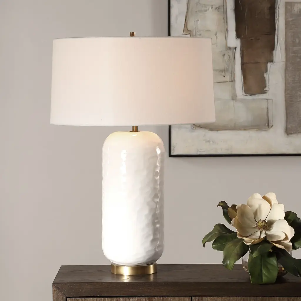 The Milo Table Lamp exudes effortless chic and versatility, making it a perfect addition to any space. Its ceramic base, adorned with a subtle texture and a pristine white glaze, is elegantly enhanced by refined brushed brass plated accents. The lamp is beautifully completed with a slightly tapered white linen fabric drum shade, creating a harmonious blend of style and function. This lamp is a testament to sophisticated design, offering a timeless appeal that complements a variety of interiors.