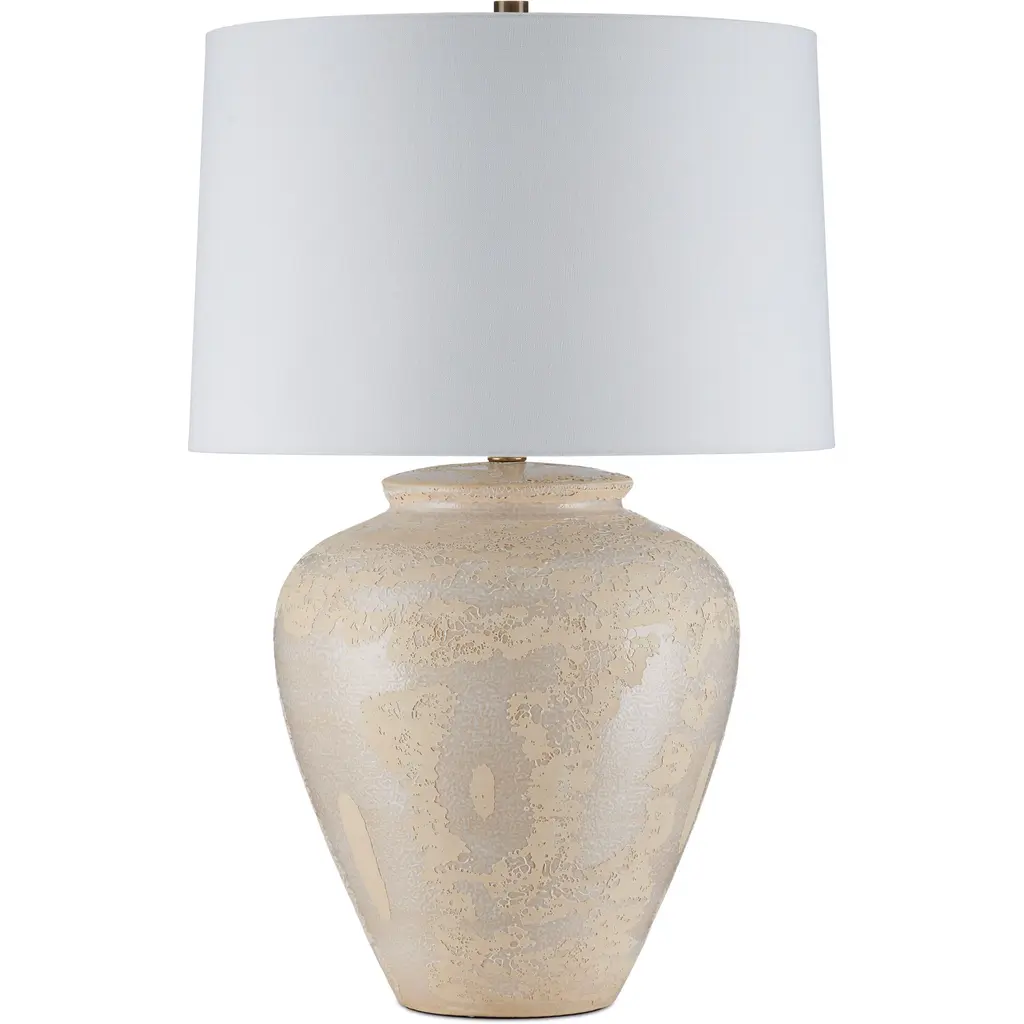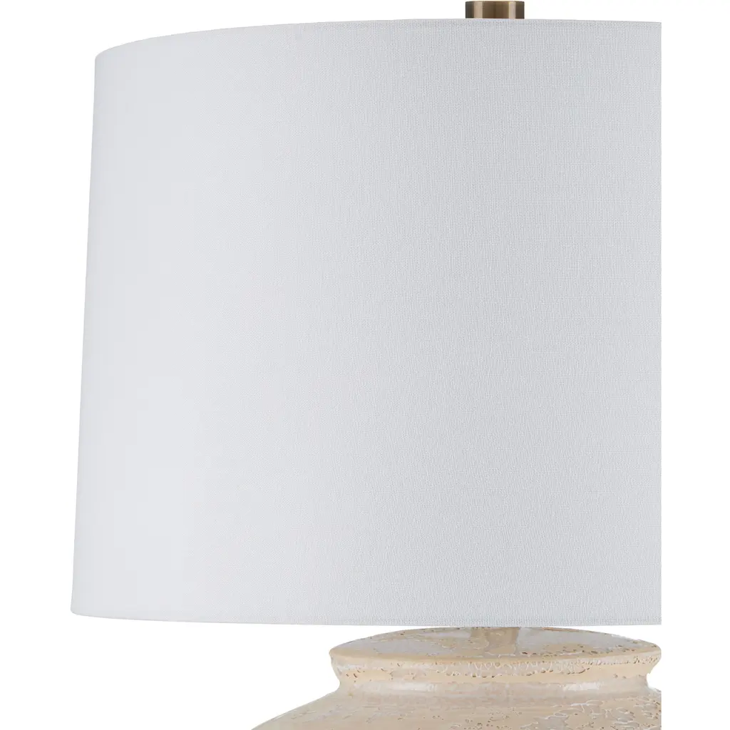 The Mimi Ivory Table Lamp is made of ceramic with a mix of ivory and cream glazing, which creates a swirling pattern to give its surface tone-on-tone depth. The ginger-jar shape of the cream-colored lamp is topped with an drum shade that echoes the pale hues in its body. The artisanal quality comes into full view when the surface of the lamp is viewed close up.
