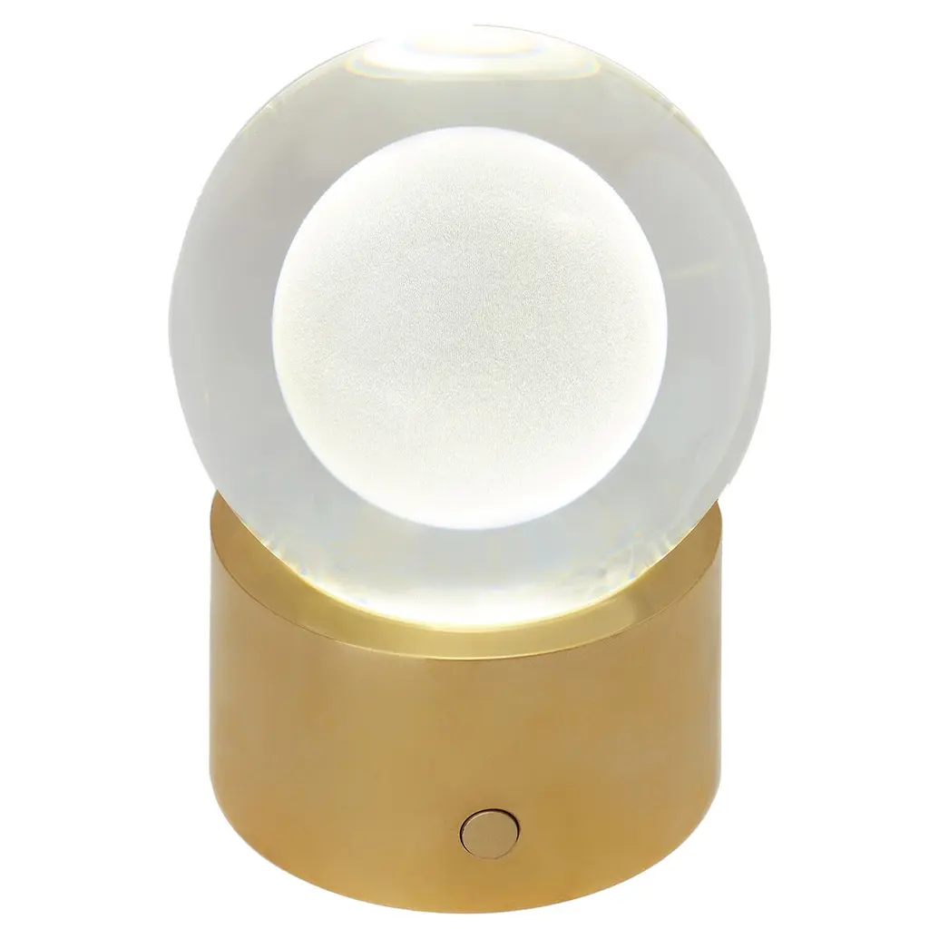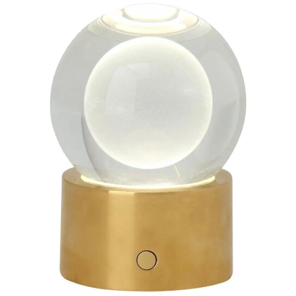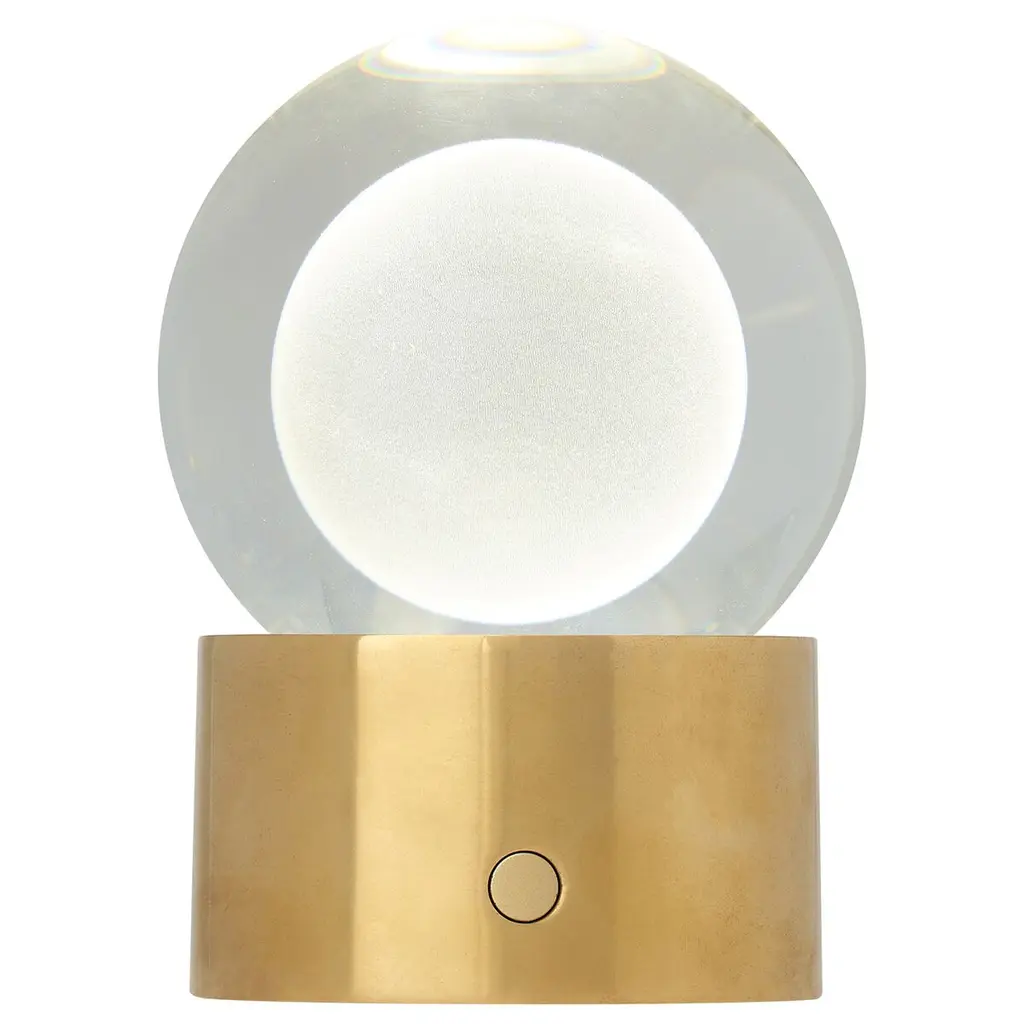 The Mina Rechargeable Table Lamp by Sean Lavin features an elegant sphere of pure optic crystal elegantly resting on a metal base. This beautiful orb is laser-etched and further illuminated by a powerful firing hidden LED, making this a glowing work of art when illuminated and modern decor when unilluminated. Available in modern finishes. It is designed with an integrated 3-step touch dimmer conveniently designed to achieve your desired ambiance. A USB C to C cable allows Mina to recharge within 5 hours with a maximum battery life fully is 12-14 hours. Wall charger included. Complete the look with coordinating Mina Wall Sconce and Line-Voltage Pendants.