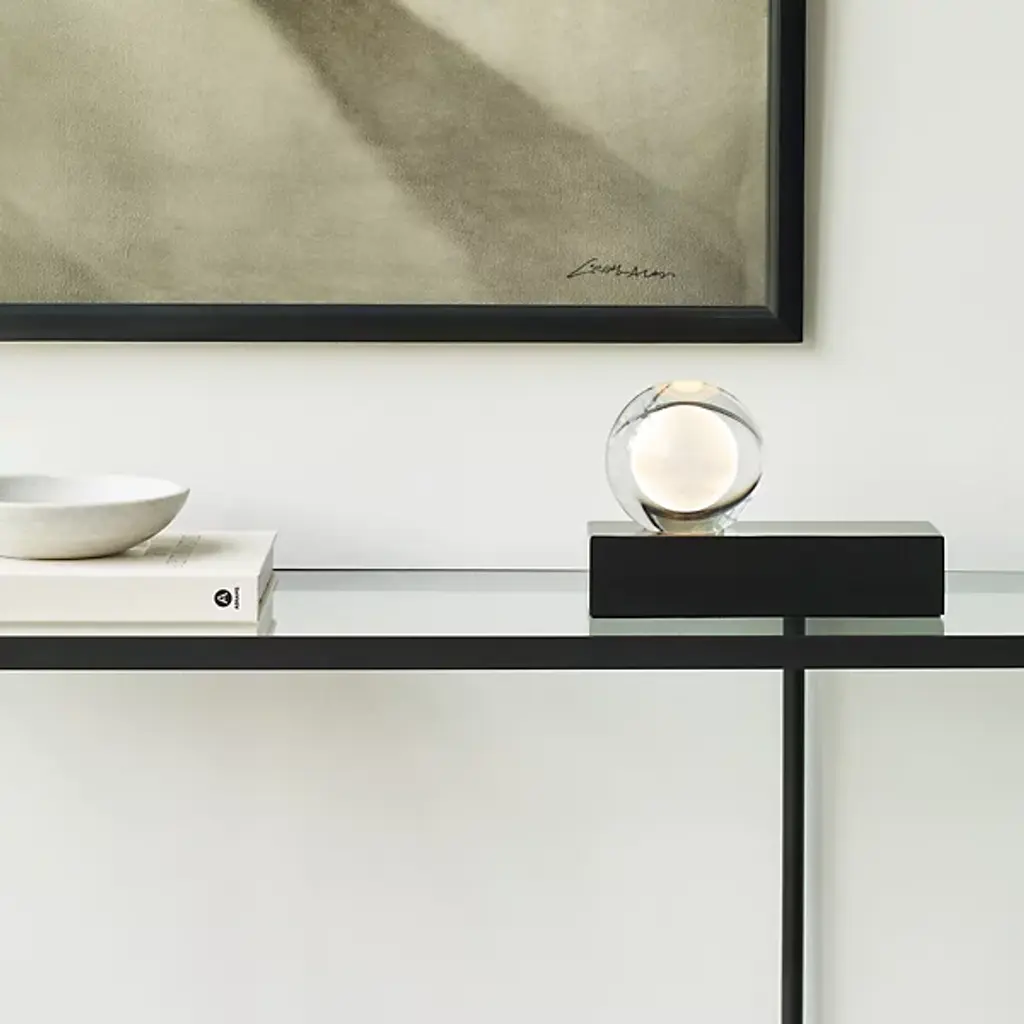 Bring minimalist magic to your side and end table with the Mina LED Table Lamp from Visual Comfort Modern, formerly known as Tech Lighting, It's a sophisticated piece complementing the clean features of your modern architecture through sleek geometry. Lay its sharp-edged rectangular base over your table surface and watch as it gives a pedestal-like effect for the stunning globe on top. Laser-etched in crystal glass, its seductive sphere chooses a side on the base in a sculptural silhouette. Turn it on and feel the magic as LED highlights wrap across the crystal in an ambient glow.