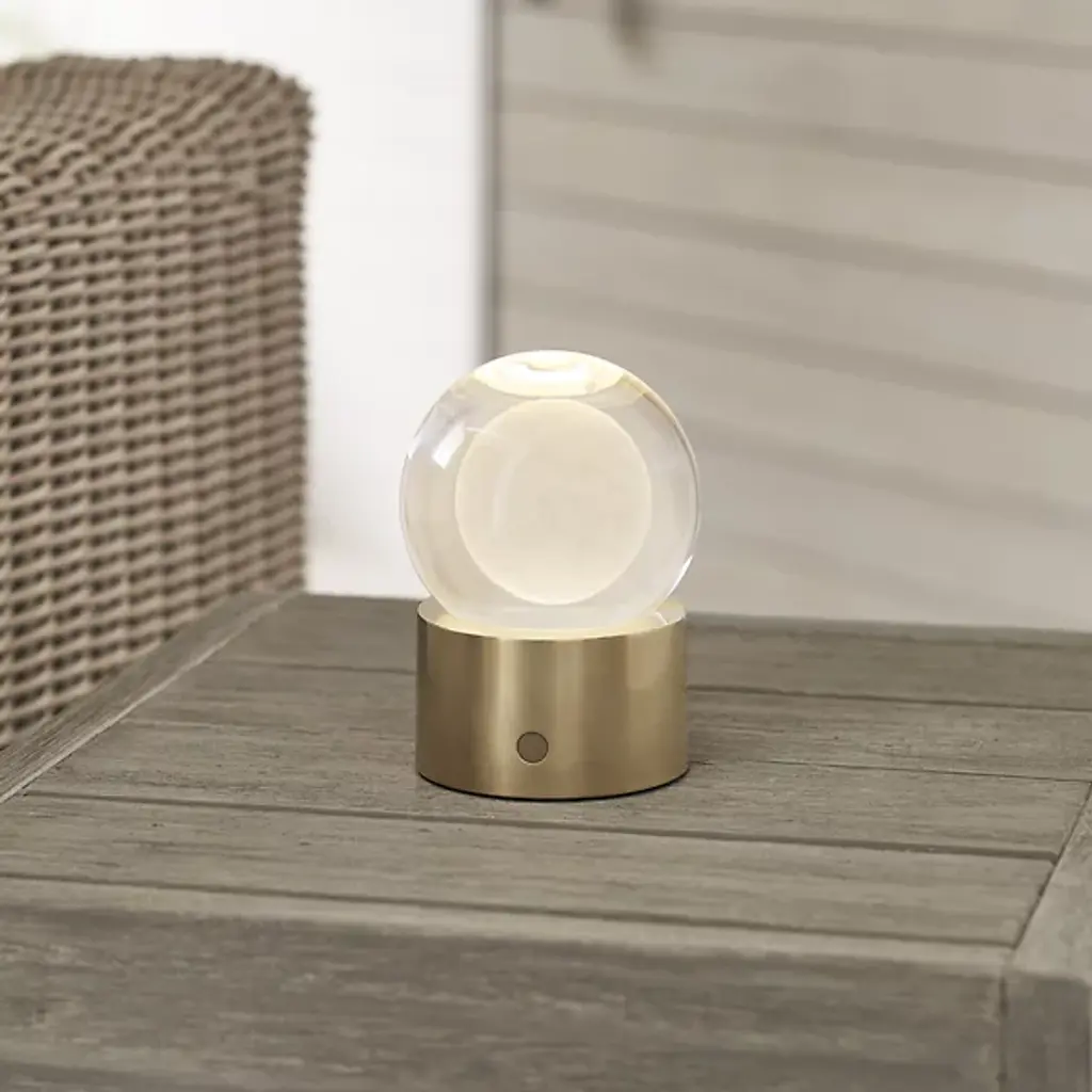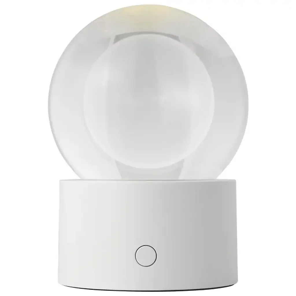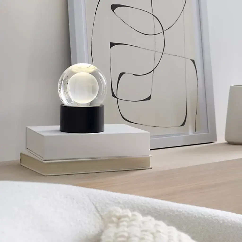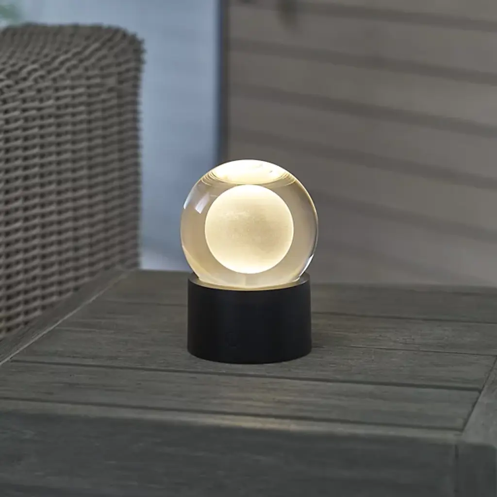 Behold the Mina Rechargeable LED Table Lamp from Visual Comfort Modern, a creation of Sean Lavin that exudes timeless elegance. Its exquisite sphere, crafted from pure optic crystal, rests gracefully upon a sleek metal base. Enhanced with laser-etched detailing and powered by a concealed LED, this lamp transforms into a radiant masterpiece when lit, casting a mesmerizing glow. Even when unilluminated, its modern design adds a touch of sophistication to any space, making it a stunning addition to contemporary decor.