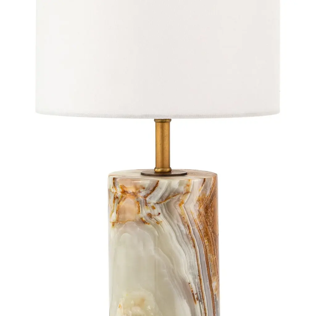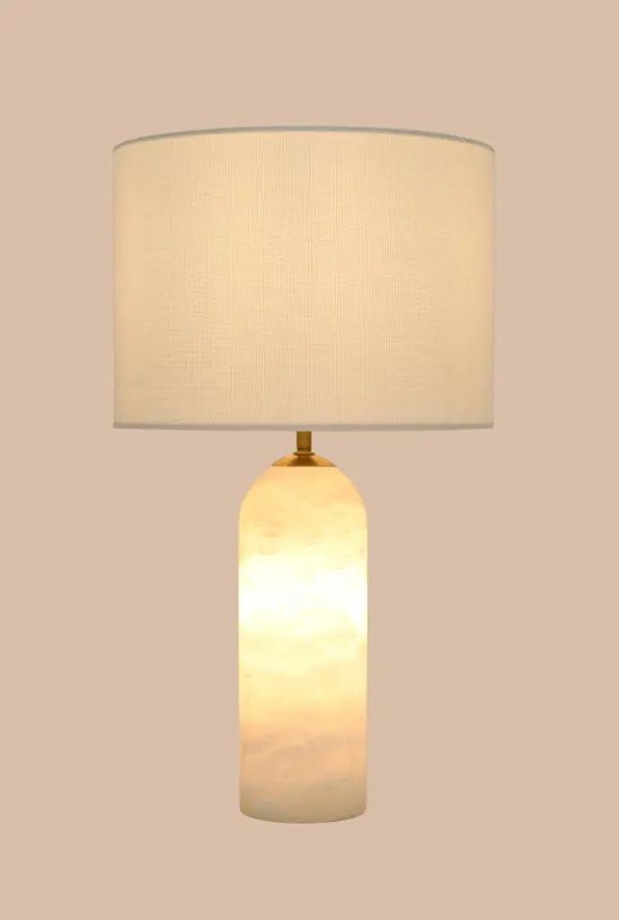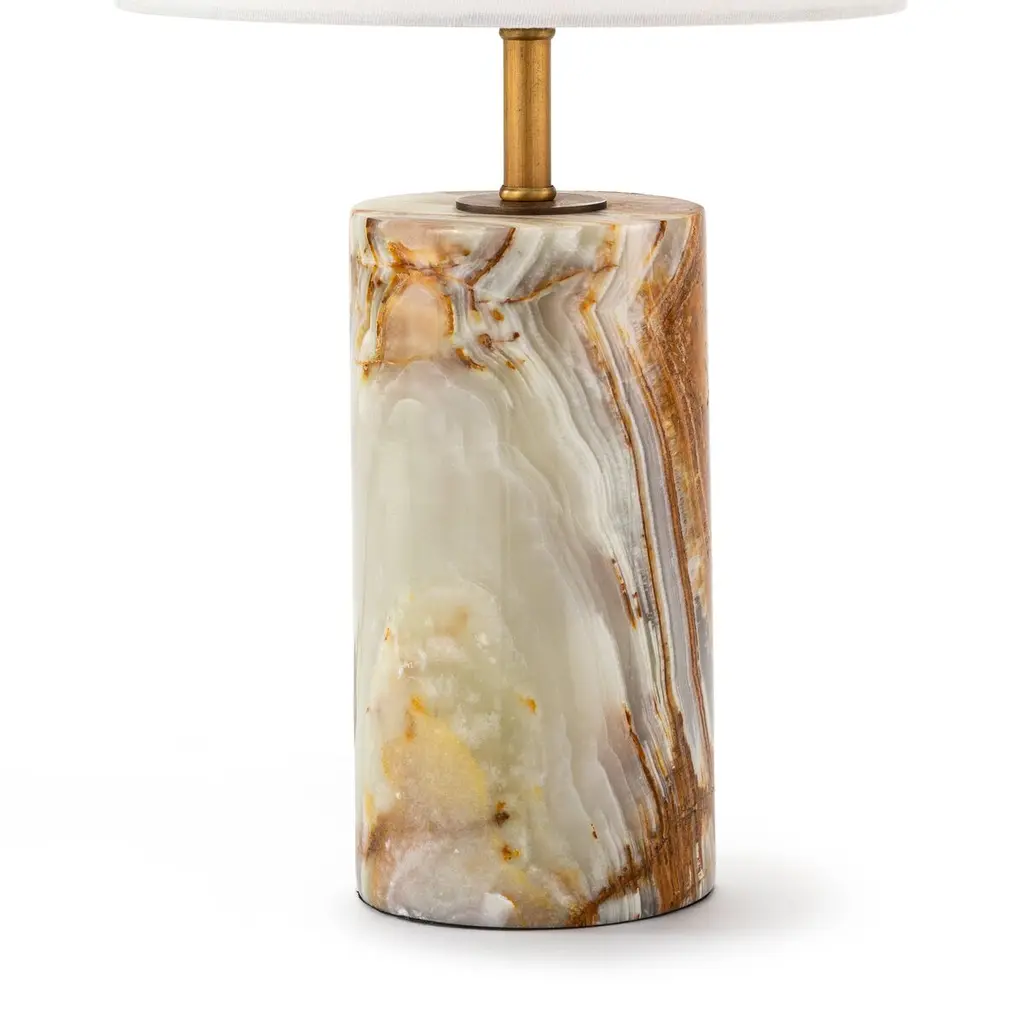 An amulet of good luck and friendship, this slender table lamp stands tall with a cylindrical jade body. A linen barrel shade casts a bright, even glow from above.