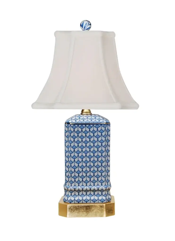 A cheerful and sophisticated green and white or blue and white porcelain lamp with a matching finial and rectangular-oval, off-white shade. This mini lamp in a classic pattern is sure to elevate any space!