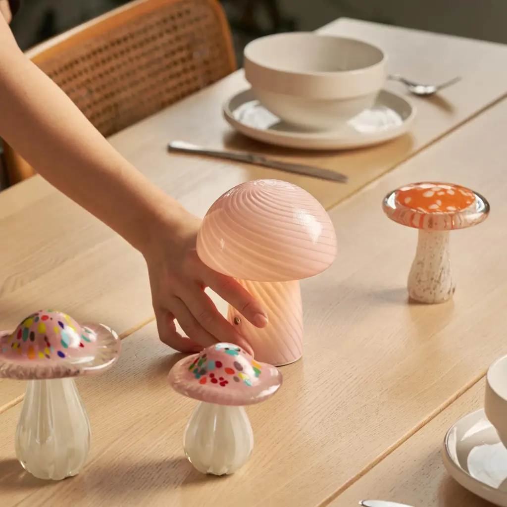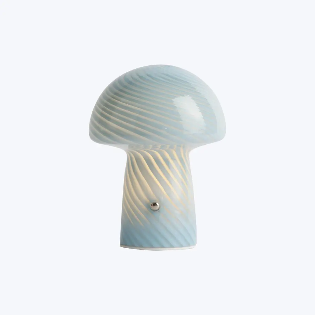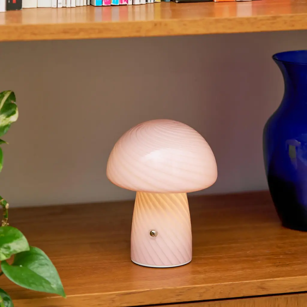 Inspired by vintage mid-century modern Murano lamps, the Mini Mushroom Portable Lamp brings a charming and comforting glow wherever you go. Hand-blown in a swirling glass pattern, this mushroom glow lamp adds a delightful touch to your colorful décor or chic modern aesthetic. With a playful design, this lamp is a must-have for any mycologist or fungi-obsessed friend. Available in five eye-catching colors: Pink, Blue, Butter, White, and Green. This portable mushroom lamp is powered by high-efficiency lithium-ion batteries and offers two levels of brightness that can be easily adjusted with a touch button dimmer. Using the included USB Type-C cable, it takes just 4 hours to fully charge, providing up to 12 hours of radiant light at its brightest setting (adapter not included).Please note that the mushroom portable lamp emits a gentle 0.5W LED glow, perfect for creating a cozy atmosphere in intimate spaces. Ideal for adding ambiance rather than extensive room lighting, it provides a soft, subtle glow perfect for relaxation and creating a warm mood.