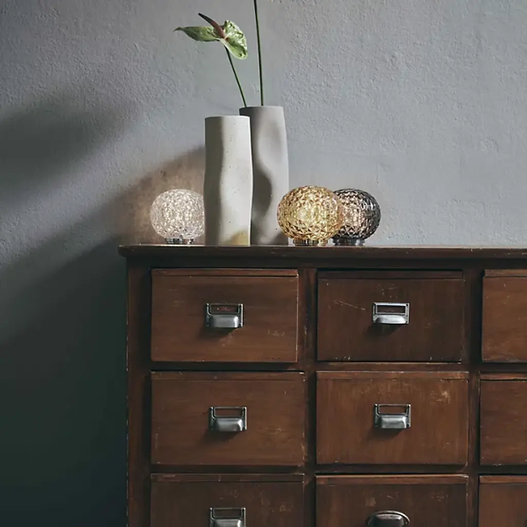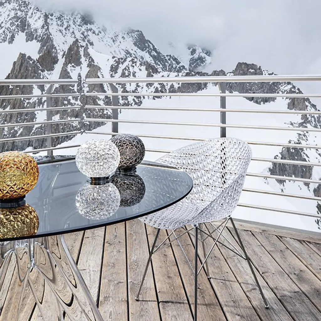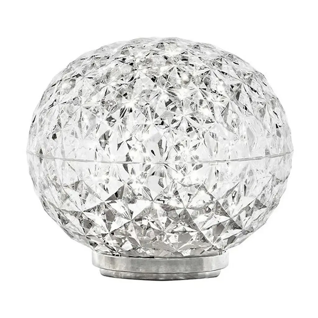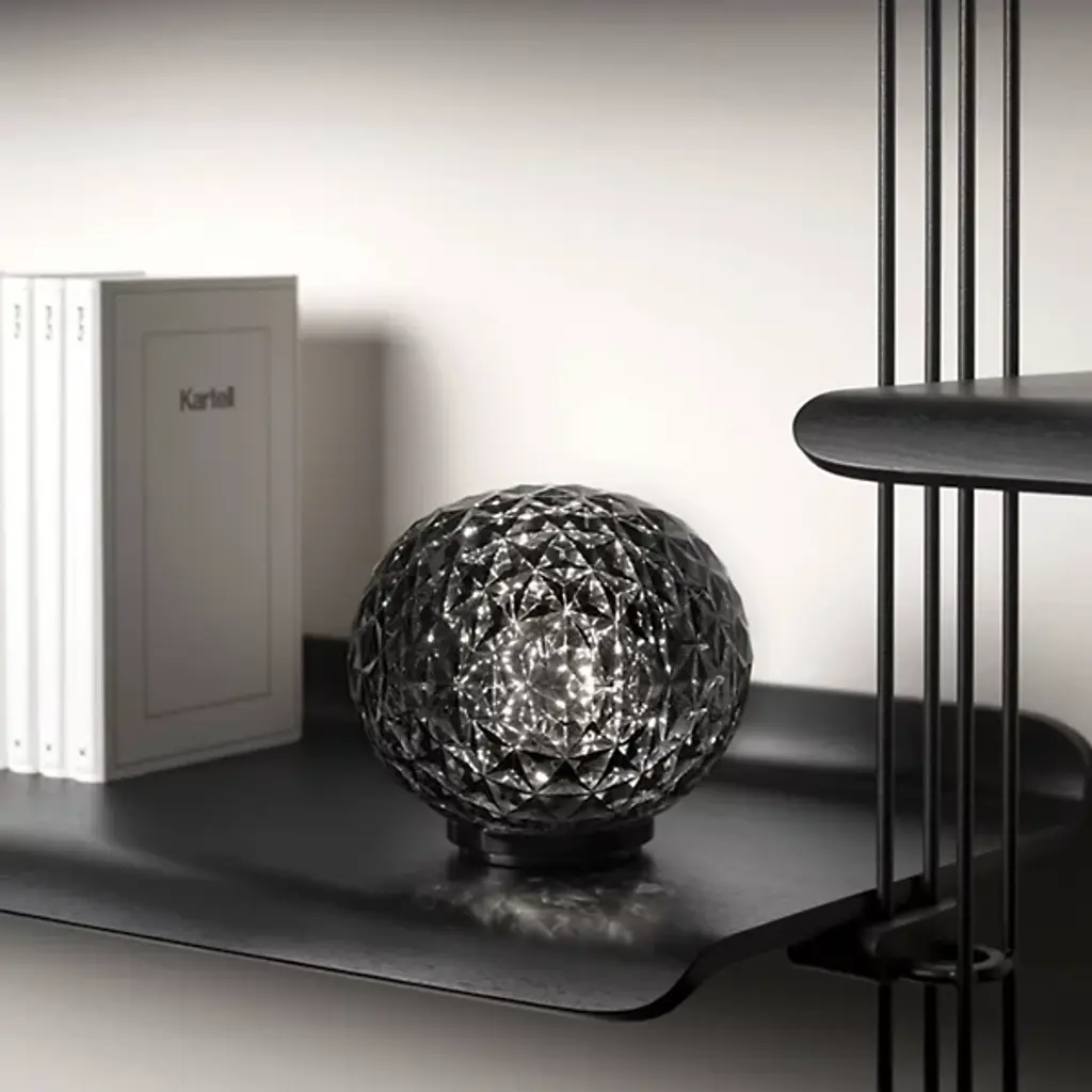 Elegant and otherworldly. The Mini Planet LED Table Lamp from Kartell awes with the bright sun coming through or at night when lit as a riveting, reflective globe. This techno polymer table lamp reflects renowned designer Tokujin Yoshioka’s process of combining sophisticated materials with technological experimentation. Yoshioka presents the thermo-plastic with a bevy of sharp facets in a globe form. A low-key metal structure elevates the globe with a floating quality. Lamping hidden inside touches up the planet-like diffuser with starry highlights. The light exits as an intimate ambient glow. The lamp’s awe-inspiring visuals underscore Yoshioka’s aim of stirring one’s imagination with a dream-like image.