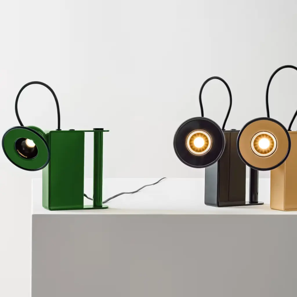 The table-top Minibox is comprised of a metal body, a comfortable handle, and an irreverent luminous eye, which recalls the aesthetics of a miners’ lamp. The magnetic attachment of the head allows the light to be directed, rendering it suitable for any location, even the most unexpected. Metal body and directable head with magnetic coupling. Single emission table lamps for indoor application. The device body is made of metal and features a black finish, processed by means of coating.