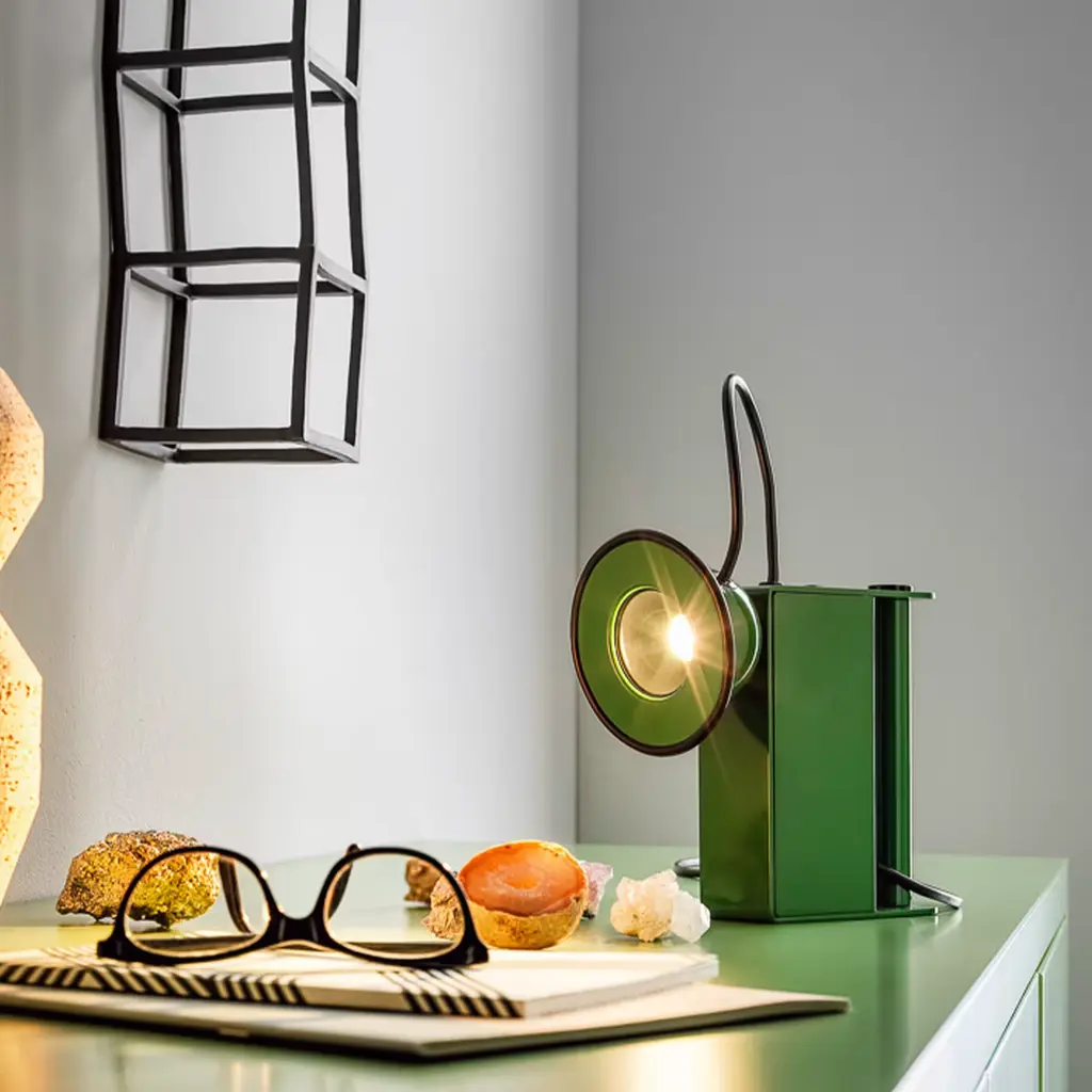 The table-top Minibox is comprised of a metal body, a comfortable handle, and an irreverent luminous eye, which recalls the aesthetics of a miners’ lamp. The magnetic attachment of the head allows the light to be directed, rendering it suitable for any location, even the most unexpected. Metal body and directable head with magnetic coupling. Single emission table lamps for indoor application. The device body is made of metal and features a green finish, processed by means of coating.